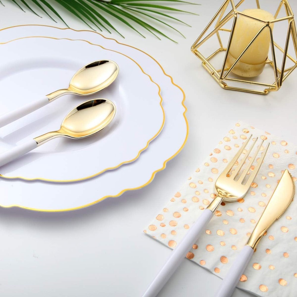 Healthy & Durable: Our unique manufacturing process forges durable gold disposable silverware that resists breaking, bending and snapping even when meat is served! All gold cutlery are made of 100% food grade, non-toxic, BPA-free plastic. High-End: Feast your senses with the premium feel of this white gold disposable flatware especially designed to provide that proper comfort when using them to handle your food while maintaining sturdiness fit for their function. A Great Pack of Flatware for Any Home: Get elegant and easy-to-use cutlery for your home or present the lovely gift of style to any other home for housewarming or other occasion – our silverware works great for everyday use. Occasions: Shinning gold plastic flatware matched white handle adds some style and elegance to your Dinner,Mother's day, Birthday Party, Wedding, Christmas, Thanksgiving, New Years Eve and every occasions. Our gold disposable cutlery turning your party into a glamorous affair. What's Include: Christmas gold plastic utensils includes 48 gold plastic forks, 48 gold plastic spoons, 48 gold plastic knives. Ideal for parties big or small.