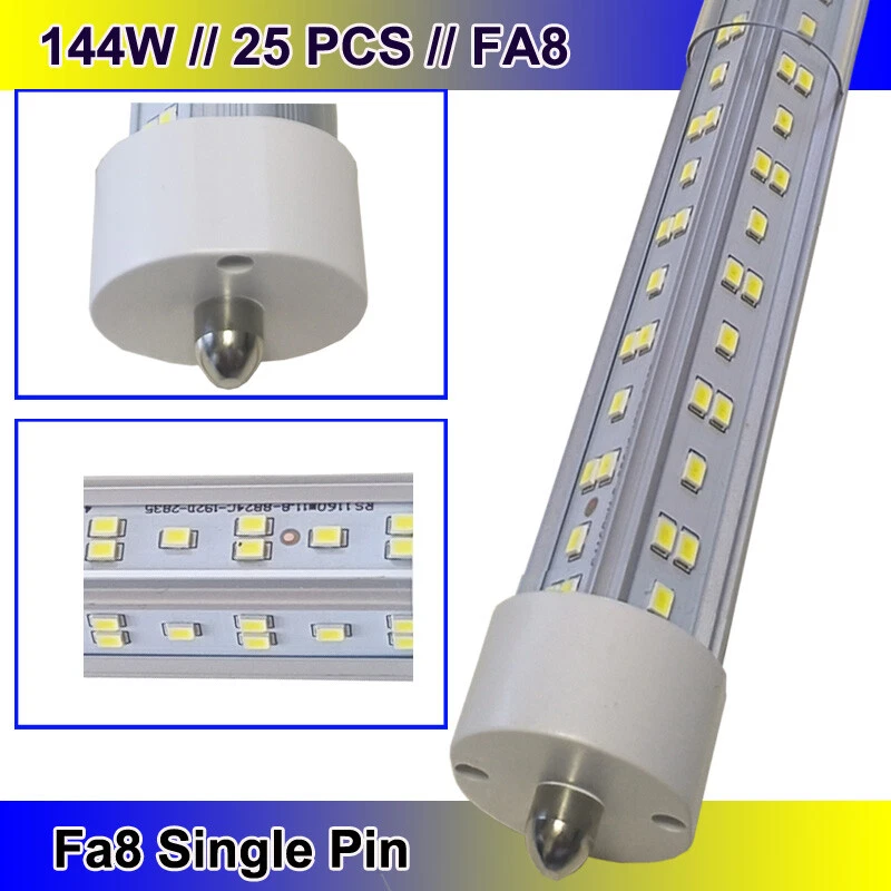 FAST DELIVERY - Ship from New Jersey or Los Angeles Warehouse via FedEx , 3-7 Days Delivered Your Door . SCIENTIFIC DESIGN - 8Ft LED Shop Lights Fixture is Made of 6500K Cold White SMD2835 LED Chip ,Plastic Clear Cover , Aluminum Bracket Housing ,and AC85-277V Constant Current Driver . It can work in -68F to 120F Temperature Conditions EASY INSTALLATION - The Integrated Tube Fixture Can be Install on Wall or Ceiling ,Easily Replace Traditional Fluorescent Tube Bulb . Plug and Play , Free Accessories (Power Cords, Connector , Extension Cords , Clip and Screw ) Come with Tube Lights Together WIDE APPLICATION - Linkable 8Ft Bulbs Widely Used in Garage Ceiling , Barbershop , Schools, Hospitals Basement , Factory Warehouses , Supermarkets Cooler Door , Offices, Shops,Hotels, etc 144W 8FT T8 LED Shop Light 8' Led Bulbs FA8 Single Pin LED Tube Light 25PACK 【No RF & FM Interference】LED Driver have passed Electromagnetic Magnetic Compatibility EMC tests,No cause EMI ,No longer subject to any RF & FM jamming. Never interfering with the signal of your garage roller shutter door,No make noise when you listen radio 【Easy to Install】Just simply bypass the ballast and connection AC85-277V AC power . Not compatible with single-ended powered sockets 【Wide Application】 - 8Ft 144W V Shaped FA8 HO LED Bulb fitted to replace traditional F96T12 T8 T10 T12 fluorescent bulbs. Widely used in Garage,supermarkets, offices , convenience stores , gas stations , warehouse,parking lot,shops, hotels,Refrigerator,coolers or freezers illumination,etc 【High Output】8Ft 144W 18000LM FA8 【Rotate Cap & Swivel End】 Easy Adjust rotated Lighting Direction within 180 degree after Installation