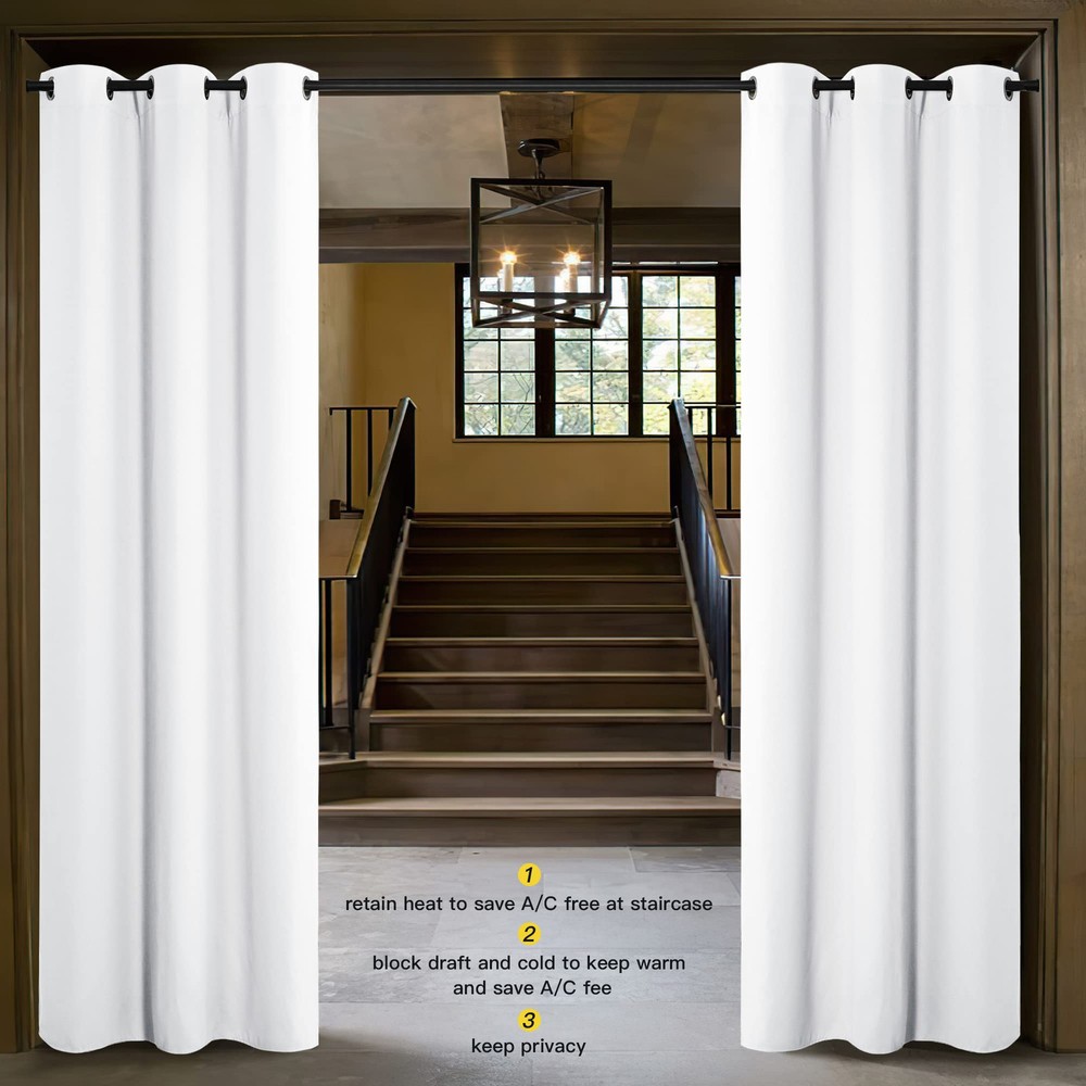 Grommet Blackout Divider Cutains CURTAIN DETAILS: The room divider curtain's fabric is super soft, thickness and heavy innovative triple-weave polyester fabric. The silver grommets top (inner diameter is 1.6-inch) adds a modern touch and easy hanging. ONLY CURTAIN INCLUDE. SPACE SOLUTION: Curtains can be a clever and temporary solution for creating new spaces without building walls. You can still let in light if and when you choose, making them a perfect choice to allow flexibility in a small space. MULTIPLE FUNCTION: Just draw ROOM DIVIDER CURTAINS shut when either side needs privacy, body shape behind them. Besides, heavy curtains can be more effective than doors for soundproof, as the material absorbs rather than bounces the sound. PORTABLE & SUITABLE: Room divider curtains are easily installed and easily packed up, moved, and reused! Perfect for City Loft, Office Space, Shared Bedroom, High Ceilings, Factories, Hospitals, Studio, Dorm, Storage Space, Cafes, hotels, etc. CARE INSTRUCTION: Good quality finishing will withstand years of use. Wash the water temperature below 86F. Mild detergent no bleaching. Low-temperature ironing.