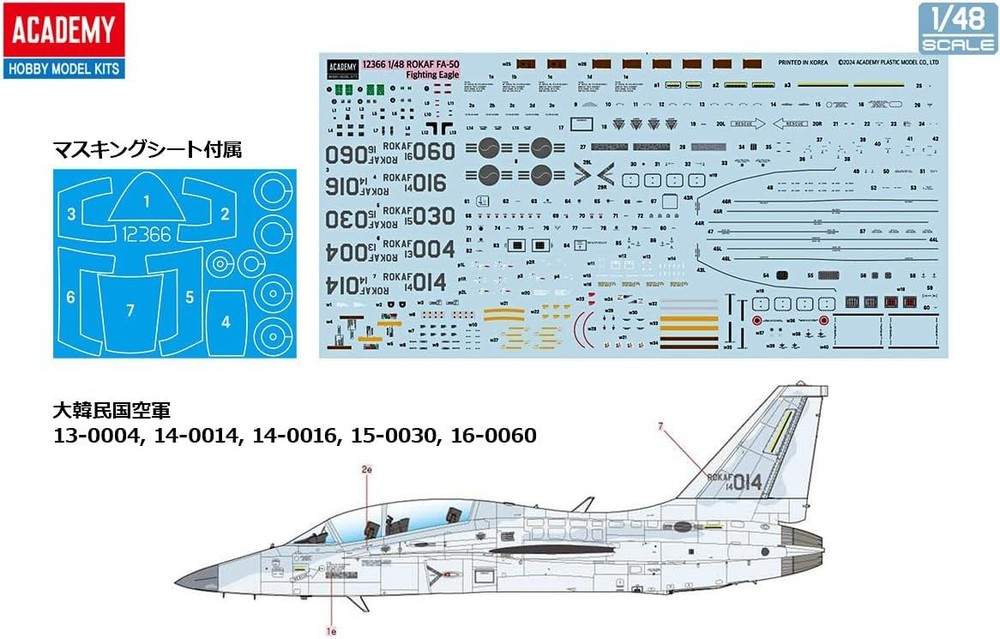 Further Details Title: Academy 12366 1/48 Korea FA-50 Light Combat Bomber Plastic Model Condition: New Release Date: 03/31/2025 Description: Academy 1/48 Korea FA-50 Light Combat Bomber Plastic Model 12366 The FA-50 light combat bomber aircraft introduced in the Korean Air Force, is now available in 1/48 scale. The product is reproduced with precision molds of the aircraft form and various weapons (Air-to-Air AGM-65/Air-to-Ground Induction Bullet KGGB). Republic Korean Air Force 5 Decal and Masking Seal for Canopy Item Height: 100mm Item Width: 193mm Item Weight: 1.17 poundsg Age Level: 15 years and up Brand: アカデミー(Academy) Color: Molded Color Item Length: 270mm Material: Plastic Type: Airplane & Jet Kits Dimensions: 10.63 x 7.6 x 3.94 inches MPN: 12366 Republic Korean Air Force 5 aircraft decal with masking seal for canopy The form of aircraft and various weapons (Air-to-Air AGM-65/Air-to-Ground Induction Bullet KGGB) are reproduced with precision molds This plastic model requires assembly and painting. Adhesives, tools, paints, etc., sold separately 1/48 scale unpainted plastic assembly kit Missing Information? Please contact us if any details are missing and where possible we will add the information to our listing.