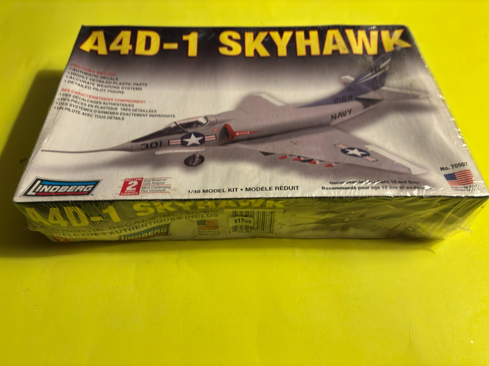 HERES A GREAT MODEL KIT FROM LINDBERG !! ITS THE A4D-1 SKYHAWK JET FIGHTER AIRPLANE IN 1/48 SCALE !! KIT IS BRAND NEW SEALED !! THE BOX LOOKS LIKE IT GOT SLIGHT WATER SAMAGE ON THE BACK-THATS WHY THE WRINKLE ... CHECK THE PICTURES WHAT YOU SEE IS WHAT YOULL GET !! .BUYER PAYS 13.50 FOR USPS SHIPPING IN THE USA ONLY!!TRANSACTION MUST BE COMPLETE AT AUCTION END.I ACCEPT PAYMENTS THROUGH EBAY ONLY!! THANKS FOR LOOKING!! I DO COMBINE SHIPPING SO PLEASE CHECK MY OTHER ITEMS!! IF YOU DONT LIKE MY PRICES MAKE ME AN OFFER!! THE WORST I CAN DO IS SAY NO