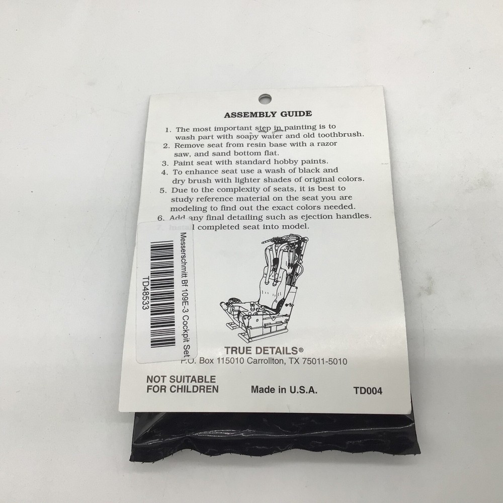 1/48 True Details #48533 Messerschmitt Bf 109e-3 Cockpit Set MK// Condition is brand new as product has never been used, and is sealed by manufacturer. // We do combine shipping on multiple orders for the continental United States only. We use the Global Shipping Program for everything else, and are unable to combine shipping on auctions shipping outside the USA, unfortunately. If you live outside of the continental United States and would like combined shipping, you must contact us prior to your purchase to discuss your options. We will make every effort to combine shipping but are constrained by the rules of the Global Shipping Program.