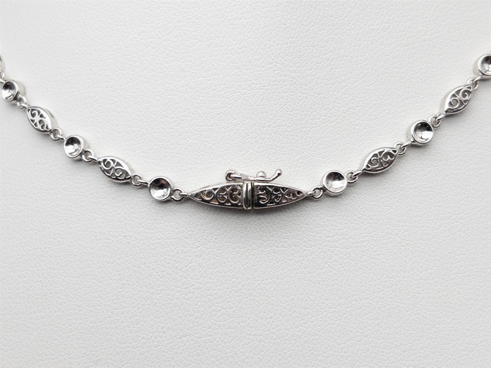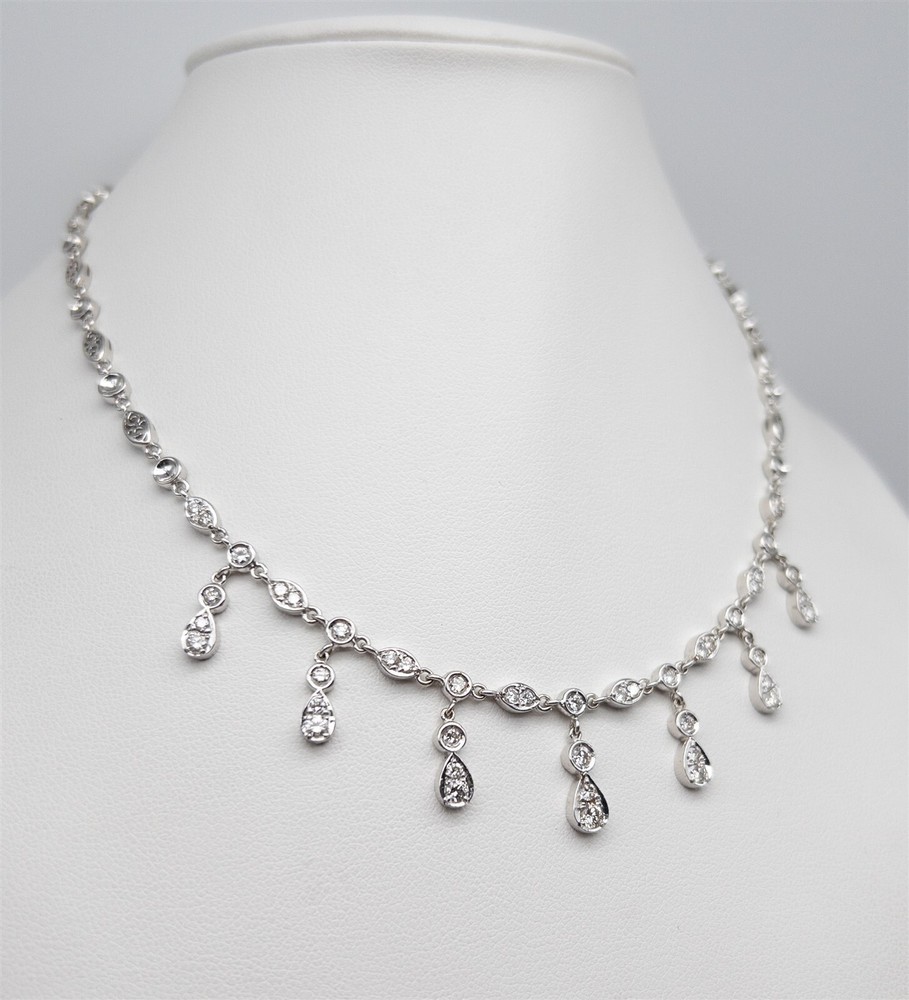 Description: Signed Gregg Ruthy dinner choker necklace. 15 inches and set with 2cts in VS G Natural Diamonds. Solid 18k White Gold and these drops all dangle. Stunning piece and retail $14850. This is a gorgeous necklace and rare find. HEAVY over 20 grams...get a steal. . Stone: Natural Diamonds Metal: 18k White Gold Length: 15 in Gram Weight: 20.2 Powered by SixBit's eCommerce Solution