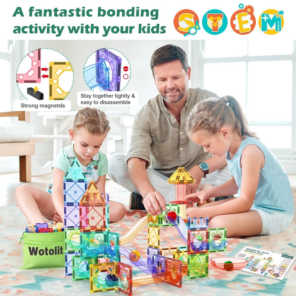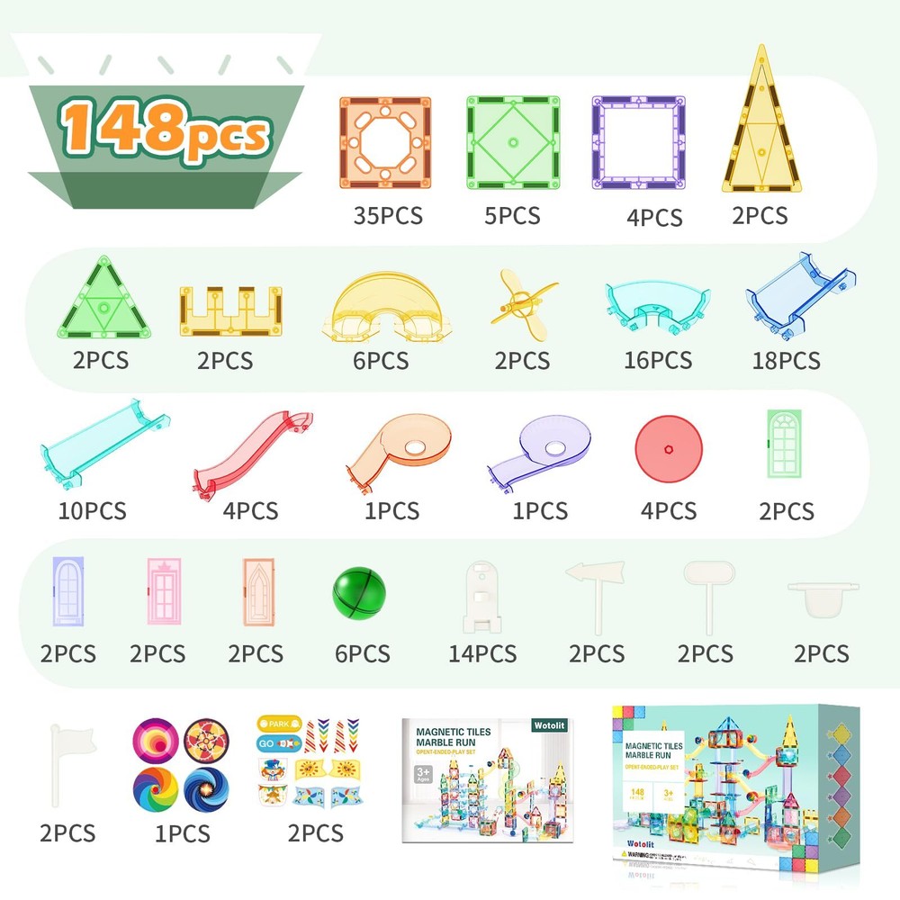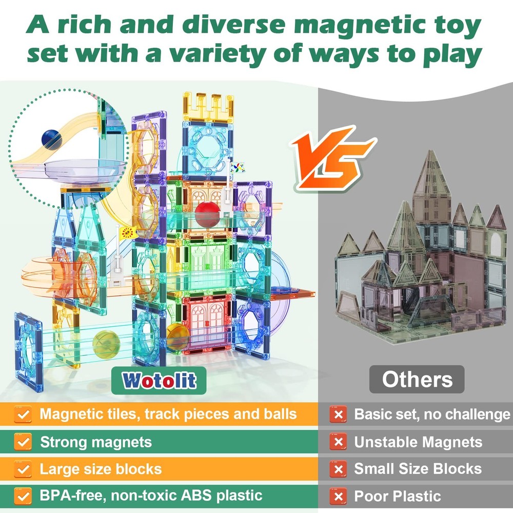 Playing Expansion: Magnetic tiles, track & balls wide variety of our super sets. To be used in conjunction with other leading brands magnet construction toys such as magnetic tiles, building blocks, balls and marble run race tracks. No limitations, scalable to build as big as desired by adding more pieces to create the masterpiece. Compatible with Other Leading Brands: Magnetic Tiles have a 3 inches base measurement and 1.5 inches ball. They’re the perfect size for kid's hands to grip, pick up, and place shapes. Unlike traditional marble runs that can be complicated to assemble and feature small, unsafe marbles. 3 inches base measurement make it compatible with other leading brands, you can expand and complement your existing tiles with this pack to collect every shape in every color! 148pcs Advanced Toys set : With 50 magnetic tiles, 6 large balls, 56 clear smooth-run track pieces and 36 accessory sets , our kit has countless imaginative configurations. This construction kit is designed to fit together snuggly so your marble maze won’t fall apart while you play. Experience the excitement of watching marbles race down the track with Wotolit marble run playset! Surprising Present: Don't hesitate! Any kid will be fascinated by magnetic tiles with marble run. A great toy gift for kids ages 3-5 4-8 8-12 boys or girls who deserve a treat. Reward kids with a fun present that entertains for hours and teaches construction and creativity skills. Perfect Magnet Building Toy for Family: The improved hole design makes assembly and disassembly easier for kids. Your kids can build not only large playground and castle models, but also many small 3D shapes such as houses, robots, telescopes, snails, and more. Explore endless possibilities with this perfect magnet building toy for families.