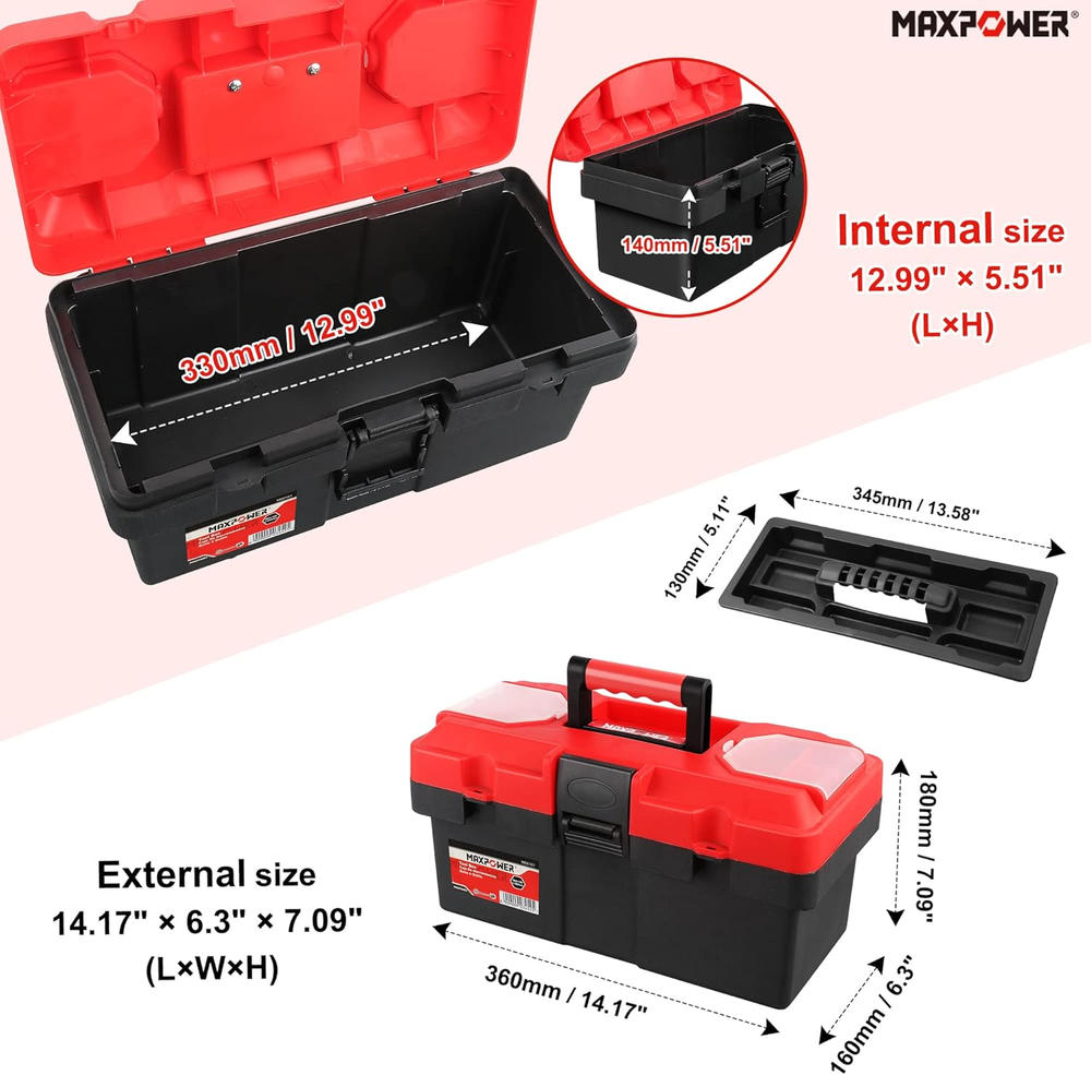 14-inch Toolbox, Internal size 12.99" x 5.51(Lx H), External size 14.17" x 6.3" x 7.09" (L x W x H), around 2 pound Small handheld tool box good for the car and household, lightweight for carrying Made of Rugged polypropylene resin construction, empty plastic tool box with removable trays, fit to storage small wrenches, sockets,screwdrivers Red tool box with lock hole, and transparent small-parts organizer on either side, to store small screw, nut etc (LOCK NOT INCLUDE) MAXPOWER tool box is great choice as gifts for women, men and kids, orangized the hand tools, compact size for easy storage Product Description Small tool box great for around the house and outdoor carrying Dual Lock Design for Maximum Security Portable and Lightweight Durable Plastic Construction and Removable Tray About Toolbox Dimensions ( Please allow 1-3 cm difference ) Overall Dimensions Length x Height : 14.17 x 7.09 inch / 36 x 18 cm Internal Dimensions Length x Height : 12.99 x 5.51 inch / 33 x 14 cm Tool-box Width Width : 6.3 inch / 16 cm Removable Tray Dimensions Length x Width : 13.58 x 5.11 inch / 34.5 x 13 cm