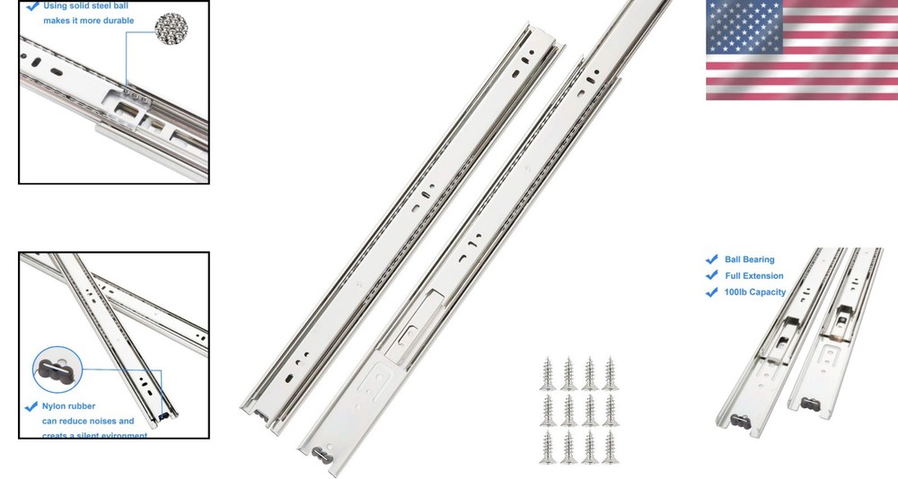 Full Extension 14 Inch Silver Drawer Slides with 100 LB Load Capacity - 10 Pairs ‹ › ‹ › ‹ › ‹ › ‹ › ‹ › ‹ › ‹ › ‹ › Full Extension 14 Inch Silver Drawer Slides -100 LB Load Capacity - 10 Pairs Each slide measures 14 inches in length. Packs include 10 pairs of slides, with screws included for easy installation. Dimensions: 1.77'' width and 0.5'' thickness, providing a perfect fit for a variety of drawer types. Engineered for a remarkable load capacity of 100 lbs. Full extension allows you to utilize the entire space of the drawer. Zinc plated finish ensures a stylish silver appearance while also providing corrosion resistance. Constructed with cold rolled steel for lasting durability. Innovative nylon rubber design at the end minimizes noise during operation, creating a peaceful environment. Lifetime service guarantee - our dedicated team is here to ensure your satisfaction. Transform Your Storage Experience Experience superior functionality with our Full Extension 14 Inch Silver Drawer Slides. Designed for those who demand quality and efficiency, these drawer slides provide seamless operation for drawers across your home or workspace. Each slide is capable of holding up to 100 pounds, ensuring that you can store everything from kitchen utensils to office supplies without worry. Not only do these slides deliver exceptional durability with cold rolled steel and a sleek zinc plated finish, but they also feature a unique design that minimizes noise, allowing for a tranquil home environment. Installation is a breeze with screws included, making it easy to elevate your space immediately. Choosing our Full Extension Drawer Slides means choosing reliability and style. With our lifetime service promise, you can proceed with confidence, knowing we stand behind our product. Upgrade your drawers today and experience the difference! Shipping Free & Fast Shipping - We offer free shipping to most of the USA with a normal delivery time of 3-7 days. However, due to the current situation, additional delivery time (up to 3 weeks) may be required for some items. Alternative Carriers - We may use alternative carriers (e.g. USPS, FedEx, UPS, etc.) to ensure your package arrives safely and on time. Due to the use of multiple carriers, we are unable to provide a tracking number automatically. Handling Time - Orders are processed and shipped within 1-2 business days of receiving cleared payment. Shipping Restrictions - Shipping to Alaska, Hawaii, Puerto Rico, Guam, and other US territories may incur shipping charges or delivery restrictions. Please contact us before ordering, or your order can be refunded/cancelled. State Restrictions - There may be restrictions based on your state of purchase. For example, certain items may not be shipped to California due to state regulations. Contact for Tracking Updates - If you require tracking updates or have any concerns about the delivery of your order, please feel free to contact us, and we will be happy to assist you. Return 30-Day Hassle-Free Returns - We want you to be completely satisfied with your purchase. If you are not, you can return the item within 30 days of receiving it for a full refund or exchange. Easy Return Process - To start a return, simply contact us and we will provide you with a prepaid return shipping label and detailed instructions. Restocking Fee - There are no restocking fees for returns. However, the buyer is responsible for return shipping costs if the return is not due to a seller's error. Refund Processing Time - Refunds will be processed within 5 business days of receiving the returned item in its condition. Payment We accept all major credit cards, PayPal, and Apple Pay for your convenience. Your payment information is secure and encrypted to ensure a safe and seamless transaction. Please complete your payment within 3 days of purchase to avoid any delays in shipping. Feedback Your feedback is extremely important to us. We strive to provide the best products and customer service possible. If you are satisfied with your purchase, please take a moment to leave us a positive review. If you have any concerns or issues with your order, please contact us before leaving negative feedback. We are committed to resolving any problems and ensuring your satisfaction. Contact Us If you have any questions or concerns, please feel free to out to our customer support team. You can contact us through the eBay messaging system. We are available Monday to Friday, 9:00 am to 5:00 pm EST, and we will do our best to respond to your inquiry within 24 hours. Buy it now and enjoy a pleasant shopping experience! Unit Quantity: 10 Material: Cold Rolled Steel,Zinc Plated,Nylon Closing Type: Self Closing Type: Ball Bearing Color: Silver Number in Pack: 10 Style: Contemporary Unit Type: lb