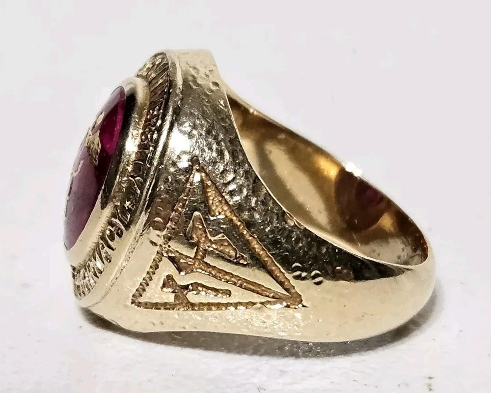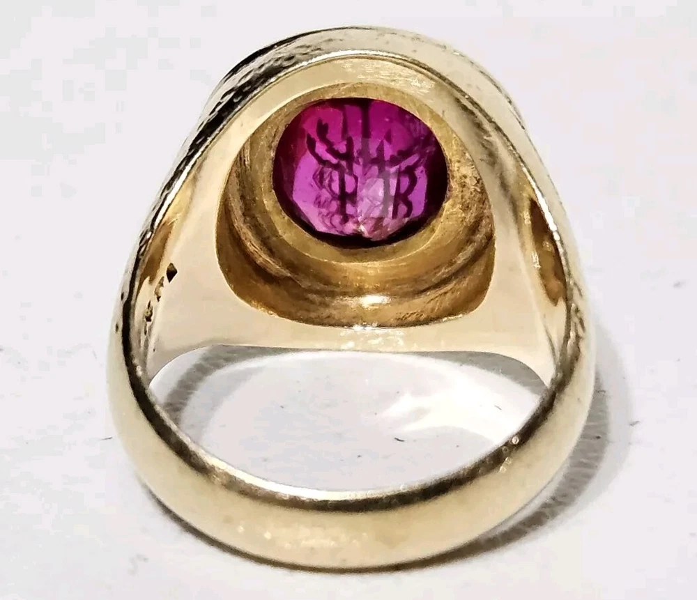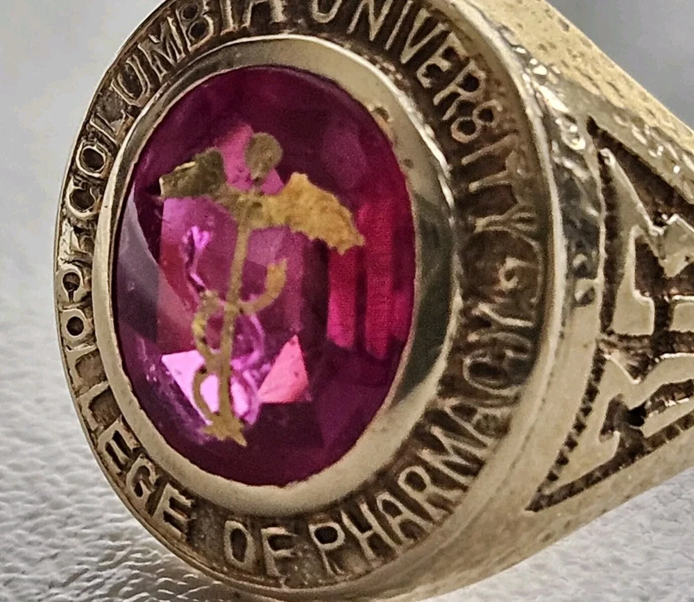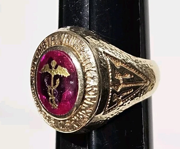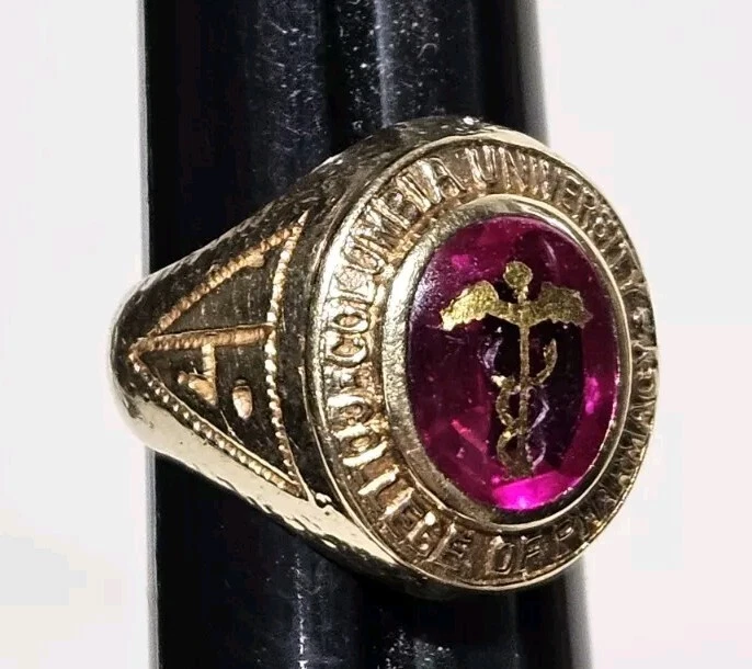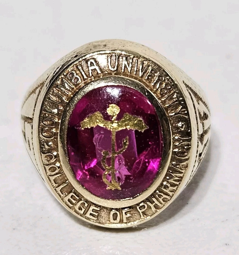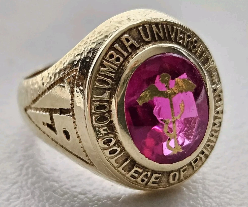 Up for sale is an Antique 14K Yellow Gold 1933 Columbia University College Of Pharmacy 3 Carat Ruby With Caduceus Class Ring. Approximately a size 5.5. Total weight is 8.7 Grams. Ruby measures 8mm Wide X 10mm High (Approximately 3 carats). Ruby is reverse faceted with smooth top. Ring is in good condition with light wear. Gold leaf is worn in 2 areas on ruby and ruby has a few small scratches (last pictures). Please feel free to ask questions. Thank you. From a smoke and pet free environment E-239
