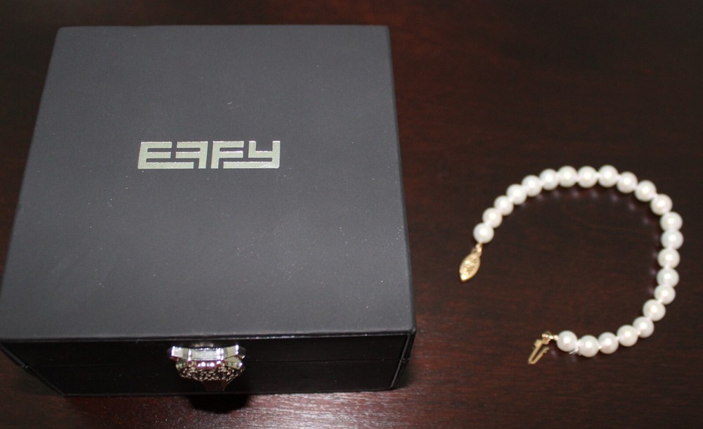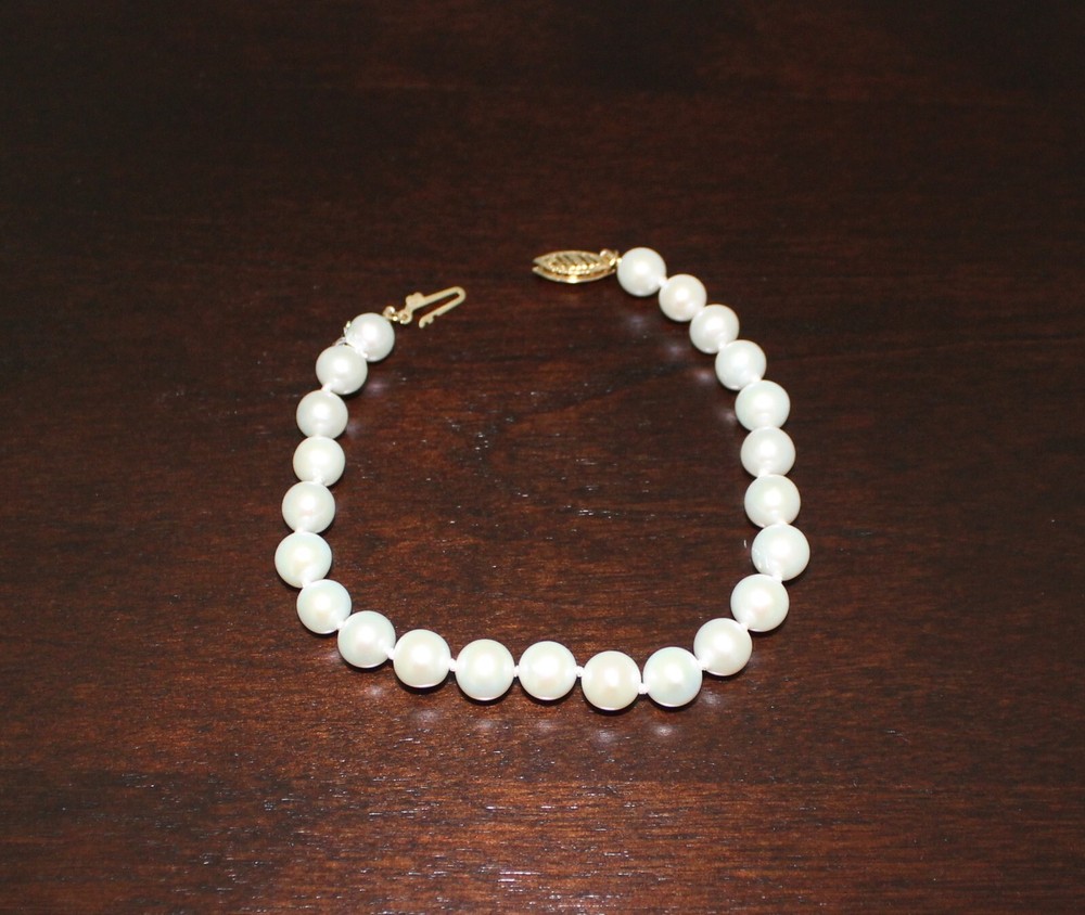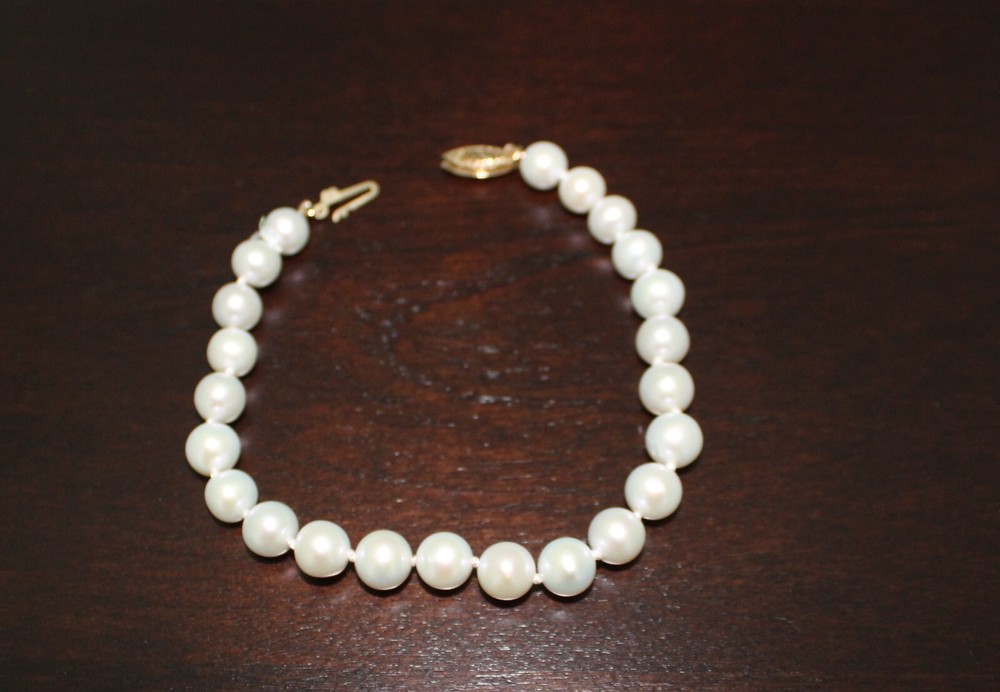 14-karat yellow gold Lustrous round white freshwater pearls 6-6.5mm Bracelet is 7.5 in long Filigree clasp