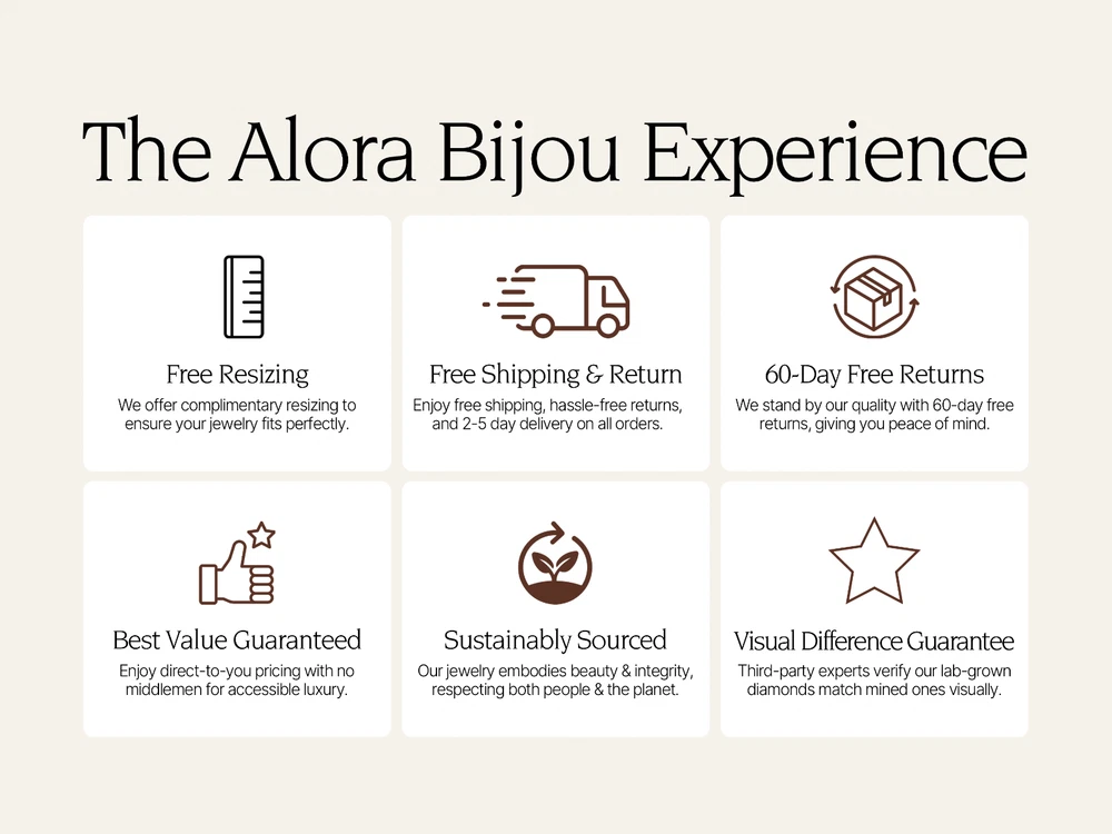 MyListerHub Template - Product Template 1 Wholesale price free resizing 60 day Free return free shipping across us Lorem Ipsum 1 Lorem Ipsum Lorem Ipsum 1 Lorem Ipsum Lorem Ipsum 1 Lorem Ipsum Lorem Ipsum 2 Lorem Ipsum Lorem Ipsum 2 Lorem Ipsum Lorem Ipsum 2 Lorem Ipsum Lorem Ipsum 3 Lorem Ipsum Lorem Ipsum 3 Lorem Ipsum Lorem Ipsum 3 Lorem Ipsum Lorem Ipsum 4 Lorem Ipsum Lorem Ipsum 4 Lorem Ipsum Lorem Ipsum 4 Lorem Ipsum Business Hours Mon-Fri - 9am 6pm Follow Us 14K Gold Bangle With 0.70ct Marquise Center Stone Lab Grown Diamond For Women 18 Reviews PRODUCT DESCRIPTION Introducing the stunning 14K Gold Bangle featuring a 0.70 Carat Marquise Lab Grown Diamond as its center stone. Designed for everyday wear, this elegant and minimalist bangle combines timeless style with modern sophistication, making it a versatile addition to any jewelry collection. Why us At Alora Bijou, we believe that jewelry is a reflection of life’s most cherished moments—a celebration of love, milestones, and memories. Our journey began with a bold vision: to transform the jewelry experience by making exquisite design accessible to everyone. Luxury without the markup By eliminating middlemen and investing directly in our talented designers and manufacturers, we’re able to offer breathtaking, unique pieces at prices that won’t break the bank. This commitment to transparency and innovation allows us to deliver designs that you won’t find anywhere else—because every piece should be as extraordinary as the stories it represents. Design Is Our Obsession Every member of the Alora Bijou family is passionate about design. We are a team of artisans and visionaries who thrive on creativity, continually pushing the boundaries of what’s possible. Our deep involvement in the manufacturing process ensures that we can craft stunning jewelry that speaks to your individuality and style. With us, you’re not just choosing a piece; you’re embracing a new frequency in design. Sustainably Sourced, Ethically Made Sustainability is at the heart of everything we do. Our lab-grown diamonds are a testament to ethical craftsmanship, providing the same beauty and brilliance as mined diamonds while respecting our planet and its resources. We pay fair wages to our artisans and ensure every aspect of our production process is conducted with integrity. Choosing Alora Bijou means choosing a future where beauty and responsibility go hand in hand. Visual Difference Guarantee Each of our diamonds undergoes meticulous inspection by third-party jewelers, ensuring there are no discernible visual differences between mined and lab-grown diamonds. This commitment reflects our dedication to delivering exceptional quality and beauty. With Alora Bijou, luxury meets innovation seamlessly. Return We are dedicated to your satisfaction, which is why we offer a 60-day free return policy for complete peace of mind. This allows you the time to truly fall in love with your purchase, knowing that your happiness is our priority. Our commitment to quality and customer care ensures a seamless and confident shopping experience. With us, you can explore timeless elegance with the assurance that we stand firmly behind every piece. Free Resizing We are committed to ensuring your jewelry fits you flawlessly, enhancing both your comfort and confidence. Our complimentary resizing service is designed to cater to your unique style, offering a perfect fit that truly reflects your individuality. Whether it's a ring that needs adjustment or a bracelet tailored to your preference, we handle every piece with care and precision. This personalized touch ensures that your jewelry is as exceptional as you are. At every step, we prioritize your satisfaction, making each piece a perfect extension of your elegance. Shipping We provide complimentary FedEx Priority Shipping within the US, ensuring your luxury jewelry arrives swiftly and securely. Enjoy the convenience of fast, reliable delivery as we bring timeless elegance straight to your doorstep. Best Value Guaranteed We take pride in offering unmatched value for your luxury jewelry. Our Price Match Guarantee ensures that if you find your chosen piece at a lower price elsewhere, we’ll match it, providing you with both peace of mind and exceptional quality. Your trust is our priority, and we are dedicated to ensuring that you receive the finest craftsmanship at the most competitive price. When you shop with us, you’re not just investing in timeless elegance, but also in a promise of superior value and satisfaction. Enjoy New Year Discount 30% OFF Timeless Designs GET OFFER Customer Reviews I can’t believe how quickly I received my order. The necklace is absolutely beautiful 🤩 Will definitely be shopping here again. Samsscho So so happy with my rings! They are stunning and the customer service was more than accommodating to my particular needs. Really happy to wear these on my finger for the rest of my life and hopefully will be back for a few more soon! Caitlin Such a beautiful ring and arrived even earlier than expected. Great customer service as well! I definitely recommend this shop. Naomi Abel was amazing at crafting my dream toi et moi necklace! He made all of the modifications I asked for including change to the setting and finish. He was quick to respond, shipped super quickly and produced a high quality product. It is everything I was dreaming it would be! Would recommend 10/10 and hope we can craft more beautiful pieces together! - Abel, I am thinking about some earrings… ;) Thank you so much! Nicole BEST SELLING CATEGORIES Engagement Rings Bracelets Necklaces Earrings Categories Rings Necklaces Bracelets Earrings Quick Links Visit Our Store Business Hours Follow Us Copyright © 2025 All rights reserved | Designed by MyListerHub