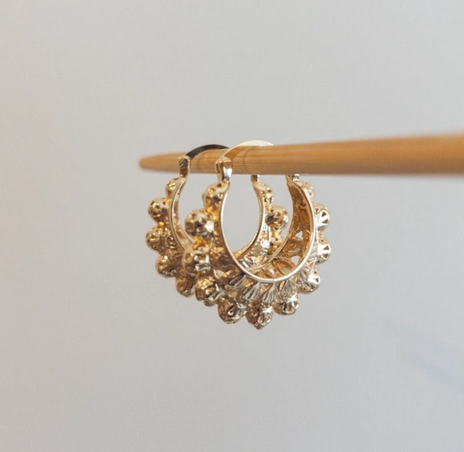 Add a touch of vintage-inspired charm to your jewelry collection with these exquisite gold-filled filigree hoop earrings. Their intricate detailing and delicate design make them a beautiful choice for those who appreciate elegance and sophistication. Product Features: Material: Crafted with high-quality gold-filled metal, providing a rich shine and durability for long-lasting wear. Filigree Detailing: Features delicate filigree work with fine, intricate patterns, adding a unique and elegant look to these hoops. Size: Perfectly sized for everyday wear while still making a statement (approx. 1.2 inch). Secure Latch Back Closure: Designed with a secure latch back for a comfortable fit. These filigree hoop earrings are a stunning addition to any outfit, from casual looks to formal attire. Their timeless design makes them a perfect gift for someone who loves vintage-inspired or bohemian styles. Why Choose Gold-Filled? Unlike gold-plated jewelry, gold-filled pieces are created with a thicker layer of gold, ensuring a longer-lasting finish that resists tarnish, flaking, and wear. With proper care, these earrings will maintain their beauty for years to come.