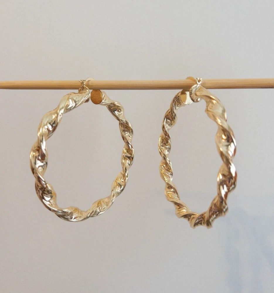 Elevate your style with these stunning gold-filled hoop earrings. Crafted with meticulous attention to detail, these earrings feature an intricate twisted design that adds texture and dimension to any outfit. The hoops are medium-sized, making them perfect for both everyday wear and special occasions. The gold-filled material ensures durability and a long-lasting shine, giving you the luxurious look of gold without the hefty price tag. These earrings are lightweight and comfortable to wear, with a secure clasp that keeps them in place all day. Add a touch of elegance and sophistication to your jewelry collection with these exquisite gold-filled hoop earrings. Features : Material: Gold-filled Design: Twisted texture Size: Medium Closure: Secure clasp Lightweight and comfortable Perfect for everyday wear or special occasions Dimensions: Diameter: Approximately 2.75 inches Why Choose Gold-Filled? Unlike gold-plated jewelry, gold-filled pieces are created with a thicker layer of gold, ensuring a longer-lasting finish that resists tarnish, flaking, and wear. With proper care, these earrings will maintain their beauty for years to come.