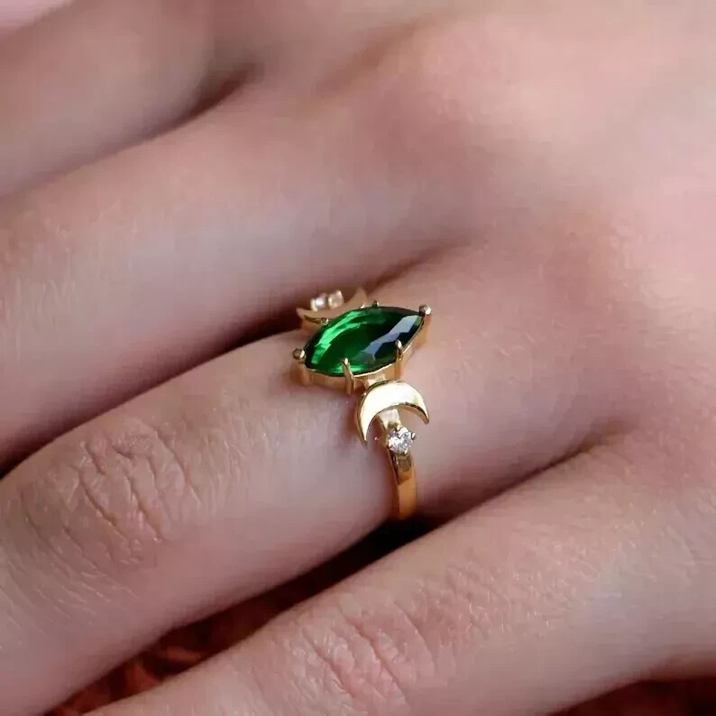 Crafted for elegance and affection, this 14K yellow gold plated ring is a testament to timeless design. Featuring a striking marquise-cut lab-created green emerald as its centerpiece, the piece captures the light with every movement, symbolizing the wearer's love for luxury and sophistication. The emerald's rich green hue and VVS1 clarity grade ensure that it stands out with a presence that's both captivating and refined. The ring's meticulous craftsmanship is evident in its excellent cut grade, complemented by a solid gold pattern that provides a classic touch. Available in all ring sizes, this piece can be personalized to fit any occasion, whether it's an anniversary or a promise of commitment. With its commitment to quality and style, this ring promises to be a cherished addition to any jewelry collection.