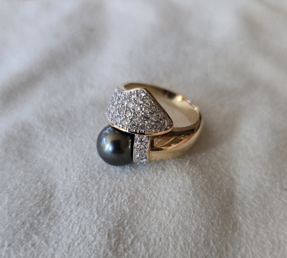 This beautiful cocktail ring is crafted in solid 14K yellow gold and has a bright and shining Tahitian pearl as its centerpiece, valued for its rich natural color and elegant shine. Accented with many sparkling diamonds, this design offers an eye-catching contrast between its rich gold, luminous pearl, and shining diamond highlights. Bold and refined, this sophisticated ring is perfect for elegant evenings and formal occasions. Weight: 9.5 Grams Stone: Tahitian Pearl (9.8 mm) & Approx 0.86 TCW (0.02-0.03 ct) H/I VS-SI Diamonds Face of Ring: 23.5 x 18.8 x 9.8 mm Ring Size: 8.5 Hallmark: 14K