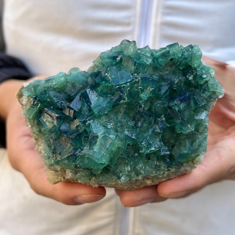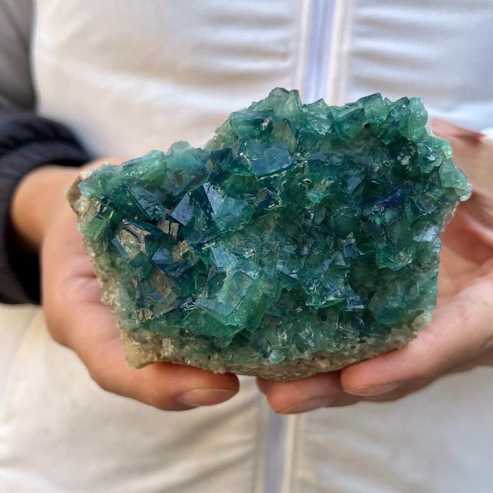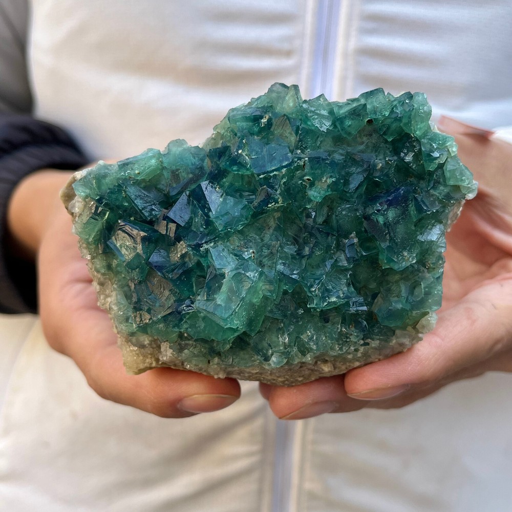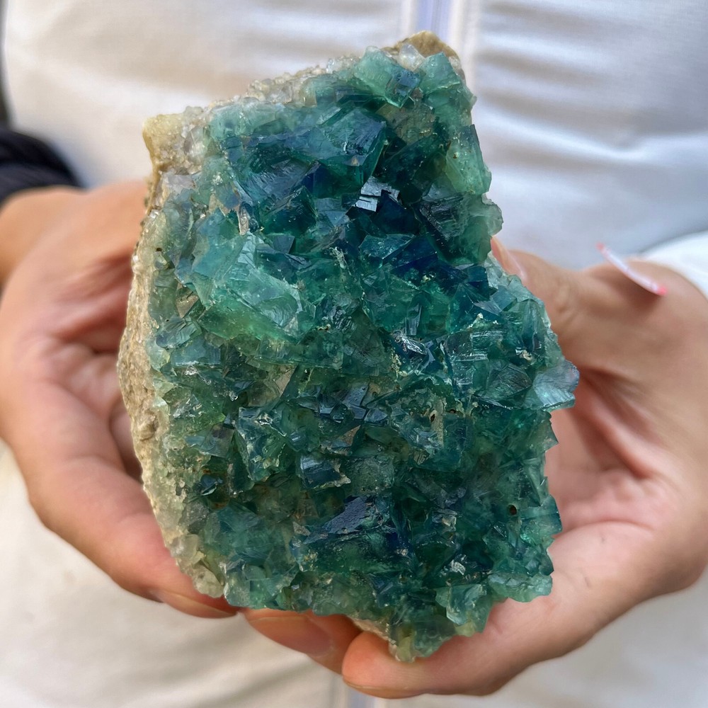 Amazing blue green hues in the fluorite. Item got here super quickly and it was wrapped completely in bubble wrap and tape. It looks exactly like the picture. It’s a solid chonk of a rock with interesting white flecks of crystal on the bottom. A+ transaction!!!