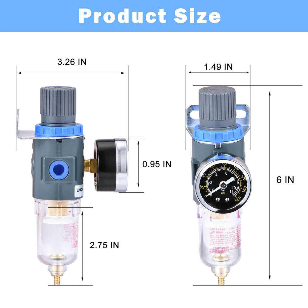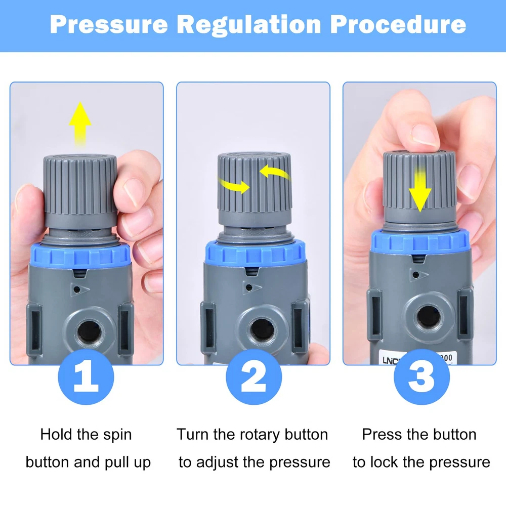 ✔ Using this air regulator you can get accurate pressure with gauge in full control. ✔ Can filter small particles,dust and keep the air dry and clean. ✔ Pull the top button up and turn clockwise to increase the pressure, Or turn counter-clockwise to release the pressure. ✔ Easy to install and remove in light weight. ✔ Easy to dispose waste trapped inside with drain valve.