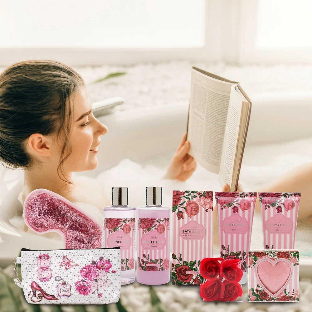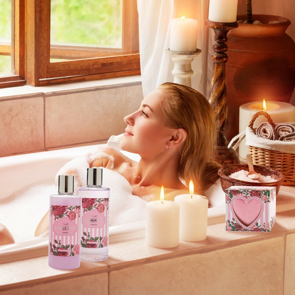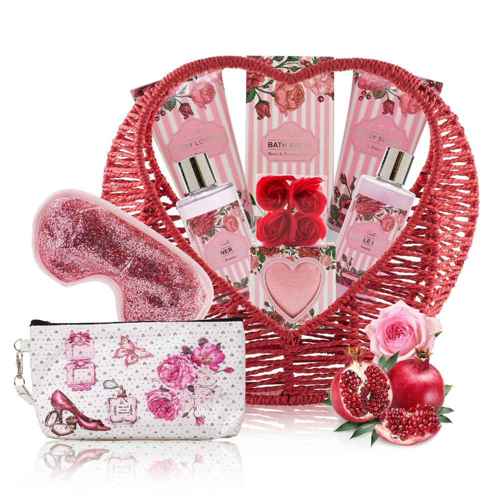 Fabulous Valentine's Day gifts for Her! Perfect Valentines Gift for Wife or Girlfriend! Premium 14-PC Spa Gift Baskets in Romantic Heart Shape! Se Sentir Relaxing Home bath Set in Rose and Pomegranate Essence Reliable U.S Seller Free Fast Shipping with Tracking SET INCLUDES (FULL SIZE): 1 X Bubble bath (6.8 Oz / 200 ml) 1 X Shower Gel (6.8 Oz / 200 ml) 1 X Body Lotion (3.4 Oz / 100 ml) 1 X Body Scrub (3.4 Oz / 100 ml) 2 X Heart Shaped bath Bomb ( 2 X 1.8 Oz / 2 X 50 g) 1 X Bath Salt (4.0 Oz / 100 g) 1 X Gel Eye Mask 1 X Cosmetic Pouch 4 X Bath Soap Flowers 1 X Heart Shape Basket Description: SPA BATH SET FITS ALL OCCASIONS This luxurious spa gift basket makes a nice present for all gift events including holidays as Christmas, New Year, Easter, Mother’s day, Valentine’s day and Birthday, Anniversary, Graduation, Corporate, housewarming, Just Because, Love & Romance, New home, Retirement, Spring, Thank you, Thinking of you, Cleanup day and Boss’s day to express your Thankfulness or Best Wishes. IDEAL GIFT FOR YOUR LOVED ONES Treat your loved ones with this handmade spa collection gift basket scented with the rejuvenating aroma of Wild Rose and Pomegranate. Whether it is your mother, wife, girlfriend, daughter, sister, partner, teen girl, friend, grandma, or mother in law, sister in law or stepmother, mom, it is always bright to let them know how much you care and love them. !! Put a smile on her face with this elegant spa gift basket!! RELAXATION AT-HOME SPA EXPERIENCE Unwind and pamper for your own indulgent pleasure with this fragrant delightful and fresh scented assortment of at home spa and bath kit. Choosing Bath Salt, or one of the 2 extra-large Bath Bombs, immersing in a real spa-experience flower bath pour, having fun in the tub, soaking your troubles away time and again with the glorious scent of Wild Rose and Pomegranate SOOTHING AROMATHERAPY PRODUCTS Infused with floral essential oils of wild rose and pomegranate, Se SentiR natural spa set is an ideal solution for relieving muscle pain, soothing the mind, invigorating the body, revitalizing the spirit and promoting overall well-being. The featuring nourishing ingredients such as sunflower seed oil and vitamin E refresh the skin and lock in moisture. ULTIMATE BEAUTY ESSENTIALS This luxurious natural at-home spa kit gift basket begins with essential tools for a full day of relaxation including Bath Bomb, Bath Salt, Bubble Bath, Body Lotion, Gel Eye Mask and a bling-bling Cosmetic Pouch and more and more. The delightful wire baskets can be used in many different ways including as a decorative container. Furthermore, Customer satisfaction is always our top priority. “30-day hassle-free return is our guarantee!!”