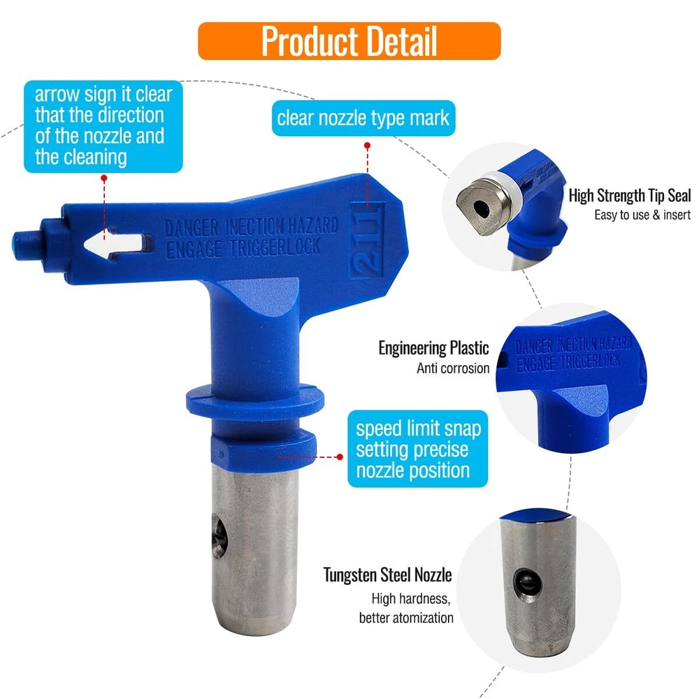 14Pcs Reversible Spray Paint Nozzle Tips, Airless Paint Sprayer Guns, with Spray Gun Filters and Protective Seat, Spray Paint Machine Parts, for House, Car, Hull Painting (211, 315, 417, 515, 517, 623 Practical: Our reversible spray paint nozzle set can be sprayed stably, the coating is uniform and delicate, which can effectively reduce the loss. It is a must-have painting accessory for painters and decorators. Model: Our airless paint sprayer has 6 models: 211, 315, 417, 515, 517, 623. The spraying angle is 20° - 60°, the range of spray width of paint sprayer gun can be seen in the picture. Material: Our airless paint spray gun tip set is made of high -hardness tungsten steel. It is strong and durable, not easy to wear, and has a long service life. High precision, spray stable. Easy to use and clean: Upgrade airless paint spray nozzle can be installed quickly in a short time without using tools. After use, you only need to rotate the nozzle to clean it, which is convenient and fast. Applicable scenario: We provide you with 6 spray paint nozzles, 2 protective seats, and 6 filters. It can be used for house renovation, hull painting, car painting and other scenarios to meet your daily painting needs.