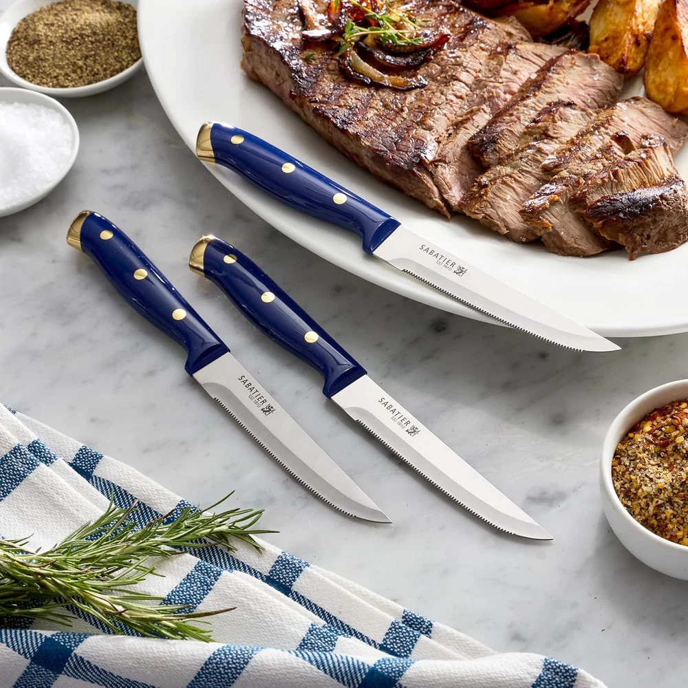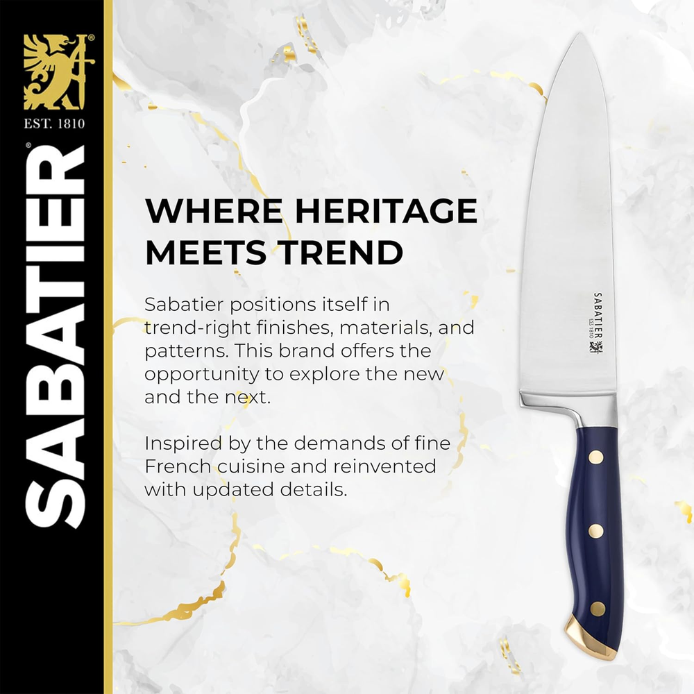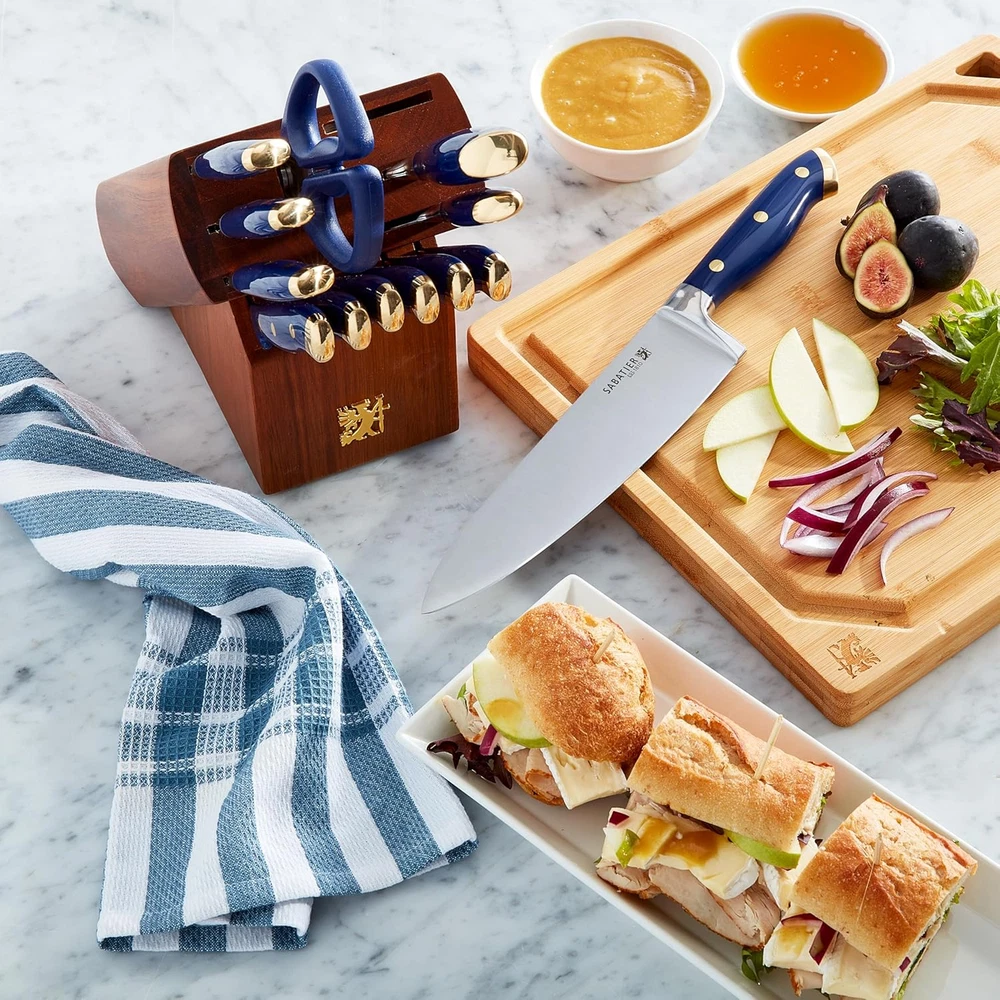 Store New Arrivals Add to Favorite View Feedback Contact 14-Piece Forged Triple Rivet Knife Set with Acacia Block, Navy with Gold, High-Carbon Stainless Steel Blades for Precision Cutting Description Item model number 5317039 Style Modern Color Navy/Gold Country of Origin China Item dimensions L x W x H 10.8 x 11.22 x 3.93 inches Is Dishwasher Safe No Item Weight 6.78 pounds Construction Type Forged Blade Material High Carbon Stainless Steel Product Dimensions 10.8 x 11.22 x 3.93 inches Included Components Knife Block Set COMPREHENSIVE COLLECTION: This set includes an chef knife, slicing knife, serrated utility knife, santoku knife, fine edge utility knife, paring knife, six steak knives, all purpose scissors, and an acacia wrapped block EXPERTLY FORGED BLADES: Precision forged from high carbon stainless steel, these knives deliver unmatched sharpness, durability, and performance for any task, from intricate prep work to hearty slicing ERGONOMIC TRIPLE RIVETED HANDLES: Designed for exceptional comfort and balance, the triple riveted handles provide optimal control and elevate your cooking experience with ease ELEVATED STYLE FOR YOUR KITCHEN: The navy handles with gold accents add a modern touch of luxury, while the acacia wood block brings timeless warmth and elegance to your countertop A PERFECT GIFT OR KITCHEN UPGRADE: Whether it’s for a wedding, housewarming, or your own culinary refresh, this set offers the perfect balance of style and practicality, making it an impressive gift or an elegant addition to your home The Sabatier 14 Piece Forged Triple Rivet Knife Set with Acacia Block brings a perfect balance of elegance and performance to your kitchen. Crafted from high carbon stainless steel, each blade is precision forged for exceptional sharpness and durability, ensuring outstanding results for every culinary task. The ergonomic triple riveted handles, designed for comfort and control, are beautifully finished in navy with gold accents, adding a sophisticated touch to your space. This comprehensive set includes an 8 in chef knife, 8 in slicing knife, 5.5 in serrated utility knife, 5 in santoku knife, 4.5 in fine edge utility knife, 3.5 in paring knife, six 4.5 in steak knives, all purpose scissors, and an acacia wrapped block that keeps your knives stylishly organized. ABOUT US We offer the best prices around on high quality products. Our E-store includes media such as books, movies, music and games while offering electronics, toys, sporting apparel, clothing, tools, general home, garden items and more. SHIPPING We are always working hard to ensure your package arrives as soon as possible. Please understand that some factors like weather, high postal traffic, and the performance of shipping companies are outside of our control. We offer free shipping to the lower 48 states and ship within 2 business days of payment, usually sooner. We do not accept P.O. Boxes. Please provide a physical address. For shipping outside of the continental USA, we only use eBay's Global Shipping Program.The item is shipped to KY and then sent to the rest of the world. International customers are responsible for all duties and taxes. Continue to check out in order to calculate costs for shipping the item to your country. Messages regarding eBay's Global Shipping Program MUST be directed at eBay EXCLUSIVELY. RETURNS We offer a 30-Day Return Policy on items which you are not completely satisfied with. You have the option for a full-refund or an exchange of the item. No returns are available on items shipped outside of the USA. PAYMENT We accept PayPal. CONTACT US This page content is yet to come Please ad us to your favorite seller and visit again later Thank You CUSTOMER SATISFACTION We try our very best to make sure every customer is completely satisfied. If there's a problem, message us! We're happy to help. WE ACCEPT Copyright © 2021 AutoDS. | All Rights Reserved
