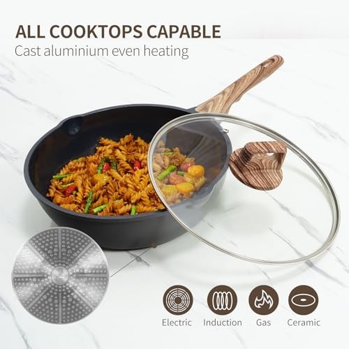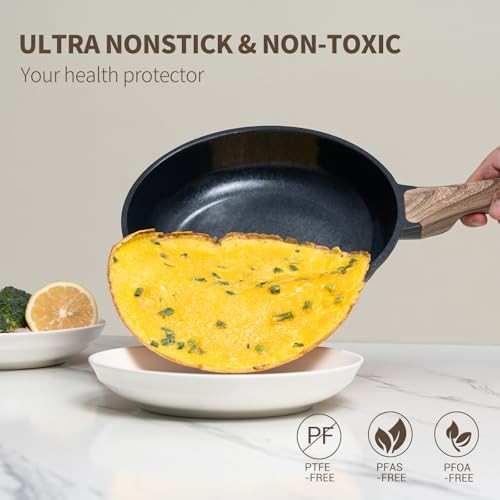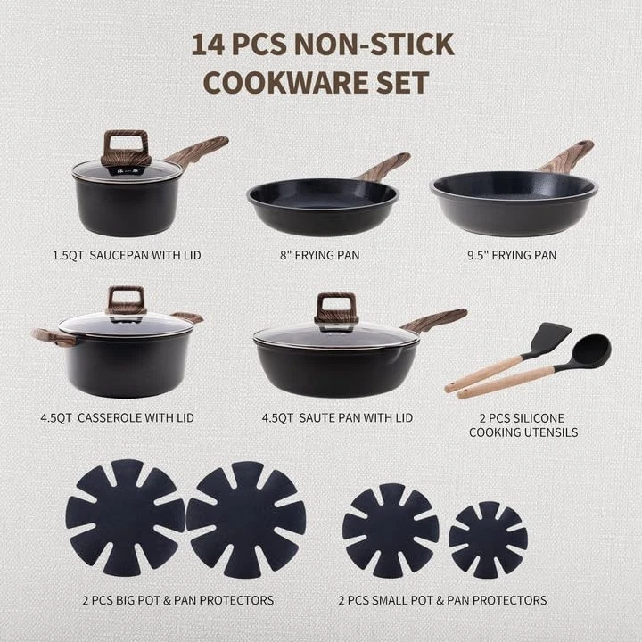 Return Policy Fast Delivery Trusted seller Pots and Pans Set with Lids, 14 PCS Cast Aluminium Non Stick Non-toxic Ceramic Coating Cookware Set, Frying pans with Lids, Black Product Description Package Includes: 1.5Qt Saucepan with Lid, 8" Frying Pan, 9.5" Frying Pan, 4.5Qt Casserole with Lid, 4.5Qt Saute Pan with Lid, 2 PCS Big Pot & Pan Protectors, 2 PCS Small Pot & Pan Protectors, 2 PCS Silicone Cooking Utensils High-Pressure Die Casting Skillet :Molten aluminum injected under high pressure, achieves uniform 3.6 mm base/1.6 mm wall thickness, with 0.1 mm deformation tolerance. Heavy-duty cast aluminum ensures even heating and is resistant to deformation during use. Non-toxic Ceramic Coating & Super Nonstick: Made of natural ceramic coating, which is free from PTFE/PFAS/PFOA, ensure healthy and safe cooking. Most food residues removed under warm running water. Less water and time wasted. Eggs can slide right off the pan effortless, which makes cooking easier with less oil. Induction Compatible: Its induction base is applicable for all stove tops, including induction. Its enlarging magnetic base ensures larger heating area. Optimal Heat Guidance: For smaller cookware (like 8" skillets), the burner flame diameter may exceed the pan's base. To ensure the best performance and longevity of the handle, we recommend using low to medium heat as your primary setting. This helps prevent direct flame exposure to the handle base, promotes even cooking, and provides greater control for a safer and more enjoyable culinary experience. Shipping Returns Payment Shipping Shipping is FREE to all addresses other than APO/PO boxes in the lower 48 states. All our stock ships from US-based warehouses. Shipped via USPS or UPS (depending on location and package weight) Unless stated otherwise, all orders will ship within 24-72 hours of your payment being processed. Check our feedback to see the great reviews of FAST shipping we offer. Returns Seller does not accept returns Payment We currently accept payment via eBay managed payments only. Once payment is cleared, we will dispatch your shipment within 1-3 business days. Please refer to the "Shipping" tab for more information regarding shipping speed to your destination.