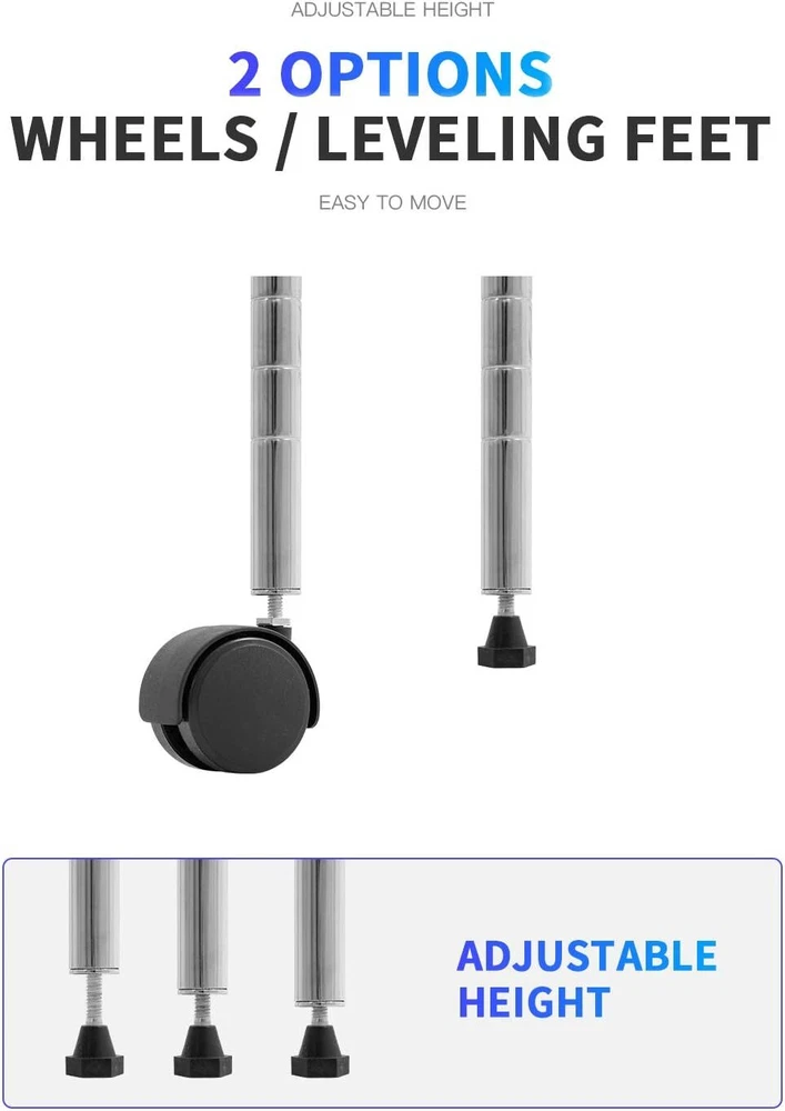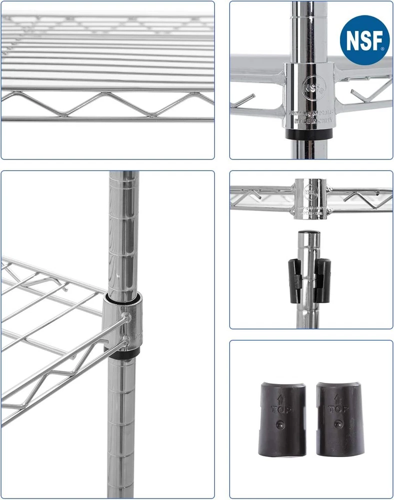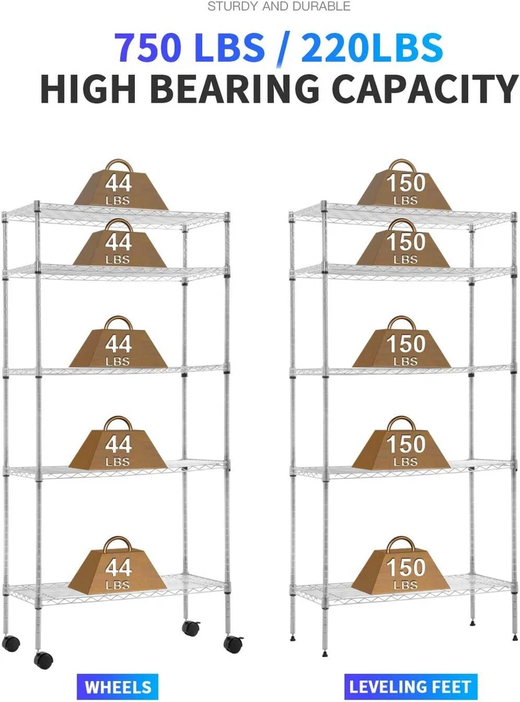 ♛【Easy to Assemble】:The storage shelves structure is very simple ,No tools required to assemble it.The installation takes less than 30 minutes to complete,Shelving Unit Easy to Assemble. Metal shelf unit storage rack wire shelving ♛【Adjustable Shelves】:Storage shelf’s layer can be set at any height for your individual needs , Metal Rack could accommodate a variety of items, wire Shelving Unit have helped in organizing garage, kitchen, office and so on. Wire unit rack shelf metal storage. ♛【Extremely Durable】:This storage shelf was made of heavy duty steel and coated with Eco-friendly, metal rack have excellent rust resistance. Weight limit of each wire shelving unit is 150 pounds, and the total weight limit of the whole shelf is 750 pounds when equally distributed on feet levelers. Storage shelf metal rack wire unit ♛【Large Capacity】: The diameter of the storage rack is 54"x36"x14". The metal frame is large enough to hold a lot of things, the shelving unit is a good helper to keep the space clean and tidy, you can freely adjust the height of each garage rack. Unit rack storage shelf metal wire shelving ♛【What You Will Got】We hope that you will like this metal storage rack. If you are not satisfied with this storage rack, please contact us and we will be happy to give you a 100% refund! If you have any questions, please feel free to ask! Unit rack storage shelf metal wire rack Product Description Leveling feet allow the wire shelving to be placed on uneven ground -a simple twist is all it takes to stabilize. High-strength materials are durable.Black powder coating prevents rusts.Easy to clean.V-shaped mesh surface to strengthen load-bearing. All NSF-certified 5-shelf shelving unit have been tested by NSF International to NSF/ANSI Standard 2 for use in dry and heated storage Raise the shelf and move all four sleeves to a new position for more or less height, as desired, meet your different needs. Maximum weight capacity per shelf is 150lbs when equally distributed on feet levelers. Maximum entire unit weight capacity is 220lbs when equally distributed on casters.