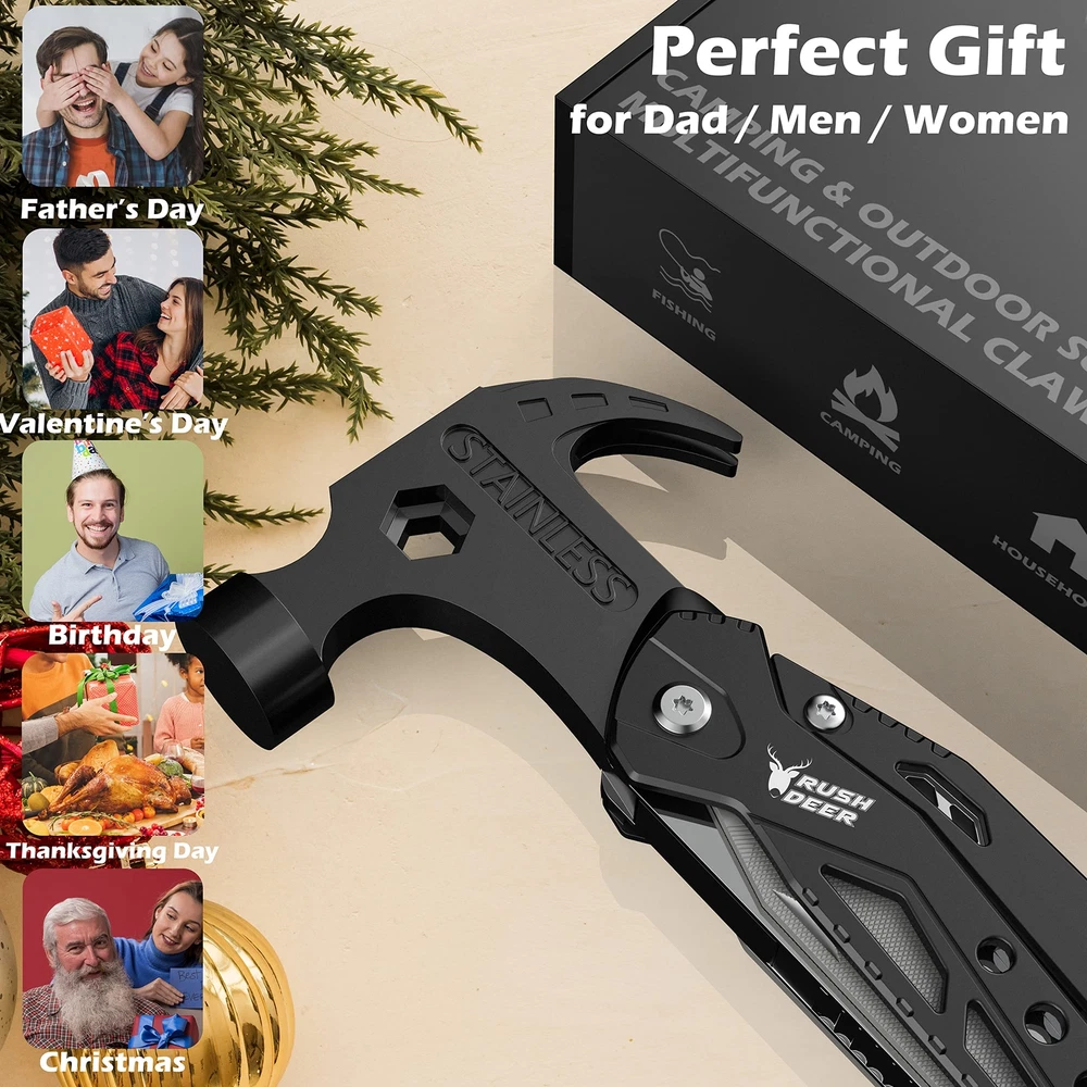 【14-in-1 Multi tool】:The 14 in 1 mini hammer multitool includes heavy duty mini claw hammer, allen wrench, needle nose pliers, phillips screwdriver, wire cutter, serrated knife, screwdriver hole, slotted screwdriver, nail puller, steel file, bottle opener, knife, regular pliers, slotted screwdriver. 【Upgraded Survival Gear and Supplies】: The hammer multi tool survival gear tool kit with a seatbelt cutter and min hammer, is a utility tool for keeping in the car to deal with any emergencies. Strong enough to shatter the glass curtain wall, cut the rope curtain in a dangerous escape. A necessity for every family. 【Camping Essential Accessories 】: This multitools camping gear kit fits camping, home daily-use, hiking, exploring, adventure, fishing, work, hunting etc. Comes with a waist clip bag, the multitool is made of stainless steel, durable and rust-resistant. It can be folded into a handle shape, easy to grip, and is an ideal tool for everyday carry. 【Christmas Gifts for Men and Women Who Have Everything】: Have you ever seen more versatile and unusual gift ideas? This is a gift for dads who have everything, suitable for men, husbands, sons, and boyfriends for birthdays, Christmas, Father's Day, anniversaries, or Valentine's Day. 【Satisfactory Service】: Quality and Customer Satisfaction are our top priorities. If the camping accessories hammer multi tool doesn’t live up your expectations, please feel free to contact us and we will do our best to ensure your happy purchase experience.