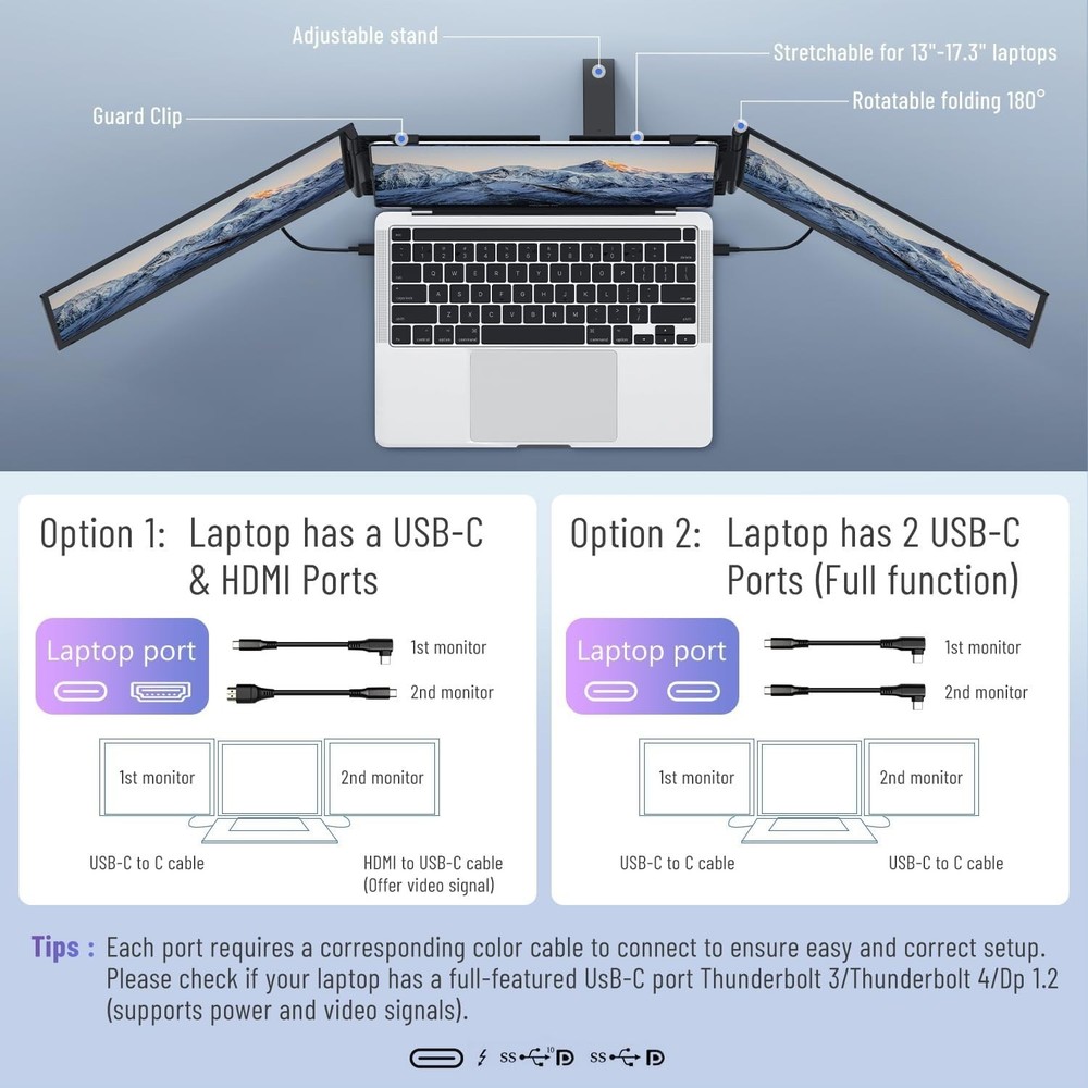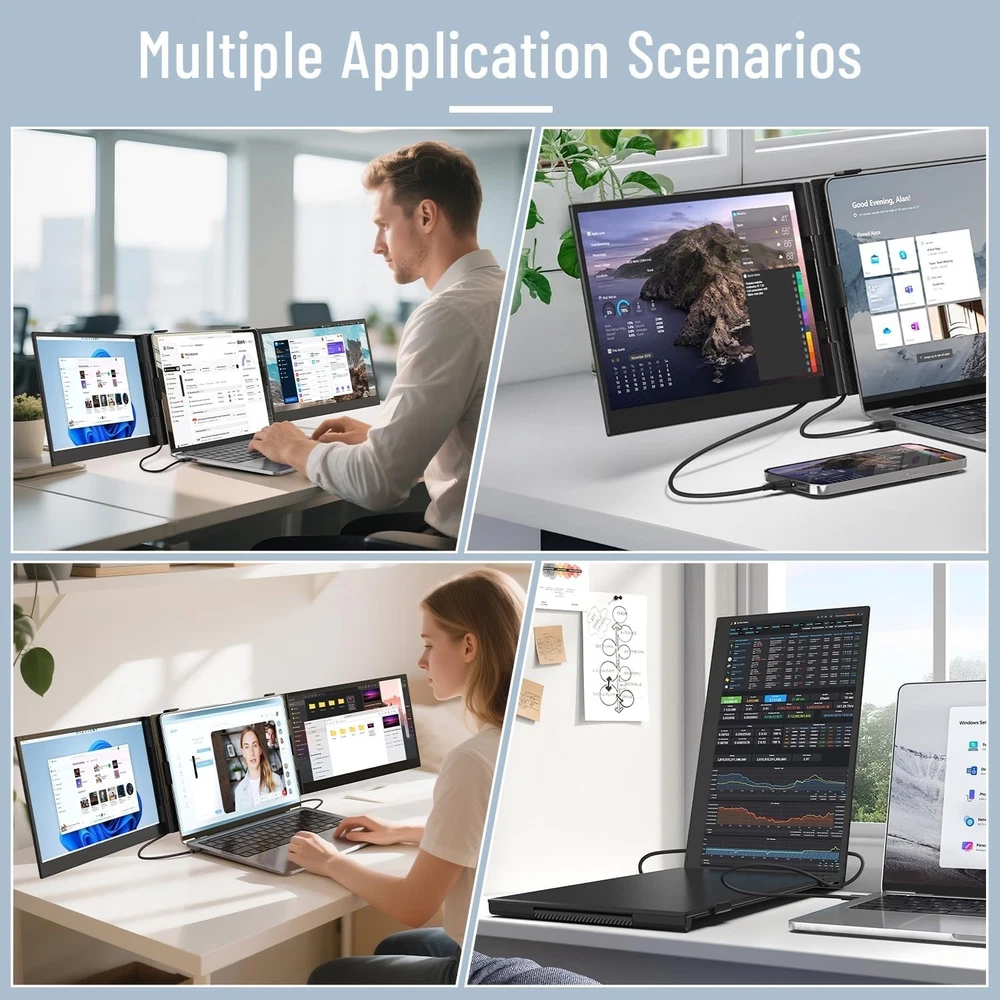 【Ultra-Slim 1080P FHD IPS Monitor】Macsecor 14'' triple laptop screen extender features 0.17-inch ultra slim FHD 1080P IPS dual displays, HDR mode brings realistic colors, each screen can independently adjust the brightness, contrast, color temperature and other parameters to ensure with home screen consistent color and image clarity maintained. Flexibly adjust the screen rotation Angle 180 degrees, adjust the best viewing Angle at any time,providing you with a personalized and immersive visual experience. 【Upgraded Aluminum Alloy Tri-Screen】This portable monitor for laptop with upgraded aerospace aluminum alloy materials (70% lighter) , unlike traditional plastic monitor extenders, it offers superior heat dissipation and a higher-quality texture. Macsecor tri-screen is designed to keep up with you: its ultra-lightweight body can be easily clamp onto the frame of laptops without causing any damage to your laptop's screen, while making your laptop more flexible. 【Wide Compatibility】Macsecor triple portable laptop monitor work for 13"-17.3" laptops, connect via full-featured USB-C and HDMI, making it compatible with a wide range of devices including laptops, desktops, tablets, and gaming consoles like PS5, PS4, Xbox, and Switch. (Included for M1-M4 Chip MacBooks). Only two cables are needed to turn your laptop screen into a triple screen anytime, anywhere—greatly helping maintain a clean and efficient workspace. (Note: If you are not sure whether your laptop is compatible, you can consult us first to check for you, and we will respond within 12 hours.) 【Customize Mode】The 14'' laptop multiple screens attachment supports you to open multiple windows at the same time, work, video conference, watch movies, or play games on different screens. With expansion, mirroring, and second-screen modes, it provides perfect multi-screen synchronization and multi-screen differential display for laptop users, allowing you to handle different tasks at the same time which increase your office efficiency by 300%, provide an amazing experience for professionals, Players, Stock traders, Programmers! 【Ultra Light Weight & Convenient】Our portable travel monitor designed specifically for on-the-go efficient professionals who pursue ultimate portability, the upgraded ultra-slim laptop monitor extender single screen features a only 0.17 inch ultra-slim profile(1.3lb), which is only half the thickness of the tri-screens on the market, this is a truly dual monitor that is as thin as a cicada's wing but has stronger performance. The thin and compact chassis makes multitasking from any-where a breeze- your ultimate mobile office companion!