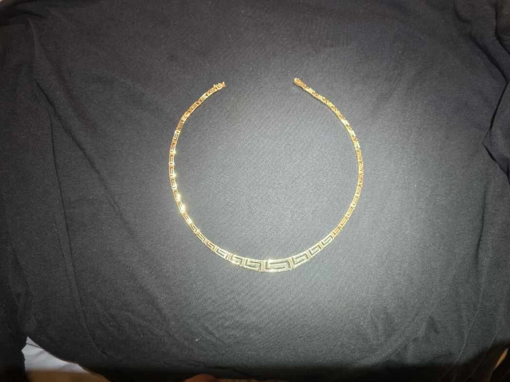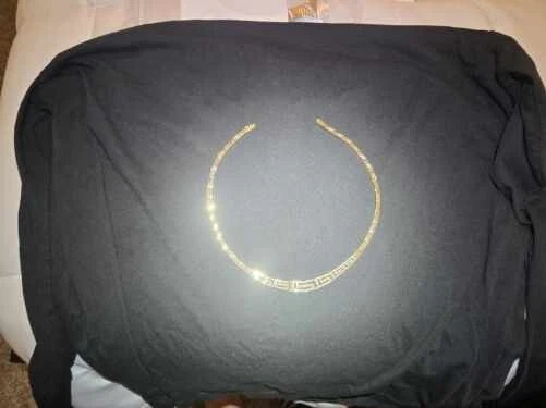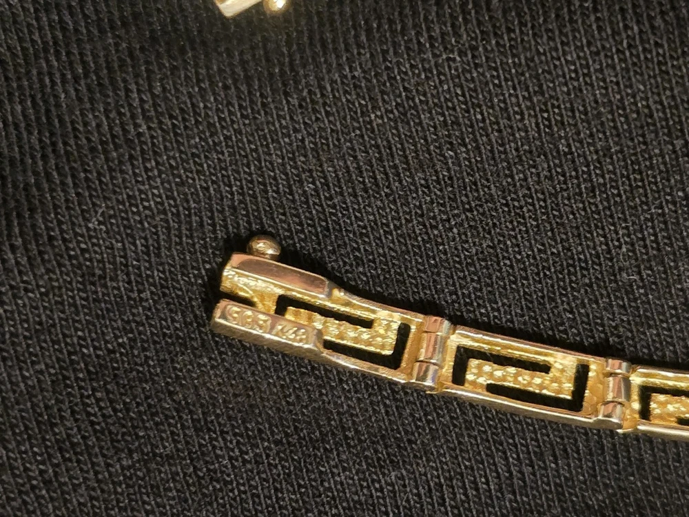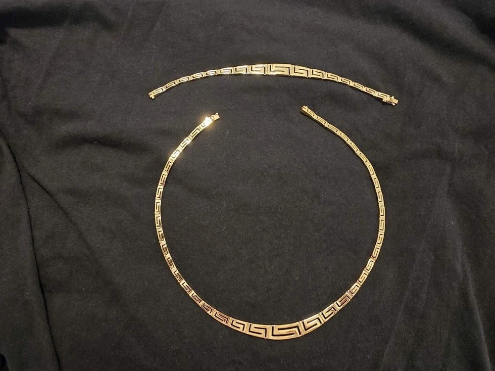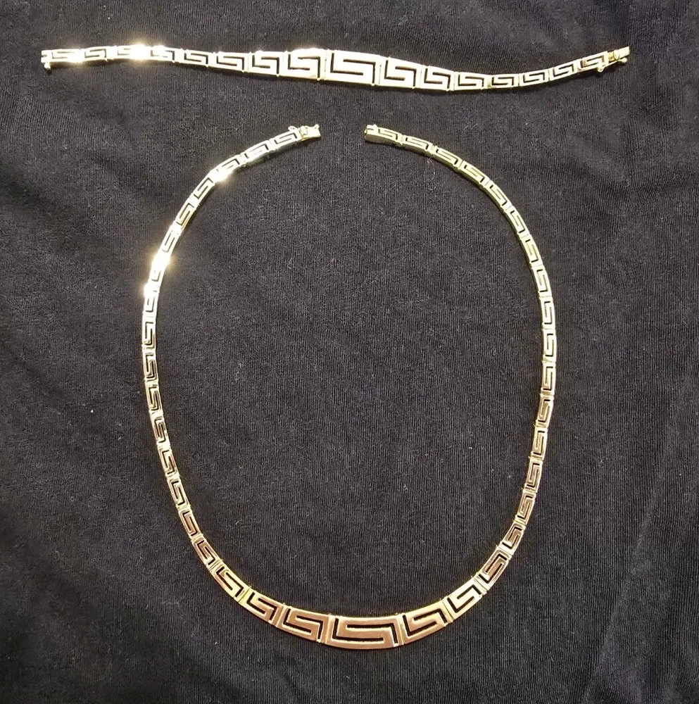 This stunning jewelry set features a 14k yellow gold Greek key necklace and bracelet. The intricate design of the necklace and bracelet showcases the beauty of the Greek key pattern. The set includes both a necklace and bracelet, making it perfect for any occasion. The metal purity is 14k and the set does not include any stones. This jewelry set is a must-have for any fine jewelry collection. Normal wear, might be flaws, nicks or chips associated with used jewelry