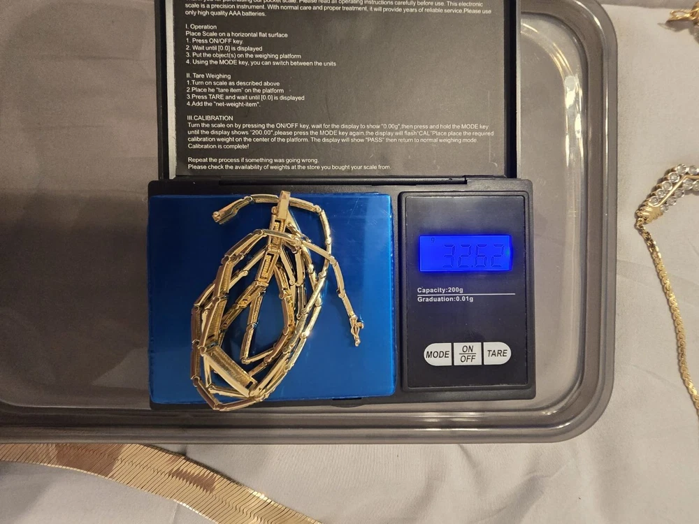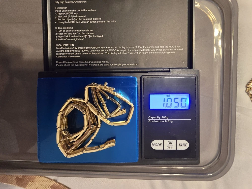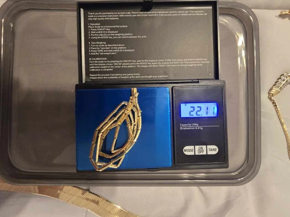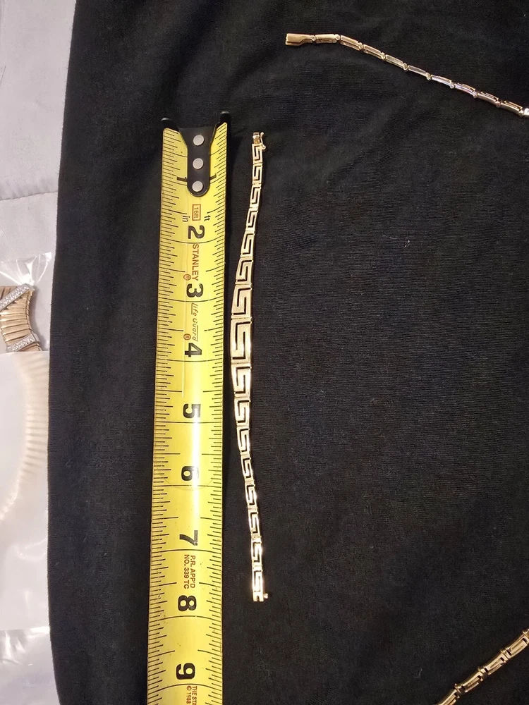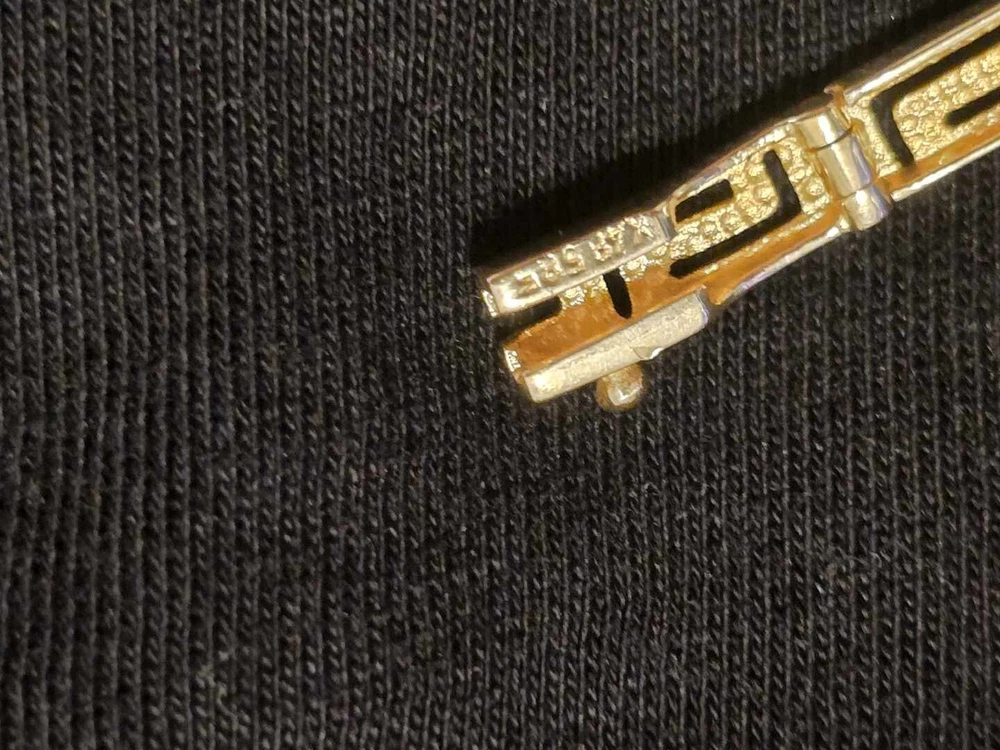 This stunning jewelry set features a 14k yellow gold Greek key necklace and bracelet. The intricate design of the necklace and bracelet showcases the beauty of the Greek key pattern. The set includes both a necklace and bracelet, making it perfect for any occasion. The metal purity is 14k and the set does not include any stones. This jewelry set is a must-have for any fine jewelry collection. Normal wear, might be flaws, nicks or chips associated with used jewelry