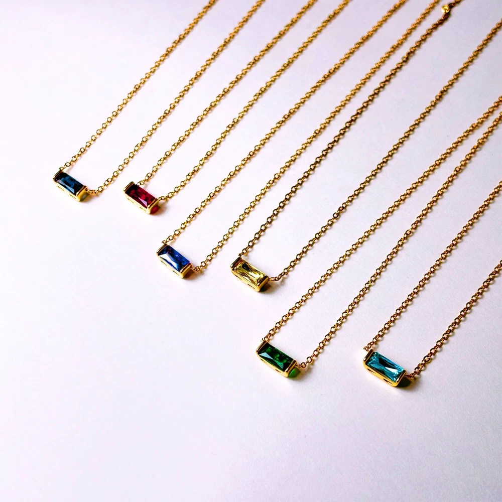 Elegant 14k Gold Ruby Necklace featuring a rectangle-cut gemstone. FAST & FREE SHIPPING! Features: ✨ Gemstone: Genuine rectangle-cut Ruby Crystal (~6x4mm), symbolizing love, passion, and strength. ✨ Material: 14k gold-plated chain and setting for a radiant, durable shine. ✨ Chain Length: Adjustable from 16 to 18 inches for a perfect fit. ✨ Design: Minimalist and lightweight, perfect for everyday wear or elevating any outfit. Available Gemstones While this listing highlights Ruby, explore other gorgeous birthstones to suit your needs: January: Garnet (Love & Vitality) February: Amethyst (Peace & Intuition) March: Aquamarine (Tranquility & Courage) April: Clear Crystal (Clarity & Strength) May: Emerald (Abundance & Growth) June: Alexandrite (Balance & Joy) August: Peridot (Prosperity & Healing) September: Sapphire (Wisdom & Royalty) October: Pink Tourmaline (Compassion & Healing) November: Yellow Topaz (Confidence & Energy) December: Blue Zircon (Hope & Purity) Perfect for Gifting: This birthstone jewelry makes an ideal gift for any occasion: Mother’s Day: A heartfelt gift for mom. Birthdays: Celebrate with a meaningful gemstone. Valentines or Holidays: A dainty yet thoughtful present. Anniversaries: Symbolize love with this elegant keepsake. Why You’ll Love It: Versatile Style: Pair it with formal or casual outfits for everyday elegance. Lightweight & Comfortable: Designed for all-day wear without compromising on style. Care Instructions: To maintain its brilliance: Avoid prolonged exposure to water, perfumes, or harsh chemicals. Store in a dry, soft pouch or jewelry box when not in use. Please Note: Each necklace is crafted with care, and gemstone hues may vary slightly due to their natural origin, making your piece truly unique. Disclaimer: Gemstone properties are based on traditional beliefs and are not a substitute for medical advice. For personalized medical guidance, consult a professional. Add a touch of passion and meaning to your jewelry collection or gift someone special with this 14k Gold Ruby Necklace. Its timeless design and symbolic charm make it the perfect July Birthstone Gift for any occasion. Order now and enjoy FAST & FREE SHIPPING!