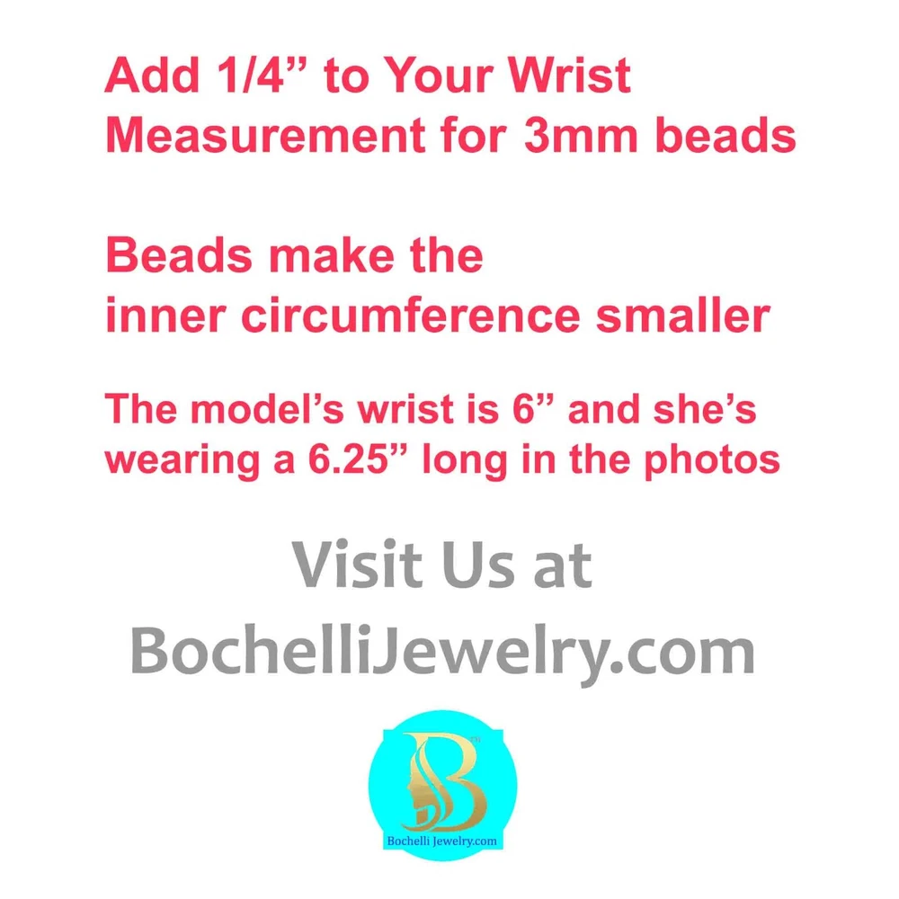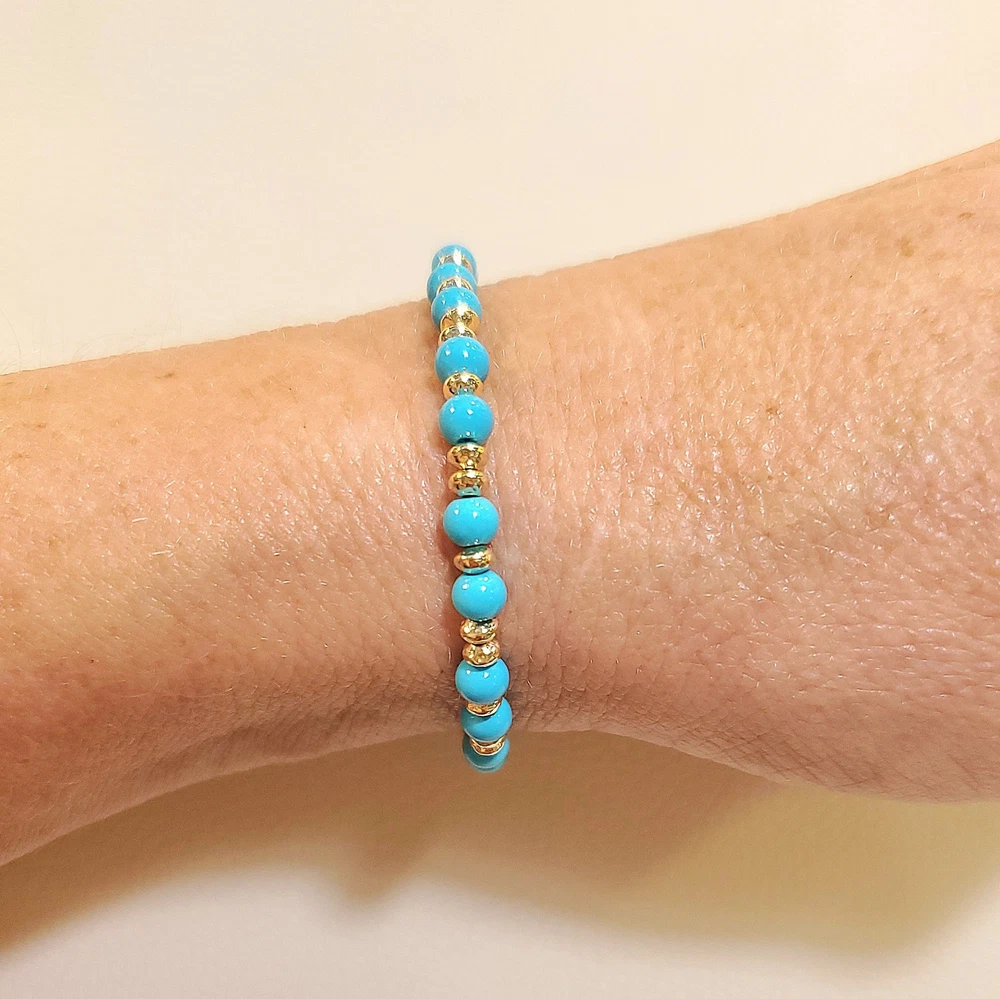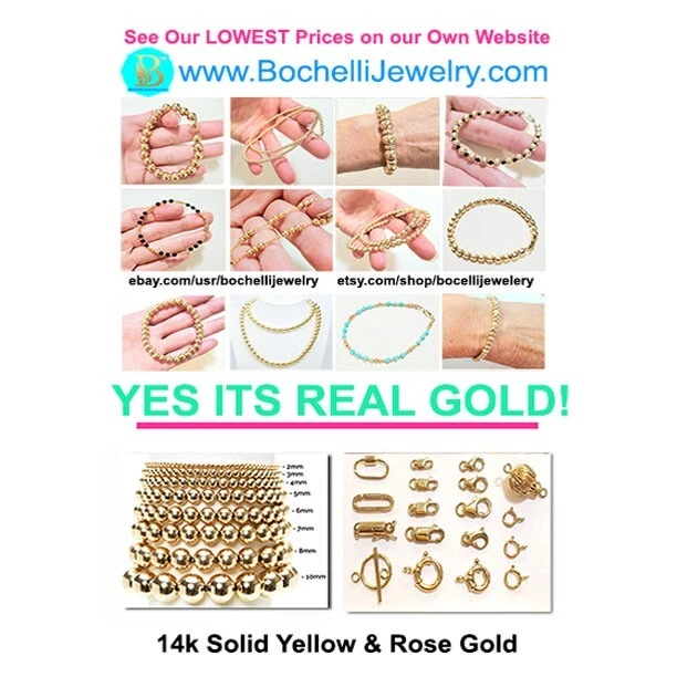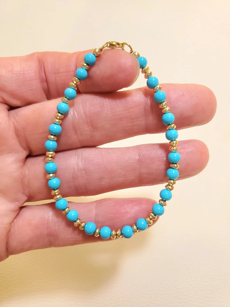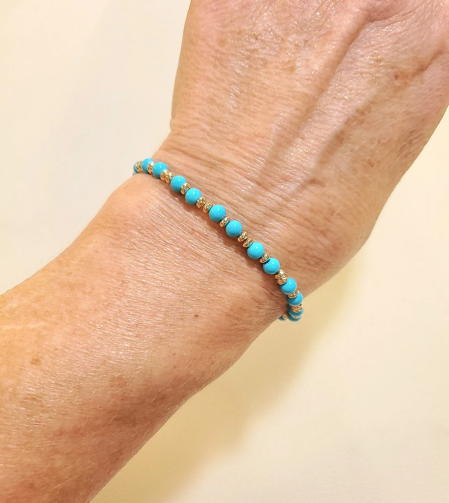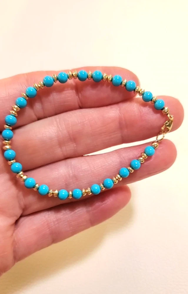 **GET LOWER PRICES ON OUR WEBSITE!! - BOCHELLIJEWELRY.COM - (not on here on our own website) ***THIS IS A HANDMADE ITEM AND IS STAMPED 14K ON THE CLASP*** THIS LISTING IS FOR ONE SOLID 14K GOLD and TURQUOISE BEAD BRACELET WITH LOBSTER CLASP Natural Sky Blue Sleeping Beauty 4mm Beads 14k Solid Yellow Gold 3mm Hammered Saucer Beads - Rose White Gold are NOT available. 14k Solid Yellow or Rose Gold 7mm Pear Shaped Lobster Clasp Flexible Non-Tarnish Steel Wire MEASURE YOUR WRIST!!! Before Ordering and ADD 1/2" (for 4-6mm beads only). DO NOT MEASURE ANOTHER BRACELET. OUR LENGTHS INCLUDE THE CLASP AND END PARTS. You can wrap a piece of string around then measure the string. * BUYER PAYS RETURN SHIPPING so please take a second to Measure and Determine The Length you need, so you can order the right length. Our Lengths Include the Clasp/End Parts. • IMPORTANT: Measuring a bracelet made of different size beads than you are ordering from us will cause errors. Measure around Your Wrist then add 1/4". • We Photograph Items on a Ruler Before Shipping. If you believe we sent the wrong size, send us a photo of it on your ruler before opening a return stating its the wrong size. Note: Objects in Close Up Photos can Seem Bigger than they are. Compare measurements in the listing to Your Own Ruler before purchasing. ** 3-12mm gold beads available. Hundreds of Styles! see our shop WHAT ITS STRUNG ON: IF IT SAYS CHAIN IN THE TITLE: then its strung on 14k Solid Gold Chain. IF IT DOES NOT: then it uses flexible steel beading wire, steel chain or clear stretchy elastic cord. Most bead jewelry sold online and in stores is strung on steel beading wire or stretch cord because solid gold flexible wire would break very easily and cost a lot more. Only bead sizes 3mm and larger can be strung on our 14k solid gold chain. The holes of most gemstone beads are too small for chain. The term Solid Gold is used to differentiate Our Real Gold items from the plated or gold-filled items Sold by Others. PRODUCTION TIME: OUR ITEMS ARE HANDMADE AFTER YOU ORDER THEM. They are Not ready to go items. We ship in 3 business days. A business day is Mon-Fri. The day you order Does Not count. If you order on Monday it will not be due to ship until Thursday, etc. Faster Shipping Speeds are available at checkout. We Do Not accept rush order requests. REFUNDS: ITEMS MUST BE RETURNED IN THE SAME NEW CONDITION THAT THEY WERE RECEIVED WITHIN 30 DAYS OF RECEIPT. ITEMS ARE SHIPPED IN A GIFT BOX INSIDE A PADDED ENVELOPE. RETURNS MUST BE PACKAGED THE SAME WAY to insure there is no damage to the items. Damaged Items are Not Returnable for Any Reason. INTERNATIONAL BUYERS: We ship Fedex for a flat fee of $35. FEDEX REQUIRES A PHONE NUMBER FOR ALL INTERNATIONAL PACKAGES. Please add it to your shipping address. Approximate delivery speed is 6-10 days (we cannot guarantee this but it has been typical in our experience).