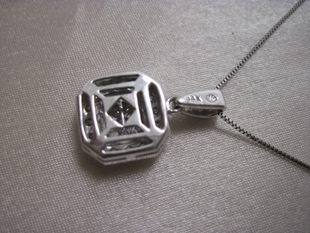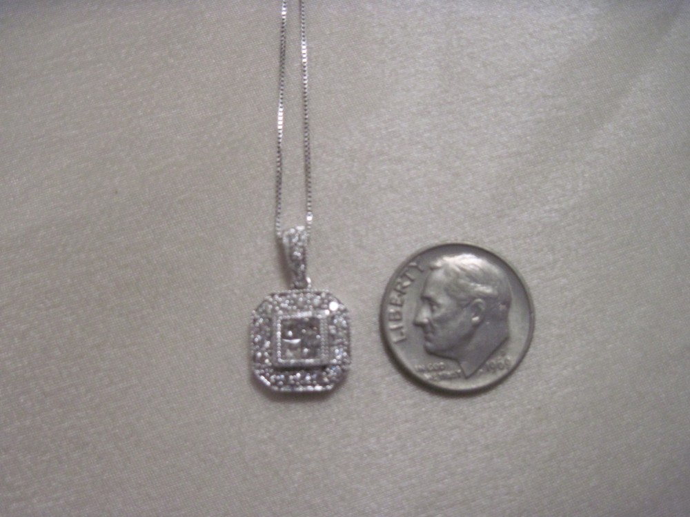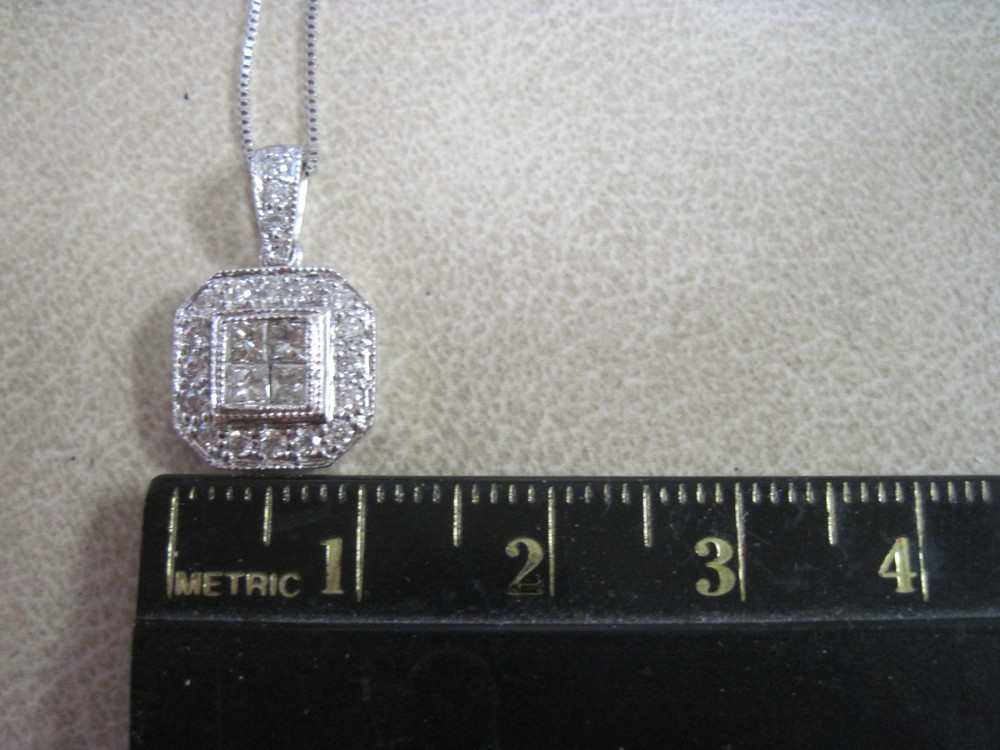 This 14k white solid gold pendant showcases four striking princess cut diamonds featured in the center of the pendant framed in a halo style of pav-set diamonds, offering brilliant sparkle with every movement. Total weight is 3 grams for chain and pendant. Crafted with precision and care, its cluster design delivers a refined expression of modern style that complements both upscale and everyday looks. Whether worn as a daily signature or for special occasions, this pendant blends timeless craftsmanship with contemporary sophistication, making it a standout piece in any refined jewelry collection. This beautiful pendant comes with an 18" 14k white solid gold chain.