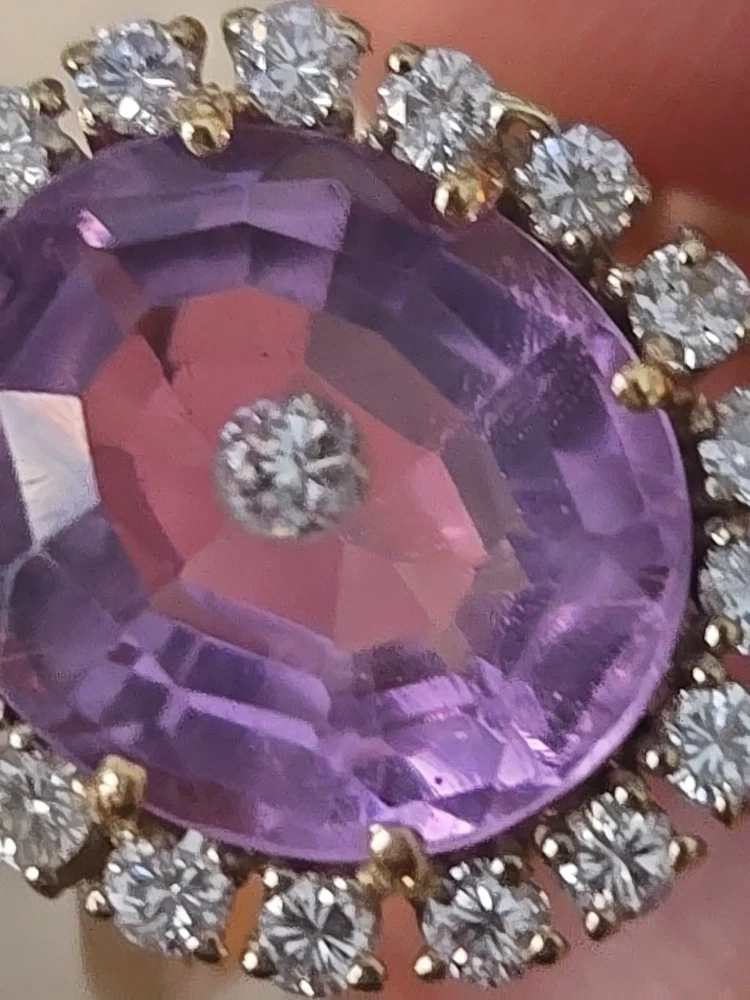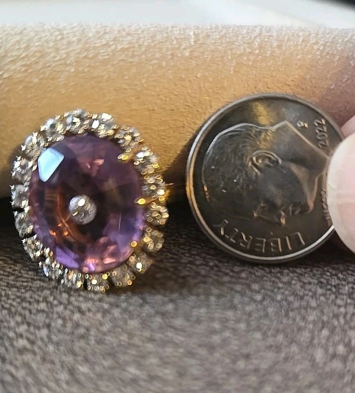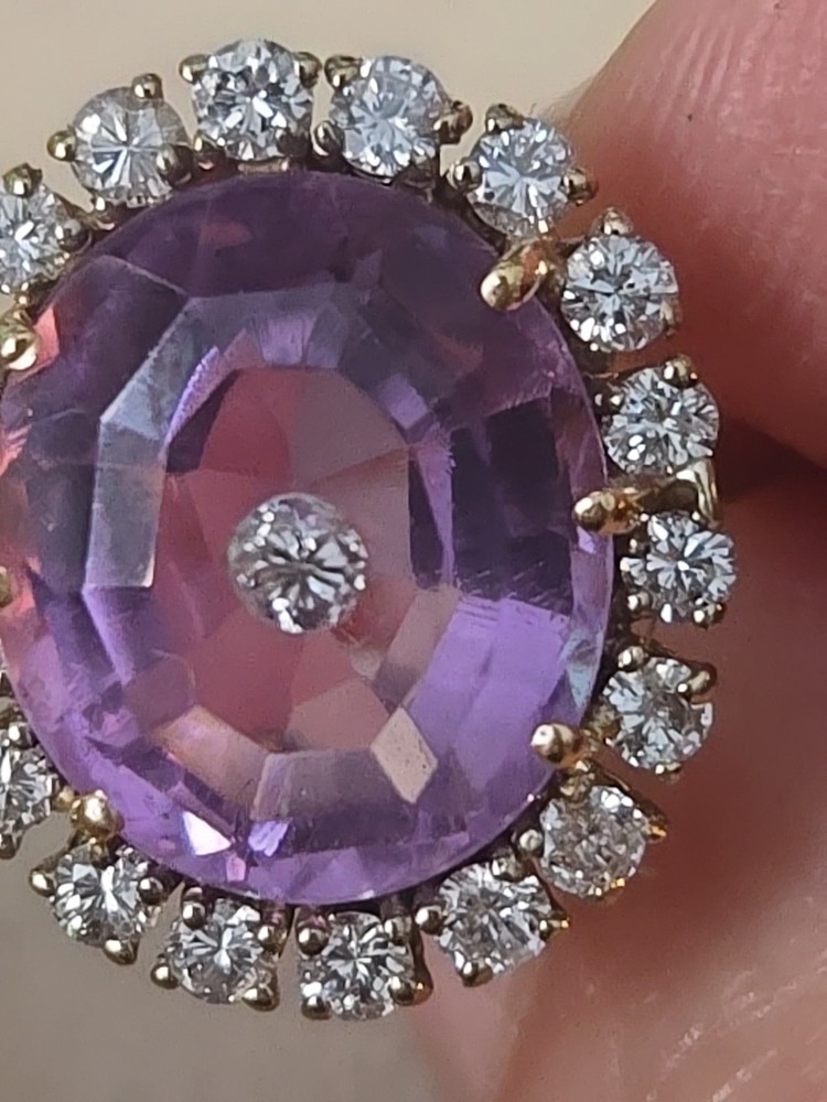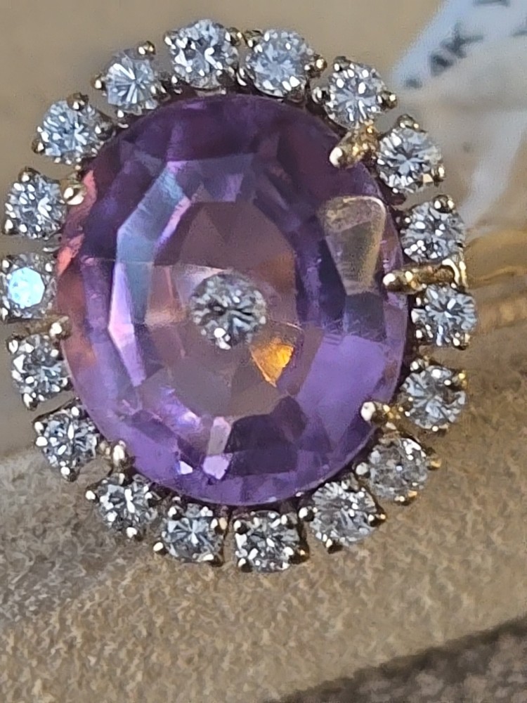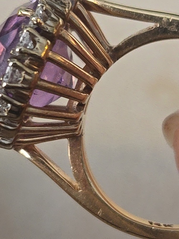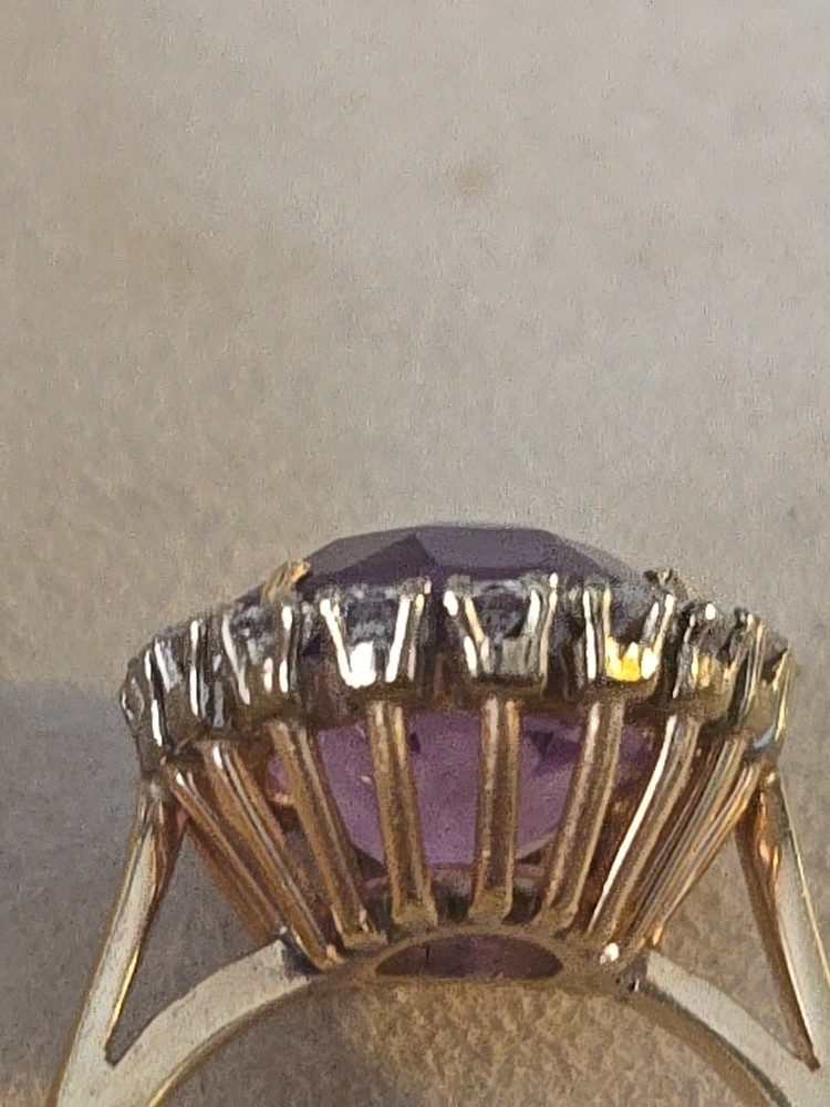 This 14k Yellow Gold Amethyst and Diamond Ring is a beautifully crafted piece of fine jewelry. . The oval-shaped amethyst as the main stone, with a beautiful purple color, exudes elegance and sophistication.