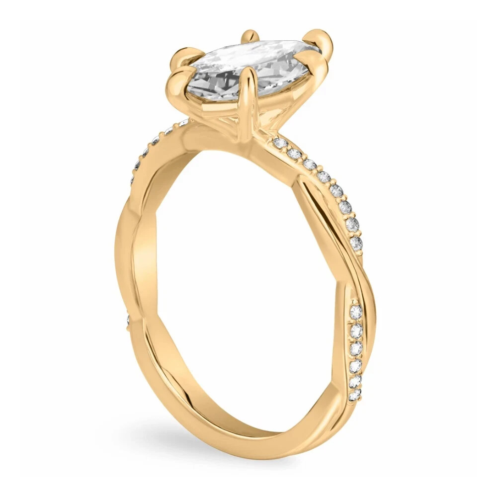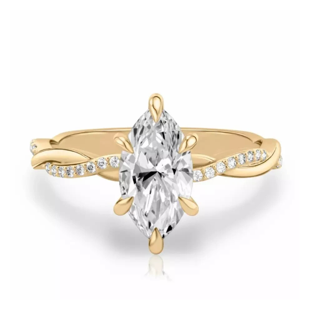 Elegance and sparkle come together in this exquisite 14k Yellow Gold Plated ring, featuring a 3.00CT marquise-cut natural moissanite diamond. Surrounded by a prong setting, the main stone boasts a VVS1 clarity grade, ensuring a near-flawless appearance that will capture everyone's attention. With a complement of accent diamonds, this wedding ring is a true testament to timeless beauty and craftsmanship. Crafted with care in the United States, this solitaire style ring is available in all sizes to ensure a perfect fit. The combination of a fancy light colored moissanite and the luster of 14k gold plating makes this piece a versatile addition to any jewelry collection, suitable for various occasions from anniversaries to birthdays. Sanavi_4215 brings you this luxurious piece with the option for personalized touches to make it uniquely yours.