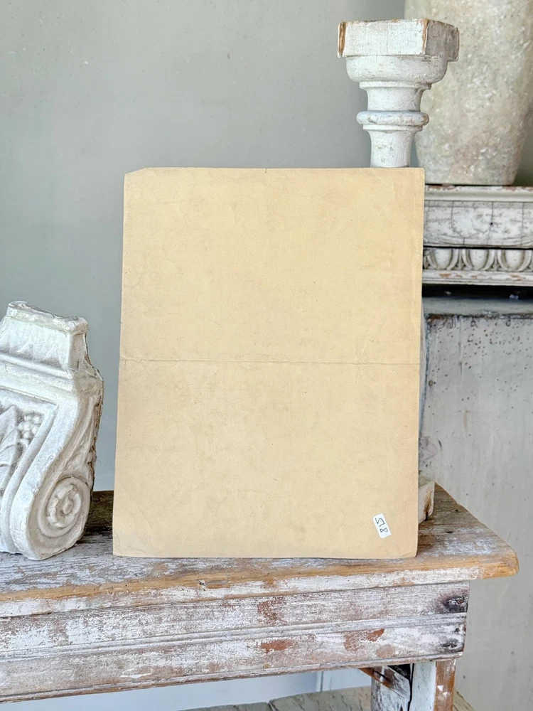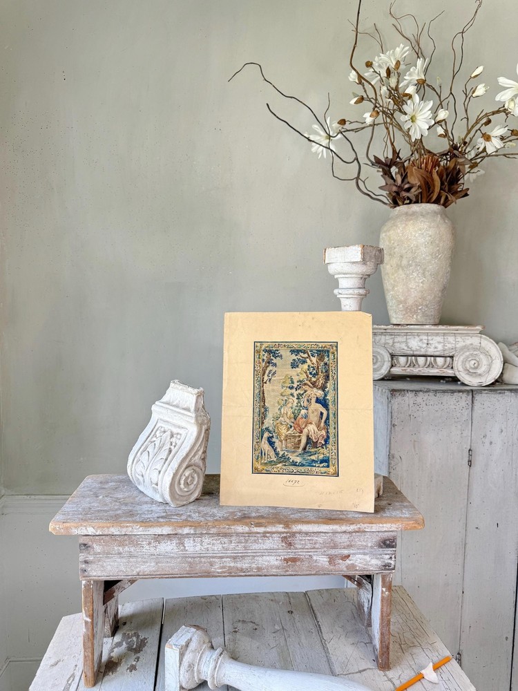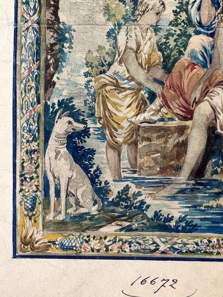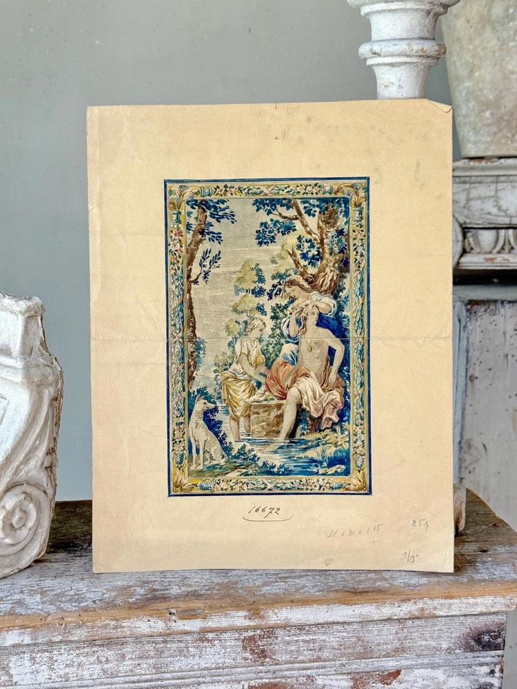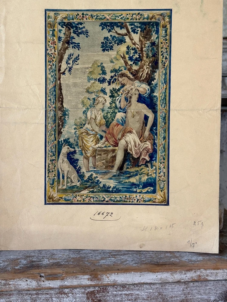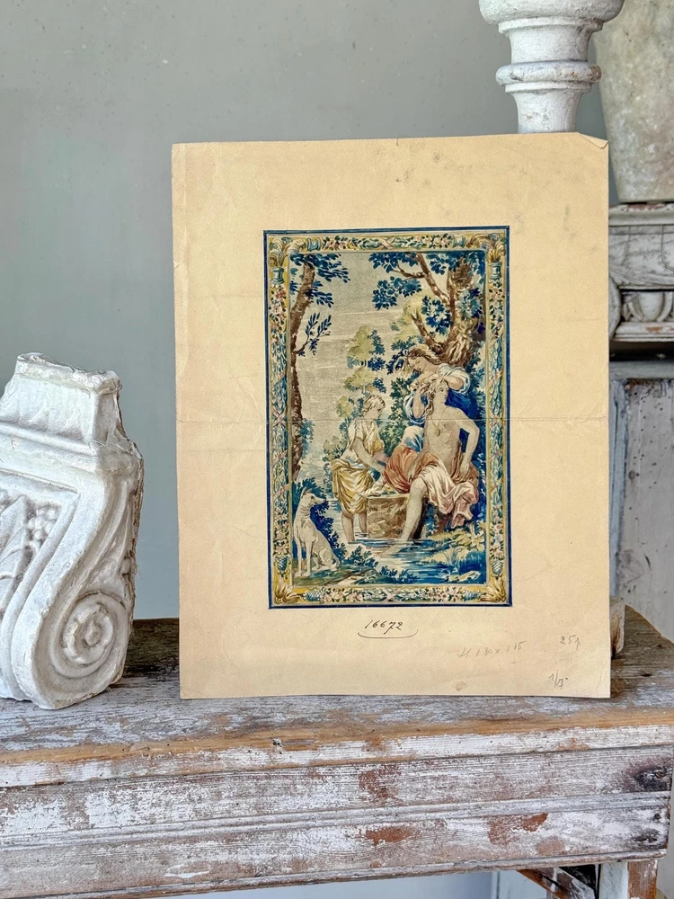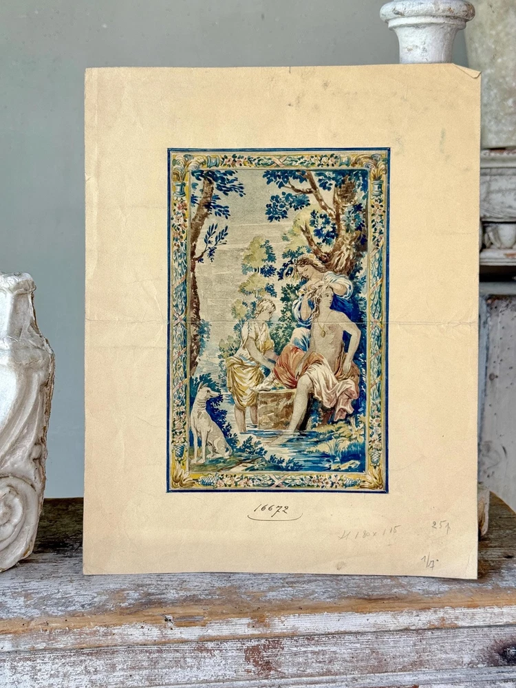 Welcome to The Textile Trunk ~ Thank you for over 25 wonderful years of helping bring these beautiful antique textiles and decorative items to life again! This piece is part of a rare collection of original French gouaches and textile design drawings I was so fortunate to acquire in France. Many of them are stylistically attributable to the Aubusson tradition, one is attributed to Aubusson though the group as a whole reflects a broad scope of European design influences. Some have stamps or markings, and others (like this one) speak for themselves with the delicacy of their brushwork and the pastoral beauty they capture. Some names and marks—including Italian design house Pietro Lauro, and others with White, Allom & Co., London, a well-known firm of decorators and historic interior designers. The presence of different stamps and numbering systems, as well as archival notations, suggests that these designs were originally produced by multiple ateliers, and later gathered into a single collection, likely during the early to mid-20th century when these historic works were preserved and reused for design reference and reproduction. I purchased from a dealer who had purchased from another dealer that had purchased them at auction. You will see on some a white contemporary sticker, most likely from the auction catalogue! To see all of the others in this collection, just search my store for the word drawing and they will appear! ~ ITEM SPECIFICS: Date: c.1790–1820 Origin: France Medium: Gouache on paper Style: Aubusson tapestry design Dimensions: approx. 14 x 12 inches Subject: Three bathing women in a forested setting, with a loyal white dog and an ornate floral border Condition: Some creasing, especially through the center, and light signs of age This extraordinary antique French gouache drawing likely served as a working design for a woven Aubusson tapestry. It captures a serene scene of three women at a woodland water source, one seated with drapery loosely covering her body, another tending to her hair, and a third filling a jug. A white dog watches calmly nearby, and the whole composition is enclosed by an ornate floral and latticework border. The artistry is superb, with saturated hues of coral, blue, and gold that have mellowed beautifully over time. Gouache and ink drawings like this were essential studio tools for tapestry designers and weavers in France, especially during the golden age of Aubusson production. Their artistic quality and technical clarity served as vital visual guides in translating vision to loom. These one-of-a-kind works often disappeared over time, lost in the archives of dissolved firms or simply discarded. Their rediscovery today offers a rare and beautiful link to the artistry behind French textile history. The craftsmanship and artistic designs are not just decorative but also reflect a rich textile heritage of France and Europe. Inventory: G33