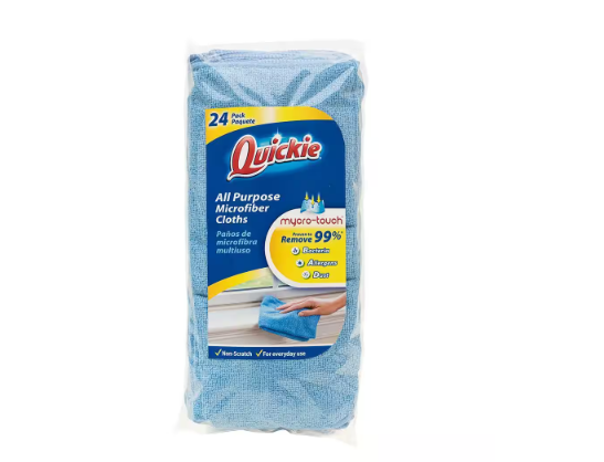 About This Product The Quickie Microfiber Towels (24-pack) are all-purpose. They're great for kitchen and bathroom surfaces and countertops. You can also use them on wood, glass and your car. Highlights 24-pack Microfiber material for more effective cleaning, reaching into surface pores and crevices Great for wet and dry applications Reusable Machine washable