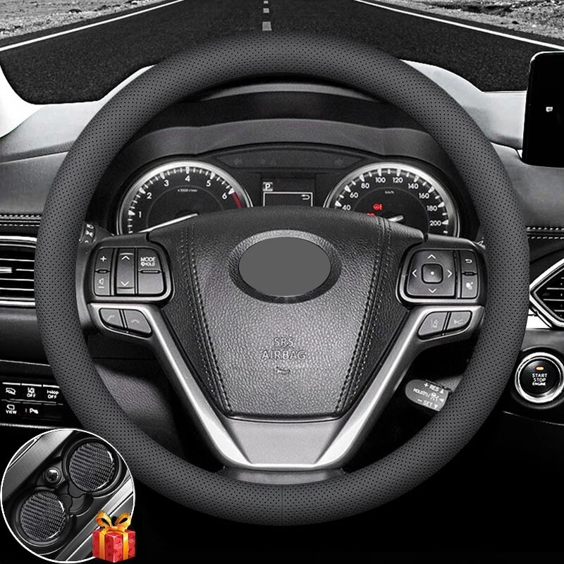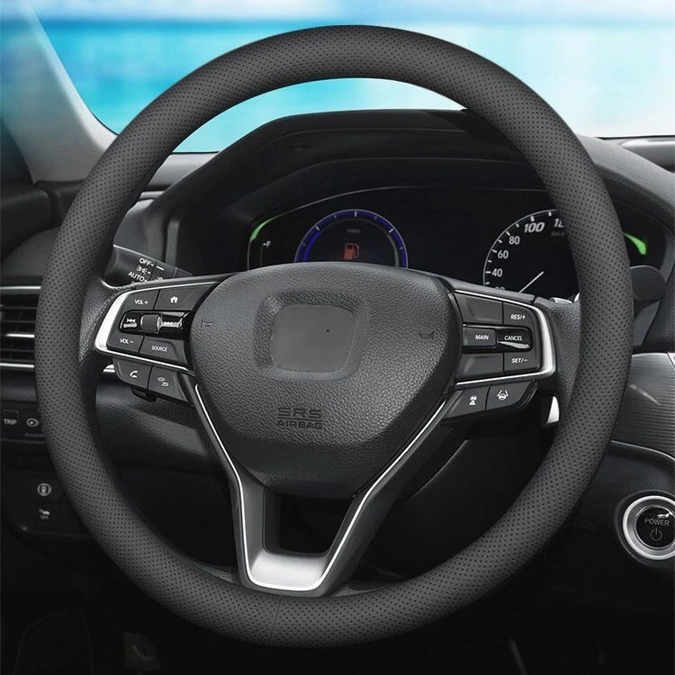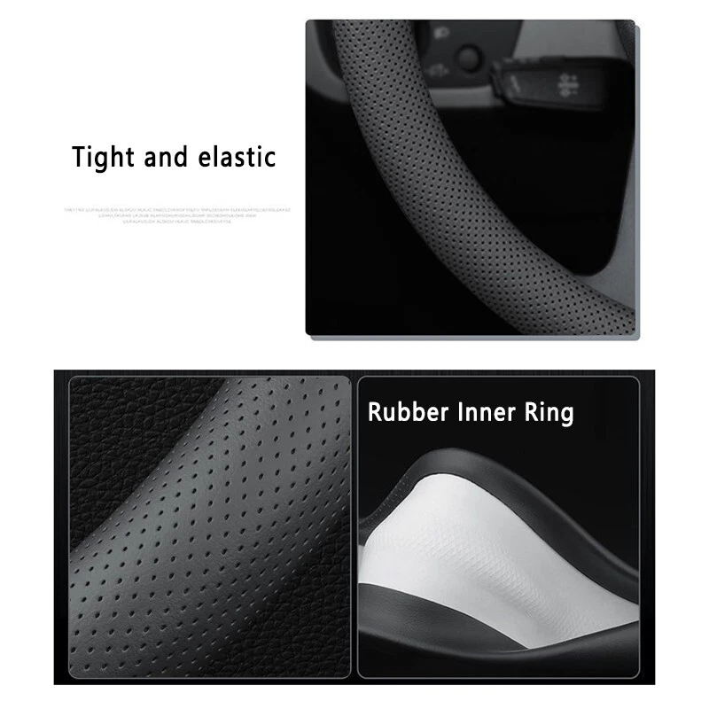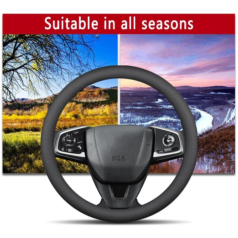 Please confirm it fits your steering wheel before making order. Thank you. Descriptions: 100% Brand New Material: Leather Size: 15" & 38cm (Fit for 14.5-15" round steering wheel) Color: Black Features: 1.Attractive and Durable 2.Elegance and luxury design, fashion and practical combination. 3.Top quality soft touch leather, add comfort, safety and protection for your journey. 4.Ergonomic design provides excellent grip, skidproof with tyre pattern and dotted design. 5.Comfortable hand feel, massage your palm to relieve drive fatigue, suitable for all season. Packaging included: 1 x Steering Wheel Cover