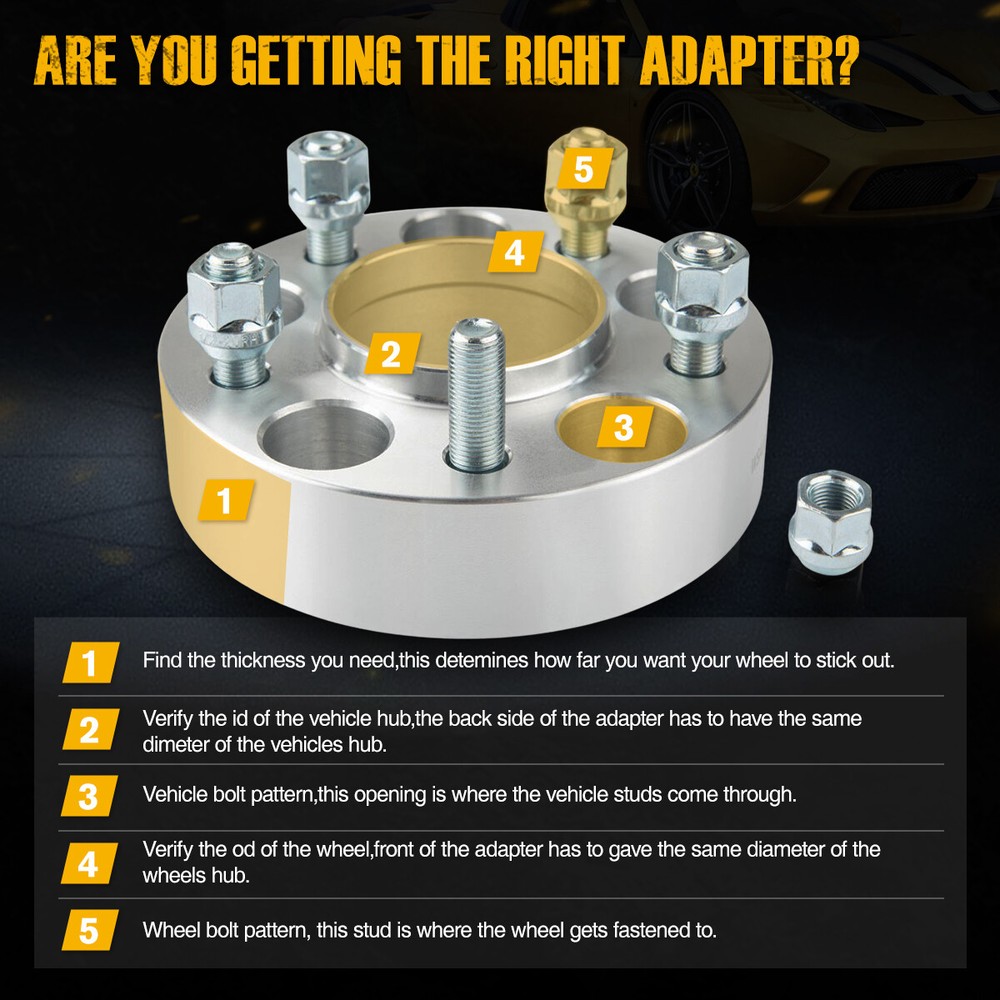 Specifications: Thickness: 1.5" Vehicle bolt pattern: 5x4.5 Wheel bolt pattern: 5x4.5 Thread pinch: 1/2" Inner Diameter: 70.5mm Fitment: For Ford 1964-1973 Mustang (5-Lug vehicles only) 1994-2014 Mustang 2007-2014 Edge 2003-2004 Mach I 1991-2007 Crown Victoria 1982-1990 Bronco (Excludes XLT Model) 1981-2011 Ranger (because of our hubcentric lip, this may not fit on the front hub. Please message us for details) 1995-2010 Explorer & Sport Trac (because of our hubcentric lip, this may not fit on the front hub of 2WD models. Please message us for details) For Lincoln 1984-1992 Mark 7 (MK7) 1982-2004 Town Car 2003-2010 Aviator For Mercury 1996-2010 Mountaineer For Mazda 1991-1994 Navajo 1998-2001 B2500 1994-2007 B3000 1994-2009 B4000 Package List: 4Pcs Wheel Spacers How to choose the correct wheel spacers: STEP. Check 3 specifications The following is the easy and simple way to check the bolt pattern/PCD, center/hub bore and thread pitch . If you donot sure, please just message us with the year, make and model of vehicle. 1). Check Vehicle Bolt Pattern/PCD For 4-lug, 6-lug, 8-lug, measure the segment from the CENTER of a bolt hole TO the CENTER of another hole. 5 lug is different, you need to measure the back of the hole to the center of the second bolt hole (not center point). (See Bolt Pattern Diagram below) 2). Check Vehicle Hub/Center Bore Size Measure the diam of the center bore on hub, make sure the spacer's diam is equal to or bigger than the axle diameter. 3). Check Vehicle Thread Pitch There are different types of studs, such as M12x1.25, M14x1.5, M12x1.5, 1/2"x20, 9/16"x18, please make sure the studs of wheel spacers is the same as the vehicle's, otherwise the spacer will not fit. How to install the wheel spacers: 1). IMPORTANT - ADAPTER OR SPACER MUST SIT FLUSH AGAINST VEHICLE HUB, AND WHEEL MUST SIT FLUSH AGAINST ADAPTER OR SPACER! Stock studs must be trimmed down (shortened) if they protrude past the surface of the adapter or spacer. If not, vibration or other problems can occur. Some wheels have pockets that may allow for no stud trimming. If not, studs MUST be trimmed. 2). Make sure the mounting surface (vehicle hub) is clean and For flat, and remove all retaining clips. 3). Install the adapter to the vehicle, with the proper lug nuts, and torque to manufacturer’s wheel torque specs. 4). Install the wheel to the adapter by torquing to the vehicle manufacturer’s wheel torque specifications (again, max 140 ft-lbs). Please assure the proper thread engagement (6 to 8 full turns) on lug nuts or bolts. 5). Drive the vehicle. If no problems (noise, vibration, anything out of the ordinary), drive about 5 miles, then re-torque the lug nuts attaching the spacer or adapter to the hub. High-Quality Raw Materials CNC Precision Manufactured,6061 T6 Forged Aluminum Alloy Disc Body,ensure driving safety and improve your driving experience Easy Installation Clean the studs thoroughly and remove any excessive dirt, oil, grease etc Highly recommended professional installation Widen Tire Spacing After the tire spacing is widened, you can enjoy more room for modification on your cars performance and looking,such as installing a larger wheel wheel Bolt Pattern Guide The following is the easy and simple way to check the bolt pattern/PCD, center/hub bore and thread pitch. If you donot sure, please just message us with the year, make and model of vehicle. Check Compatibility How to Confirm Whether the Product Fits for Your Vehicle? Payment 1) We accepts all major credit cards via PayPal: MasterCard, Visa, American Express and Discover. 2) We will only ship to the confirmed PayPal shipping address given with the payment. 3) If you want to ship to other address, please change your PayPal shipping address before you make payment. 4) To avoid initiating an unpaid item claim, please pay within 7 days. Shipping Policy 1) We will ship item locally for US buyers. Usually for US buyers it will take about 5-7 business days to reach. If you don't get it, please contact us firstly, we'll try our best to support you. 2) For US customers, all items will be shipped out within 1-2 business days with cleared payment. Please included your phone number to the payment note for prompt and secure shipment. 3) Tracking numbers for all orders are added to eBay once they have been dispatched; please login to eBay to find the tracking information for your order. Contact Us If you have ANY questions with shipping, product or service, please Contact Us first before leaving feedback/write a review or filing a return case. We will solve the problem! We always put our customers first and your satisfaction is guaranteed. Our Tech's are here to serve you. Email us and our expert team will swiftly diagnose the issue and offer the best solution within 12-24 business hours. All off-hours emails will be answered within 24-48 hours. About returns If you send email to us,In our working hours will be resumed within 48 hours. Please feel free to contact us if you have any questions: Dear my friend,we appreciate your support.And our goal is service you well and give you a pleasant shopping time in our store. ✅Dear customer, when you want to return or exchange goods (Please contact us first, instead of directly initiating a dispute) 1: Contact the seller first 2: Send pictures: outer packaging&scanned labels&item itself&with complete accessories, etc necessary condition Rule A: The original packaging of the item is in an unused state. Rule B: The outer packaging must not have any damage. 3: Obtain return label 4: Delivered Projects - Payment Repayment ✅A 15% restocking and shelving fee will be charged for returns or exchanges that are not caused by the seller and are in good condition. Exchange will not charge restocking fees or shipping fees due to transportation errors ✅Priority In case of the following reasons, the freight will be borne by the buyer 1: Unexpected order 2: Find a better price 3: Change your mind 4: Buy more items/ma