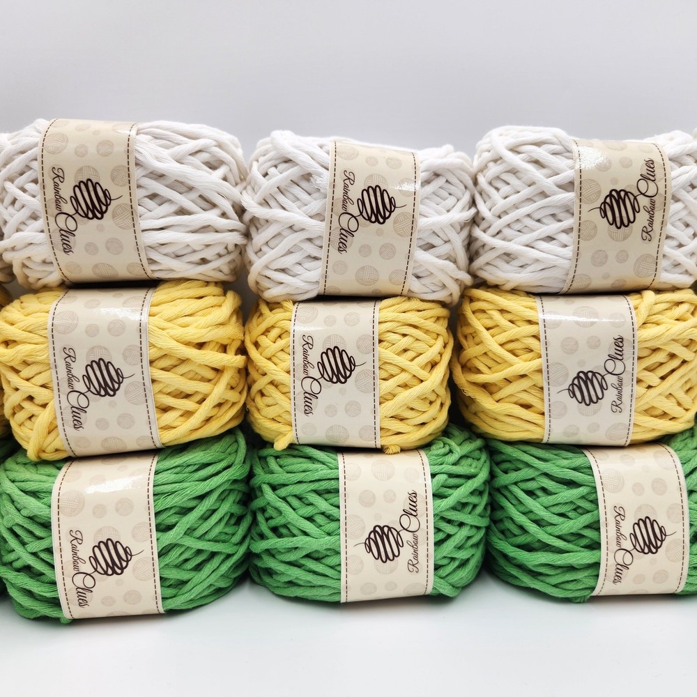 15 Balls Macrame Cotton Cord 7 mm Crochet Knitting Yarn Baskets Wall Decor New with tags 15 balls set - sells only as a set, will not separate Colors - spring green, yellow, ivory Unusual thick yarn with light twist Thickness is approximately 7 mm Product specifications: Content: 75% cotton, 25% acrylic Yarn Group: super bulky Each ball weight - 200 g (7 oz), length - 65 m (213 ft) Recommended needle/crochet hook size: 10-15 mm / 12-15 mm This yarn is suitable for knitting rugs, thick decorative blankets, baskets. Also can be used for macrame and panels. It is soft, supple and durable.