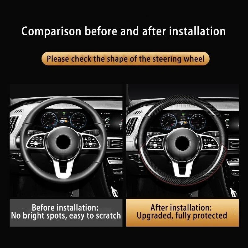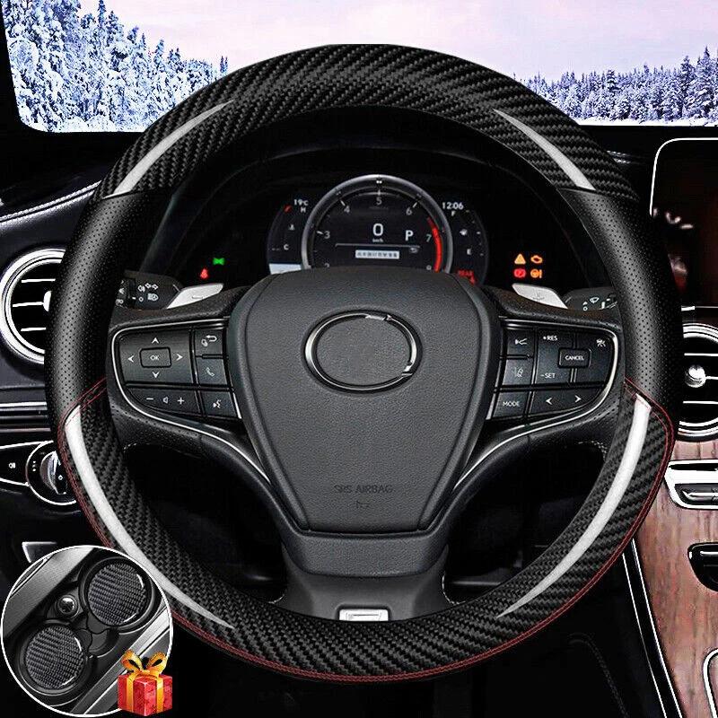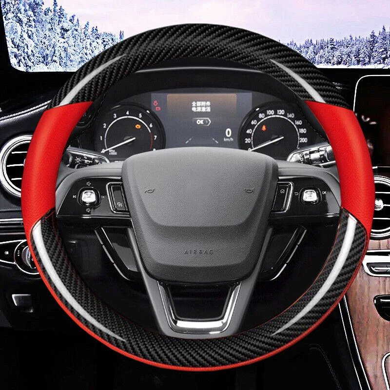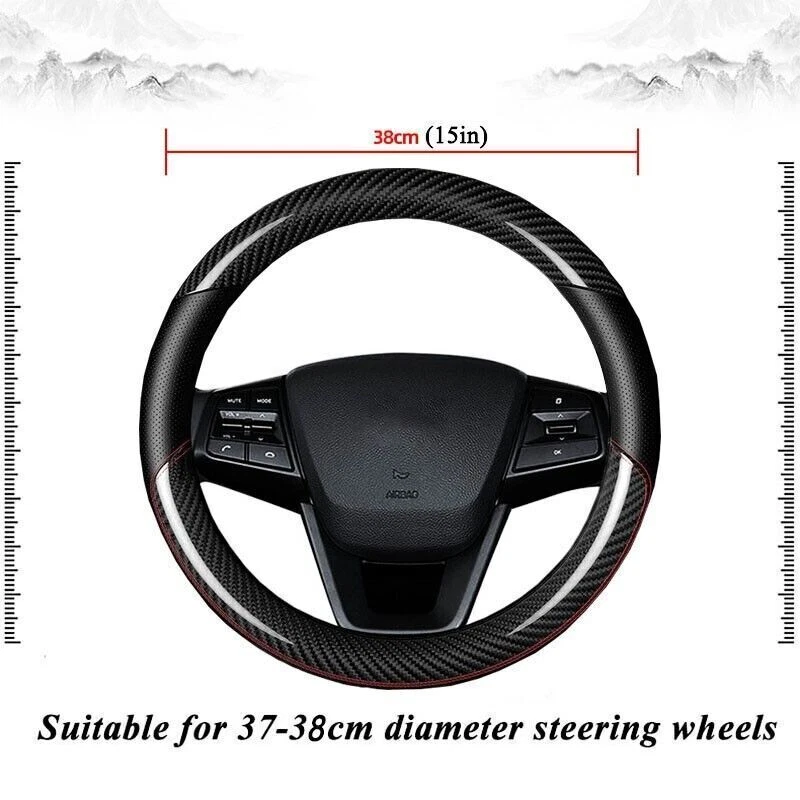 Please confirm it fits your steering wheel before making order. Thank you. Descriptions: 100% Brand New Material: Carbon Fiber Leather Size: 15" & 38cm (Fit for 14.5-15" round steering wheel) Color: Black / Red We default to send black cover, leave a note for red one. Features: 1.Attractive and Durable 2.Elegance and luxury design, fashion and practical combination. 3.Top quality soft touch leather and carbon fiber, add comfort, safety and protection for your journey. 4.Ergonomic design provides excellent grip, skidproof with tyre pattern and dotted design. 5.Comfortable hand feel, massage your palm to relieve drive fatigue, suitable for all season. Packaging included: 1 x Steering Wheel Cover