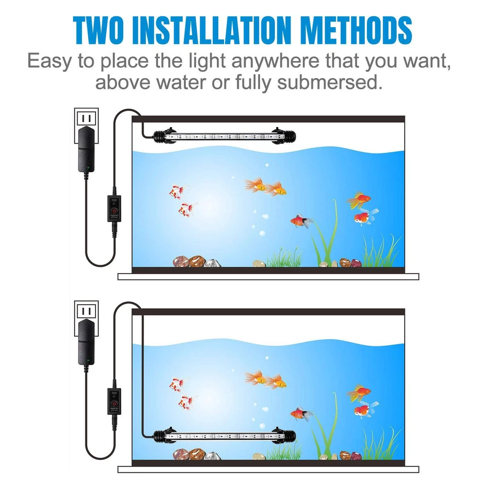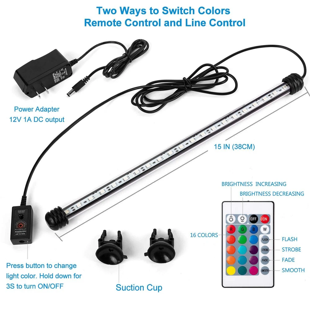 【FULLY SUBMERSIBLE AND EASY TO INSTALL】The LED aquarium fish tank light meets the IP68 waterproof standard and can be used underwater, both salt water and freshwater are supported. It can be easily mounted on the smooth surface such as fish tank cover or background glass with upgraded adjustable suction cup accessories. This 15 inch long aquarium led light is suitable for 20~30 gallon aquarium starter kit large fish tank. 【WIRELESS AND WIRED REMOTE CONTROL WITH MEMORY】Please aim at the receiver with wireless remote controller, you can easily turn ON/OFF, adjust brightness, change color, select transition effect (flash, strobe, fade, smooth). You can also short press or long press the button on the wired remote control to change color or turn ON/OFF the light. These settings are stored in memory and remain the same when you turn on the waterproof fish tank lights again. 【DIMMABLE FULL SPECTRUM RGB AQUARIUM LIGHT, GOOD FOR PLANT AND FISH】This full spectrum LED grow light is adjustable in brightness, good for the growth of live plants. The led aquarium lamp has excellent color rendering, which make it a suitable colorful lighting fixture for fish, betta, glofish, gold fish, guppies, jellyfish, crab, turtle. You can use it to decorate air stone bubbles, coral, reef, rockery, terrarium, fountain, etc. 【WIDELY USED LED MULTI-COLOR DECORATION LIGHT】This led aquarium light is upgraded from the classic LED strip light to enhance the ability of waterproof and dustproof. In addition, there are 4 transition effects and 16 colors available: White, Red, Green, Blue, Orange, Yellow, Purple, Pink, Teal etc. So it can be used for saltwater freshwater fish tank, gamer room, tv night light, children's room, wine cabinet, bar, RV, glass window, mural, artificial landscape, halloween and Christmas. 【BRIGHTER AND SAFER FISH TANK AQUARIUM LIGHT】Upgraded RGB 5050 LED light bulb is 20% brighter than other fluorescent light and is designed to be reliable, durable and power saving. The submersible led aquarium light is powered by 12V low voltage which is safe for people or fish. If there's any quality problem within one year, we will mail you a new one as free replacement.