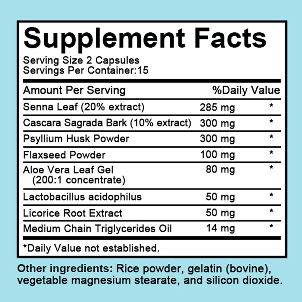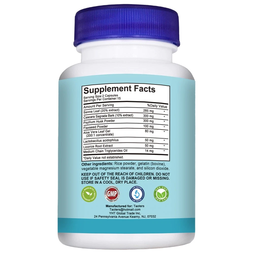 When to Take: After Meal MPN: N/A Shelf Life: 2 years Department: Unisex Production Date: 08/2025 FDA Registration Number: 18296790194 Flavor: Unflavored Ingredients: Aloe Vera, Psyllium Husk, Senna Features: All Natural, Easy to Swallow, Eco-Friendly Country of Origin: China gtin13: Does not apply Brand: TAOTERS Active Ingredients: Flaxseed, Lactobacillus acidophilus Formulation: Capsule Item Weight: 1.45oz Main Purpose: Cleansing, Detox, Weight Management UPC: Does not apply Expiration Date: 08/2027 Number of Pills: 30
