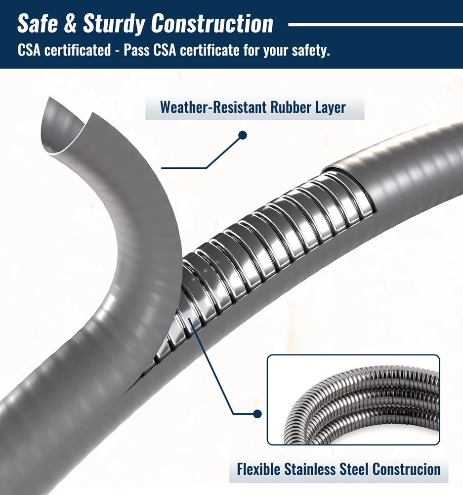 SAFE & HIGH QUALITY - Natural rubber outer layer with flexible stainless steel inner layer structure, which is weather-resistant, anti-cracking, anti-rust and durable. Pass CSA certificate, providing safety and no leakage EASY TO INSTALL - 100% solid brass 1/2" quick connect/disconnect fitting, help you install and remove the gas hose more easily WIDELY USED - This gas hose is used to connect natural gas or LP gas appliances to an existing low pressure supply. Ideal for Weber natural grills, generator, patio heaters, fire table, pizza ovens and many more gas appliances. NATURAL GAS - This gas hose can connect natural gas/propane gas appliances to natural gas supply. Connecting LPG grills, natural gas grills and RVs to permanent fuel sources. SIZE - 15 feet 1/2" ID hose with 1/2" male quick disconnect plug x 1/2" female flare, large capacity gas supply hose provides ample gas flow