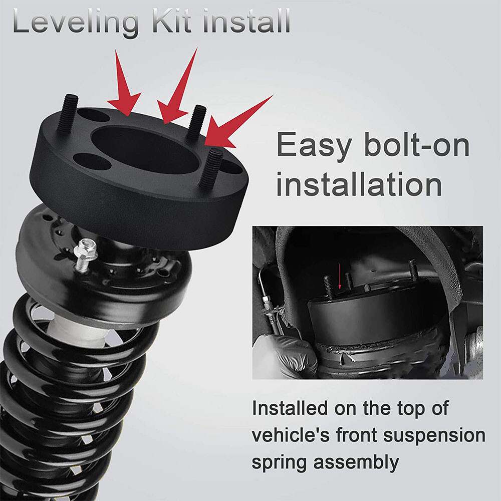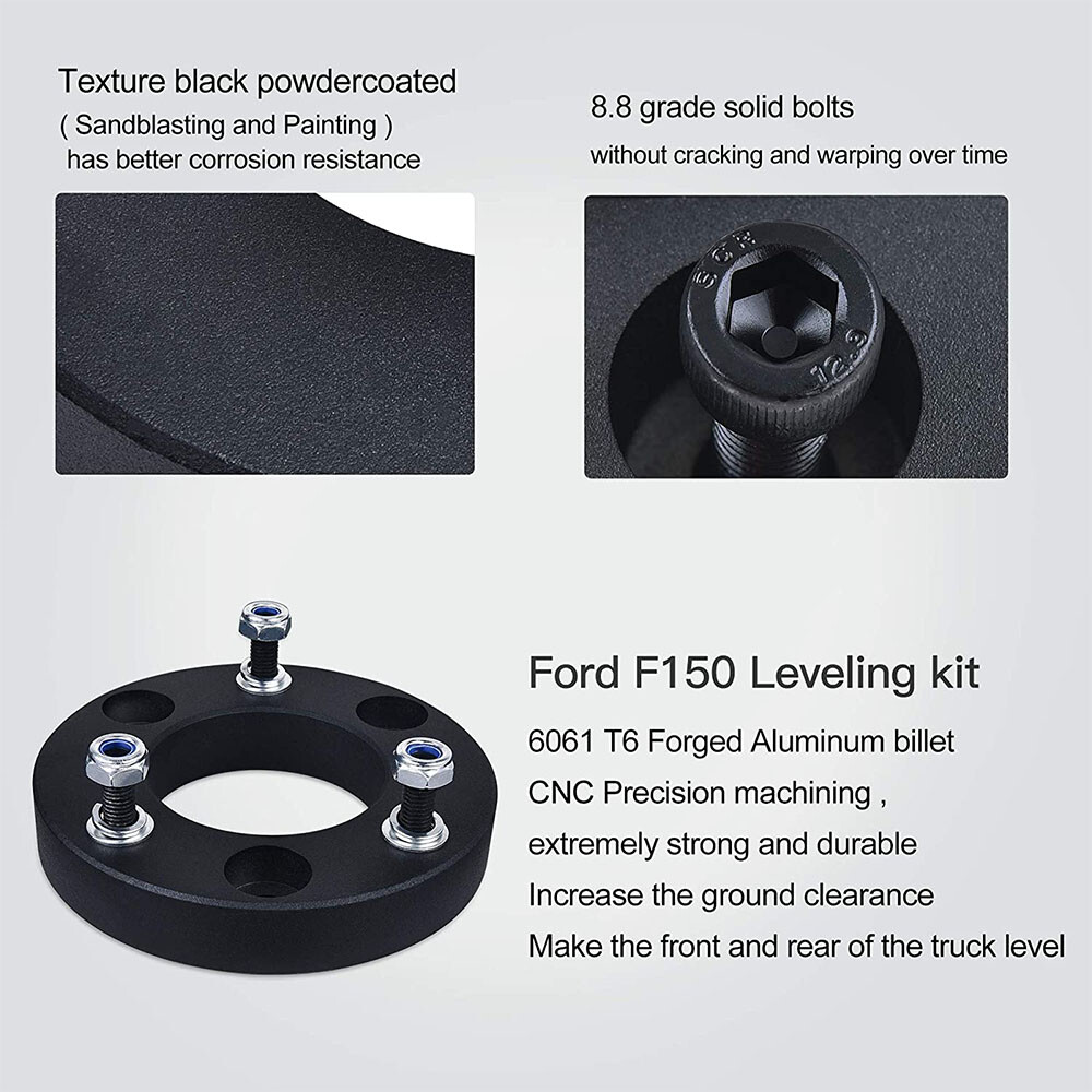 Fitment Fits for Ford F150 2WD/4WD 2004-2023 Fits for Ford Expedition 2003-2018 Fits for Lincoln Mark LT base 2005-2008 Note:Leveling kit will raise your car 3.0 inch in the front. The ratio between lift height and kit thickness is not 1:1 because of suspension geometry. Package: 2 x Front Leveling Lift Kit 1 Set Nut 1.5" Front Ford Lift Kit Leveling Kit for 2004-2024 Ford F150 Expedition Mark LT 【Lift 1.5 inch for your F150】: Please note that the leveling kit's thickness less than 1.5 inch because of suspension geometry,the ratio between lift height and kit thickness is not 1:1.,but it will lift the truck to a true 1.5 inch. 【Application】: Compatible with 2004-2020 2021 2022 2023 2024 F150 (2WD 4WD) 【Aggressive Look】: Once you install it on your truck,it will give your truck a cool look.Accurate numerical control precision and high quality, ensure your driving safe and comfortable. 【Process and Material】: Forged from 6061-T6 aluminum alloy,CNC automatic processing,surface anodic oxidation and heat treatment,not only ensure high precision and stability,but also enhance the hardness and corrosion resistance of the material,The product itself is also equipped with 12.9 class studs. 【Warranty and Services】: Leveling kits are covered by 1 years warranty,Please feel free to contact us with any questions regarding our products and services. Fitment Fits for Ford F150 2WD/4WD 2004-2023 Fits for Ford Expedition 2003-2018 Fits for Lincoln Mark LT base 2005-2008 Note:Leveling kit will raise your car 3.0 inch in the front. The ratio between lift height and kit thickness is not 1:1 because of suspension geometry. Package: 2 x Front Leveling Lift Kit 1 Set Nut.