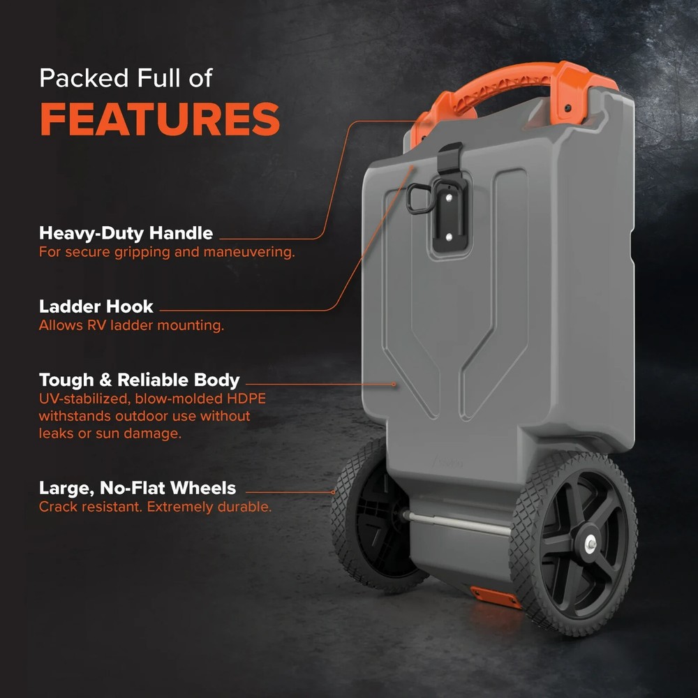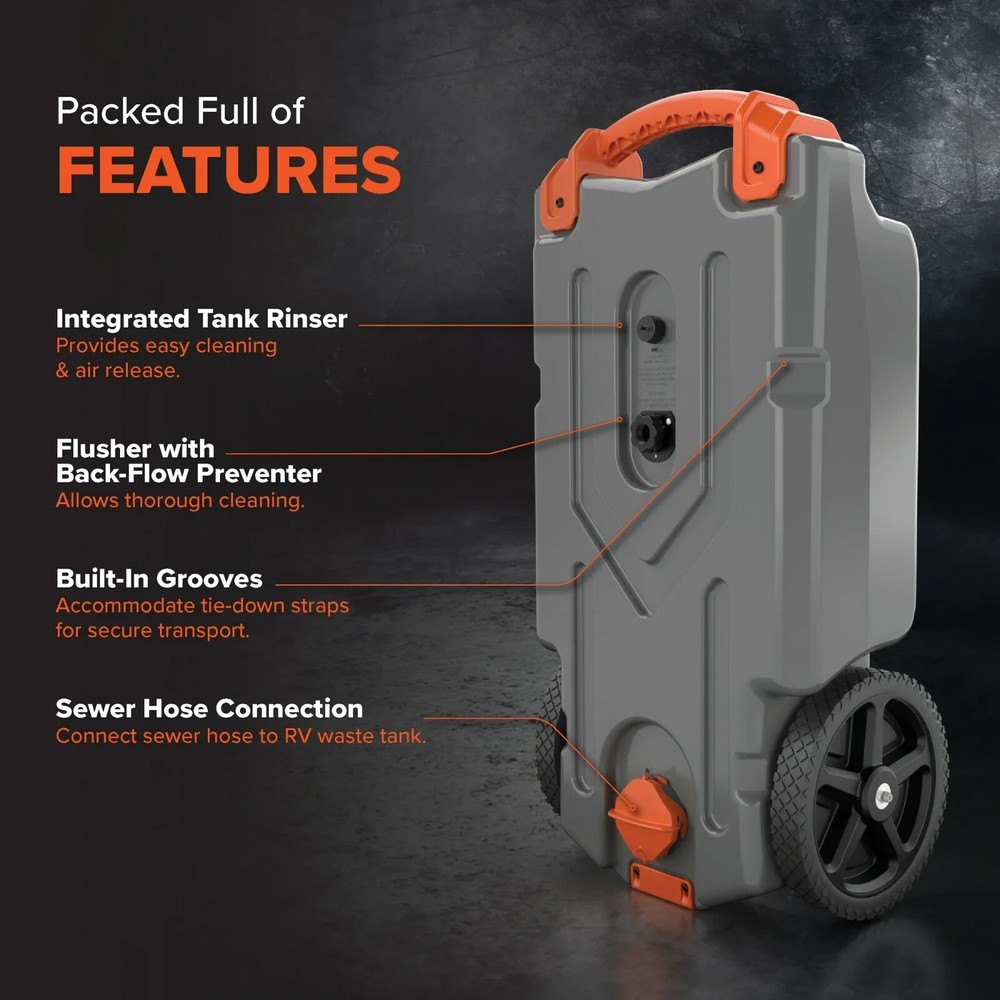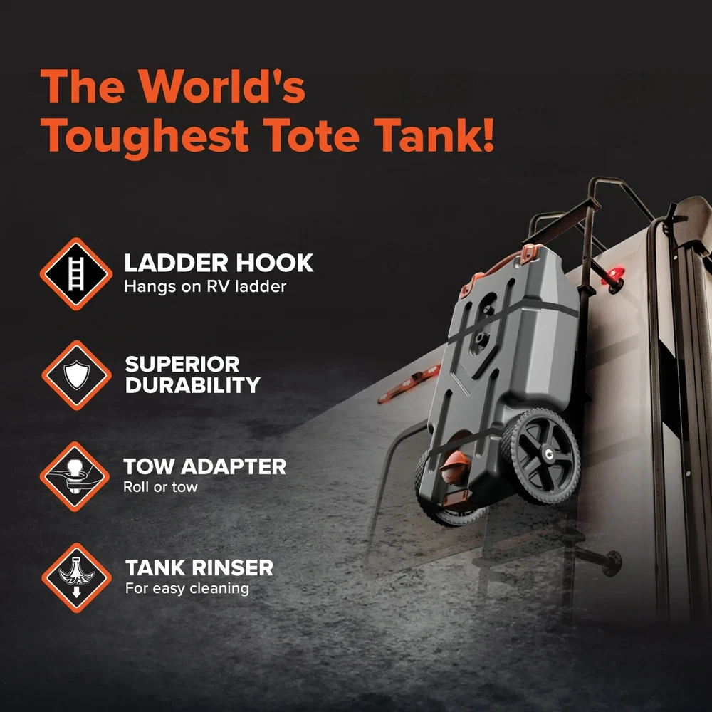Product details Upgrade your RV waste management with the Camco Rhino 15-Gallon RV portable waste tank. This durable and easy-to-use camper must-have simplifies waste disposal at dump stations, making your outdoor adventures hassle-free. Built to withstand travel and various environments, this camping essential ensures optimal performance wherever you roam. Cleaning and maintenance are a breeze thanks to its thoughtful design. Experience a new standard in waste tank functionality with this RV must-have. Get Camco's waste tank for enhanced outdoor adventures! Color: Multicolor; Model#: 39000; Brand: Camco SIMPLIFY RV WASTE DISPOSAL: Make waste disposal hassle-free with Camco's portable waste tank. Easily transport waste from your RV black water tank to a dump station— perfect for when you're parked far away & your RV sewer hose won't reach. EFFORTLESS TRANSPORT: Haul your waste with ease with no-flat wheels built for any terrain, an oversized handle for easy maneuvering, & a steel tow adapter for effortless towing behind a truck or golf cart. TOUGH & RELIABLE: Measuring 20 ½″ (L) x 13″ (W) x 32 1/4″ (H) and weighing 31.5 lb, this RV essential is constructed from durable, UV-stabilized blow-molded HDPE. It withstands outdoor use without leaks or sun damage. PATENTED DESIGN: Rhino Tote Tanks are proudly manufactured with premium materials for unmatched durability. The patented design ensures exceptional craftsmanship and quality. RV TOTE TANK FEATURES: Rhino’s 15-Gallon Tote Tank is equipped with (2) oversized wheels, a large handle, tank rinser, and ladder hook. KIT ACCESSORIES: This kit includes (1) tote tank, (1) 3' sewer hose w/swivel fittings, (1) 15″ female/female grey water hose, (1) clear elbow w/4-in-1, (1) clear double bayonet elbow, (3) storage caps, (2) caps w/lanyards, & (1) steel tow adapter. EASY TO CLEAN: This RV camping must-have features a drain hole that allows thorough tank emptying. The smooth interior makes cleaning a breeze and the integrated tank rinser ensures a thorough cleanse with minimal effort. SIMPLE TO STORE: Hang the portable waste water tank on your camper ladder using the ladder hook. Secure the Camco tote with tie-down straps that fit into grooves on the tank body. The 3' sewer hose compresses for storage. Color: Multicolor; Model#: 39000
