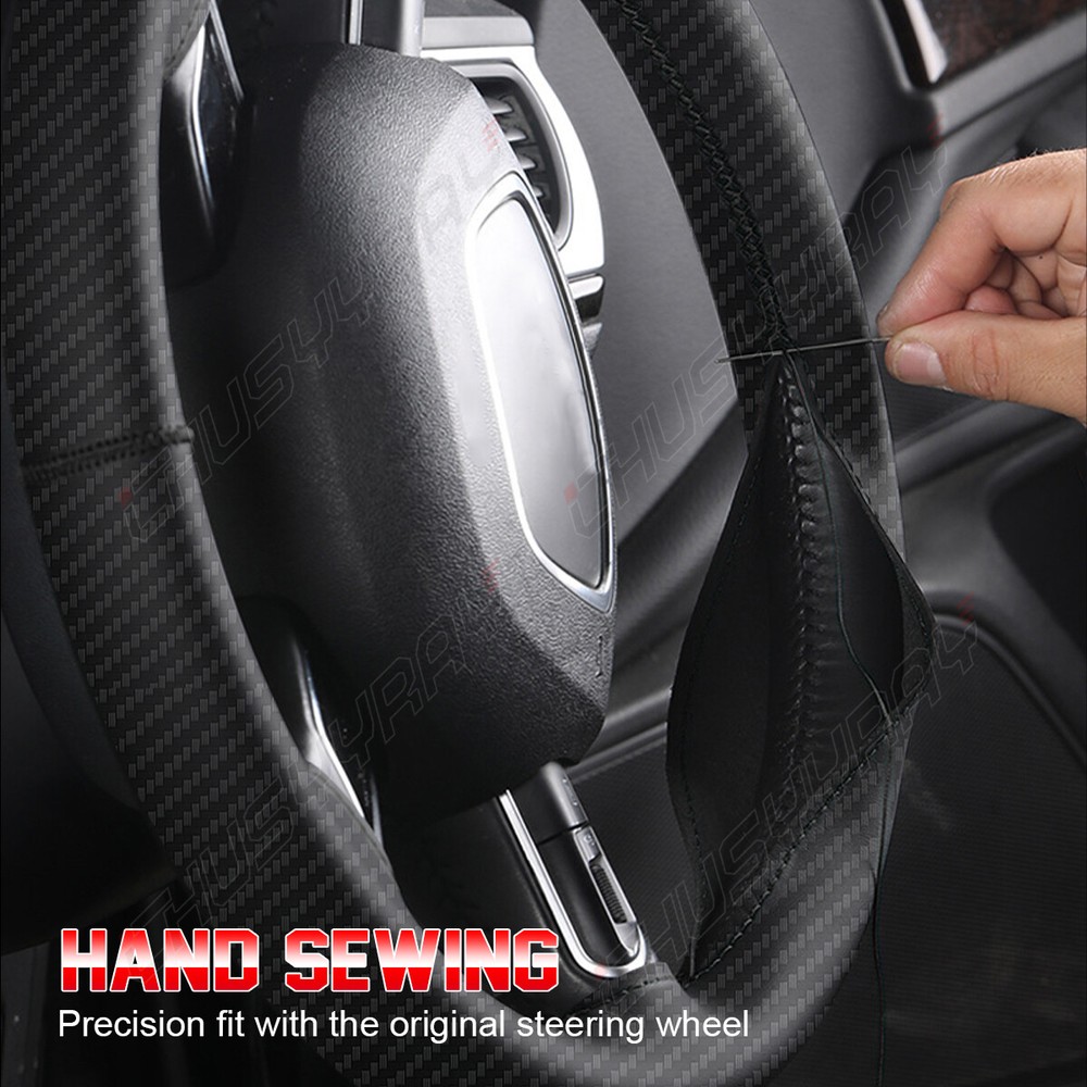 Please confirm it fits your steering wheel before making order. Thank you. Descriptions: 100% Brand New Material: Faux Carbon Fiber Leather Size: 15" & 38cm (Fit for 14.5-15" round steering wheel) Color: Black Features: 1.Attractive and Durable 2.Elegance and luxury design, fashion and practical combination. 3.Top quality soft touch leather and carbon fiber, add comfort, safety and protection for your journey. 4.Ergonomic design provides excellent grip, skidproof with tyre pattern and dotted design. 5.Comfortable hand feel, massage your palm to relieve drive fatigue, suitable for all season. Packaging included: 1 x Steering Wheel Cover