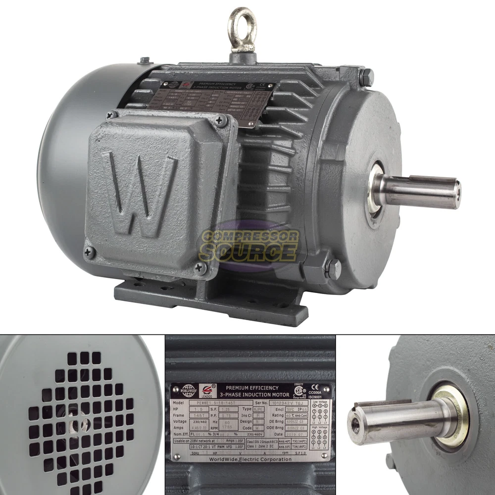 Color: Gray NEMA Design Letter: Design B (General Purpose) Insulation Class: F (Max 311°F) Rated Load (HP): 1 1/2 Full Load Amps: 4.45 Brand: Worldwide Design: Heavy Duty/Premium Efficiency NEMA Frame Suffix: T Base RPM: 1755 Shaft Type: Keyed Custom Bundle: No Mounting Type: Base-Mounted Nominal Rated Input Voltage: 230 V, 460 V AC Phase: Three Phase AC Frequency Rating: 60 Hz Current Type: AC MPN: PEWWE1.5-18-145T Features: TEFC / IP55 Fully Enclosed Body Style: 3 Phase Electric Motor Modified Item: No Enclosure Type: TEFC (Totally Enclosed Fan Cooled) gtin13: 684659127013 Service Factor: 1.25 UPC: 684659127013 Shaft Diameter: 7/8 in IEC Frame Size: 145T IP Rating: IP55 Model: PEWWE1.5-18-145T