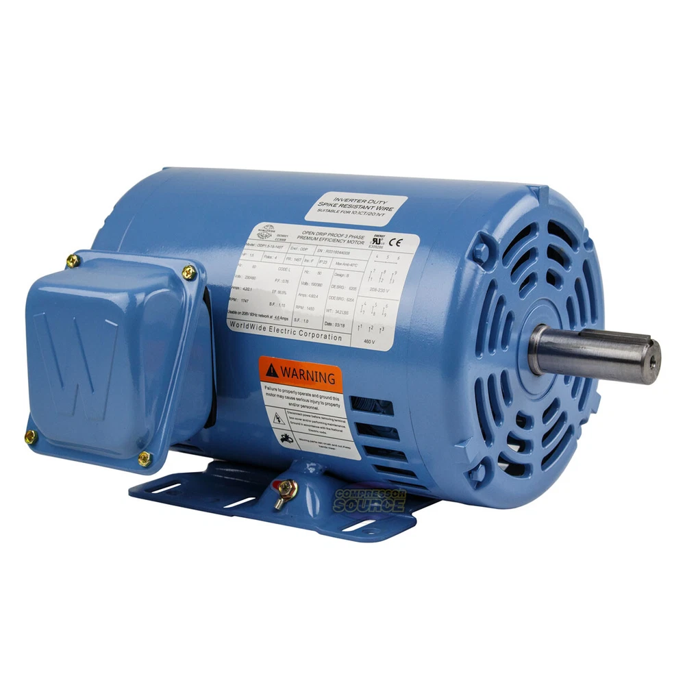 1.5 horsepower, open drip proof, 3 phase premium efficiency electric motor with rigid base. Worldwide Electric designs and manufactures motors with quality and reliability in mind. This motor features Class F insulation, fan cooling, a 1.15 service factor (1.00 at 50Hz), is a premium efficiency inverter duty motor. Designed for 60Hz, features a ODP enclosure, and is a 145T frame. YOUR COMPRESSOR, COMPRESSOR PARTS, & ACCESSORY SUPERSTORE! Home All Products Contact Us Returns About Us MENU Store Pages Home All Products Contact Us Returns About Us Store Categories 1/2" RapidAir Maxline 3/4" RapidAir Maxline 3/8" RapidAir Garage Piping Accessories Air Compressor Oil Air Compressor Pumps Air Compressors Air Hoses Air Tank Manifolds Belts Blow Guns & Tire Inflators Check Valves Compressor Rebuilt Kits Couplers & Fittings Electric Motors Gauges Hose Reels Intake Filters Magnetic Starters Pressure Switches Pulleys A Section Regulators, Filters, & Oilers Relief Valves Tank Moisture Drains Throttle Cont Cables & Valves Tire Inflators Unloader Valves Vibration Pads Other GREAT SELECTION OF PRODUCTS / FAST SHIPPING / FREE SHIPPING ON MOST ITEMS / PRODUCT KNOWLEDGE & SUPPORT Store Categories 1/2" RapidAir Maxline 3/4" RapidAir Maxline 3/8" RapidAir Garage Piping Accessories Air Compressor Oil Air Compressor Pumps Air Compressors Air Hoses Air Tank Manifolds Belts Blow Guns & Tire Inflators Check Valves Compressor Rebuilt Kits Couplers & Fittings Electric Motors Gauges Hose Reels Intake Filters Magnetic Starters Pressure Switches Pulleys A Section Regulators, Filters, & Oilers Relief Valves Tank Moisture Drains Throttle Cont Cables & Valves Tire Inflators Unloader Valves Vibration Pads Other Store Newsletter Add our store to your Favorites to receive our email newsletters about new items & special promotions. General Interest SIGN UP 1.5 HP 3 Phase Electric Motor 1800 RPM 145T Frame ODP Open Drip Proof 230/460V Product Description Brand new 1.5 horsepower, open drip proof, 3 phase premium efficiency electric motor with rigid base. Worldwide Electric designs and manufactures motors with quality and reliability in mind. This motor features Class F insulation, fan cooling, a 1.15 service factor (1.00 at 50Hz), is a premium efficiency inverter duty motor. Designed for 60Hz, features a ODP enclosure, and is a 145T frame. SPECIFICATIONS: • 1.5 Horsepower • 3 Phase • ODP Enclosure • 145T Frame • Service Factor 1.15 • Class F Insulation • 34.2 LBS • 230/460 Volt • 1800 RPM • Fan Cooled • Worldwide Electric Brand • Shaft Length: Approximately 2 1/4" • Keyed 7/8" Diameter Shaft • Current: AC • Full Load Amps: 4.2/2.1 • Usable on 208V 60Hz Network at 4.6 Amps • 60 HZ • Shaft Material: 1045 Carbon Steel • Nema Design B • Max Temp: 40 Degrees C (California Residents Warning: This product contains or may contain chemicals including lead known in the state of California to cause cancer, birth defects, or other reproductive harm. We suggest washing hands after handling. California law requires this warning be given to all customers in the state of California. (California Health and Safety Code 25249.5 et seq.) Return Policy Return Policy We accept returns within 30 days of purchase. A 20% restocking fee applies on all items returned for a refund. If you receive a manufacture defective item and want to exchange it there is no restocking fee. No refunds will be given on items that have been opened or used and will be exchange only. Anything being returned must include all original parts sent or fees will apply. Buyer is responsible for return shipping costs to us. We will pay to ship the item replacement back to you. All returns need to have a note included with the buyers information and reason for return or exchange. Shipping Shipping At Compressor Source we are dedicated to our service for you! We ship all items within 24 hours of payment Monday-Friday. We are closed on weekends and holidays. Most all items ordered Tuesday-Friday by 12:00pm Central Time, will ship the same day. If for any reason there is an issue with your order we will contact you right away. If you are in need of expedited shipping, please contact us via ebay messaging system. Contact Contact For any questions you may have about your purchase, or any of our products feel free to message us via the eBay message system and we will respond within 24 hours Monday-Friday Payment Payment All Payments are made through PayPal. If you have any questions feel free to Message us via the eBay message system at any time. Feedback Feedback At Compressor Source we strive for great customer service and to sell the best quality parts at the lowest prices possible. We leave feedback for all purchases. If for any reason you are not satisfied with your purchase or have any issues, please contact us first via the eBay message system. We would love to have the opportunity to earn your positive feedback and look forward to your future business. Home All Products Contact Us Returns About Us Copyright © 2017 Compressor-Source . All rights reserved. eBay Template Design by OCDesignsOnline