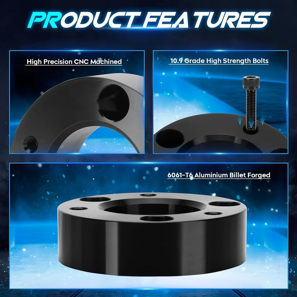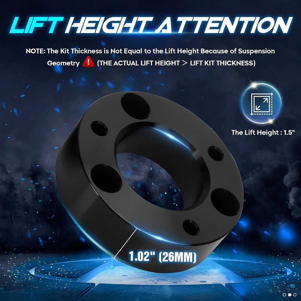 1.5" Front Leveling Lift Kit Compatible with 2003-2017 Ford Expedition, 2004-2023 F150, Raised by 1.5 Inch Front Suspension Strut Spacers for 2006-2008 Lincoln Mark LT, Set of 2 We offer 1-5 Days Free shipping & 30-Days Free returns Vehicle Compatibility: Compatible with 2003-2017 Ford Expedition; 2004-2023 Ford F-150; 2006-2008 Lincoln Mark LT. Lift 1.5 Inch: Please note that the Front Leveling Lift Kit's thickness is less than 1.5 inch because of suspension geometry. The ratio between lift height and kit thickness is not 1:1, but it will lift the truck to a true height of 1.5 inch. An alignment is always recommended after installing. Various Benefits: The Leveling Lift Kit will give a noticeably aggressive look to your vehicle, increases additional fender clearance and provides more tires alternative, allowing larger tires and wheels. Premium Material: ILONPA's Suspension Leveling Kit is forged from 6061-T6 aluminum alloy, CNC automatic processing, surface anodic oxidation and heat treatment, which not only ensures high precision and stability, but also enhances the hardness and corrosion resistance of the material. Easy Installation: No cutting or drilling needed, and you could complete installation with 1-2 hours. Note that you have to make sure to get an alignment when you are done. We offer 1-5 Days Free shipping & 30-Days Free returns