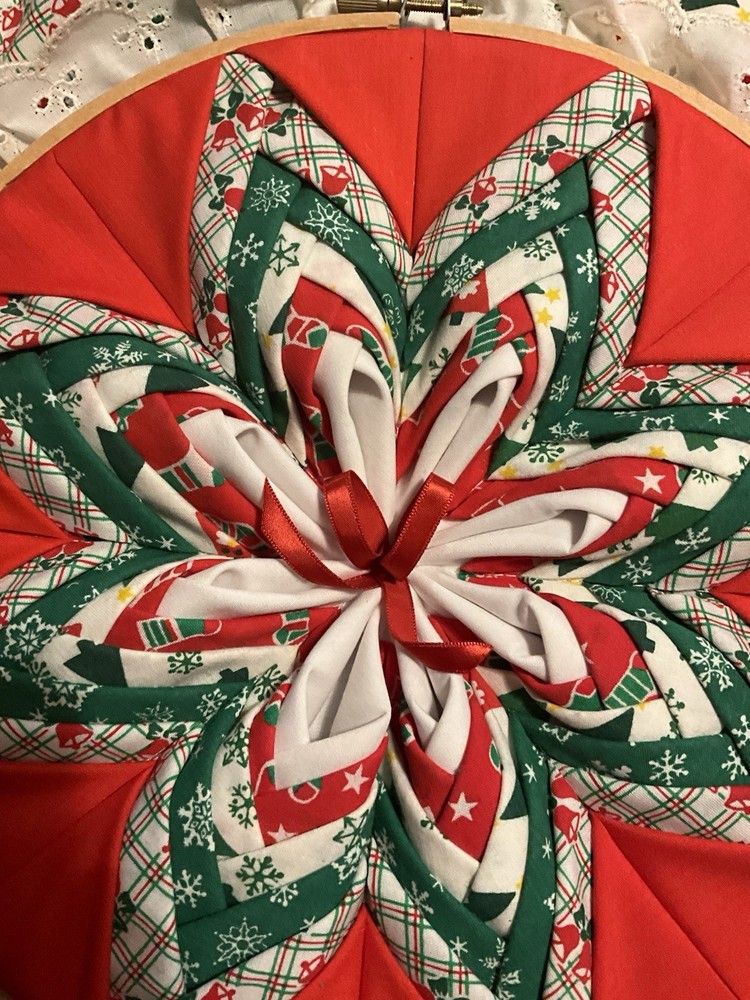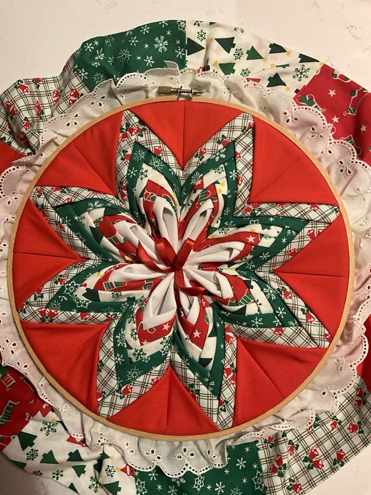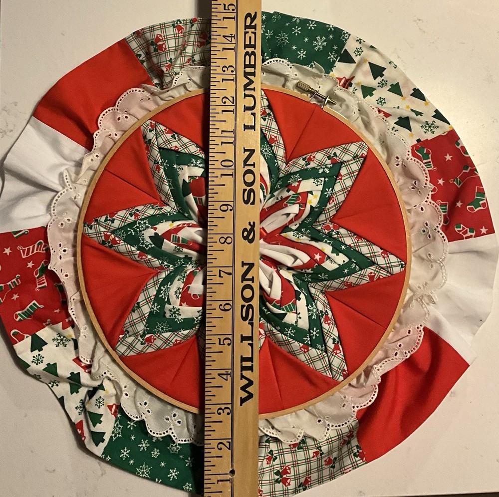 This 15 inch handmade Christmas quilted snowflake wall hanging embroidery hoop art is a charming and festive addition to your holiday decor. This unique wall hanging is perfect for adding a touch of handmade warmth to your home during the Christmas season. The intricate quilted fabric star or snowflake design in classic Christmas colors and embroidered details make it a beautiful and eye-catching piece that is sure to bring joy to your space.