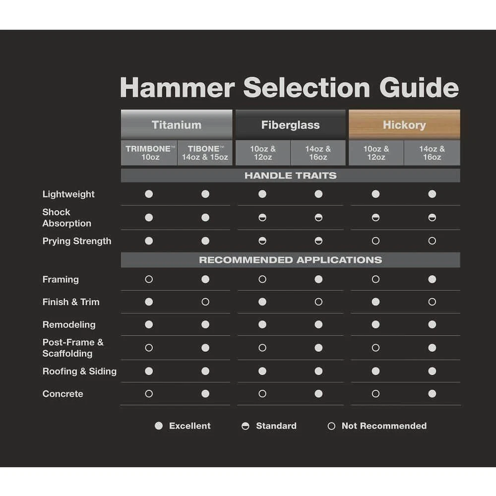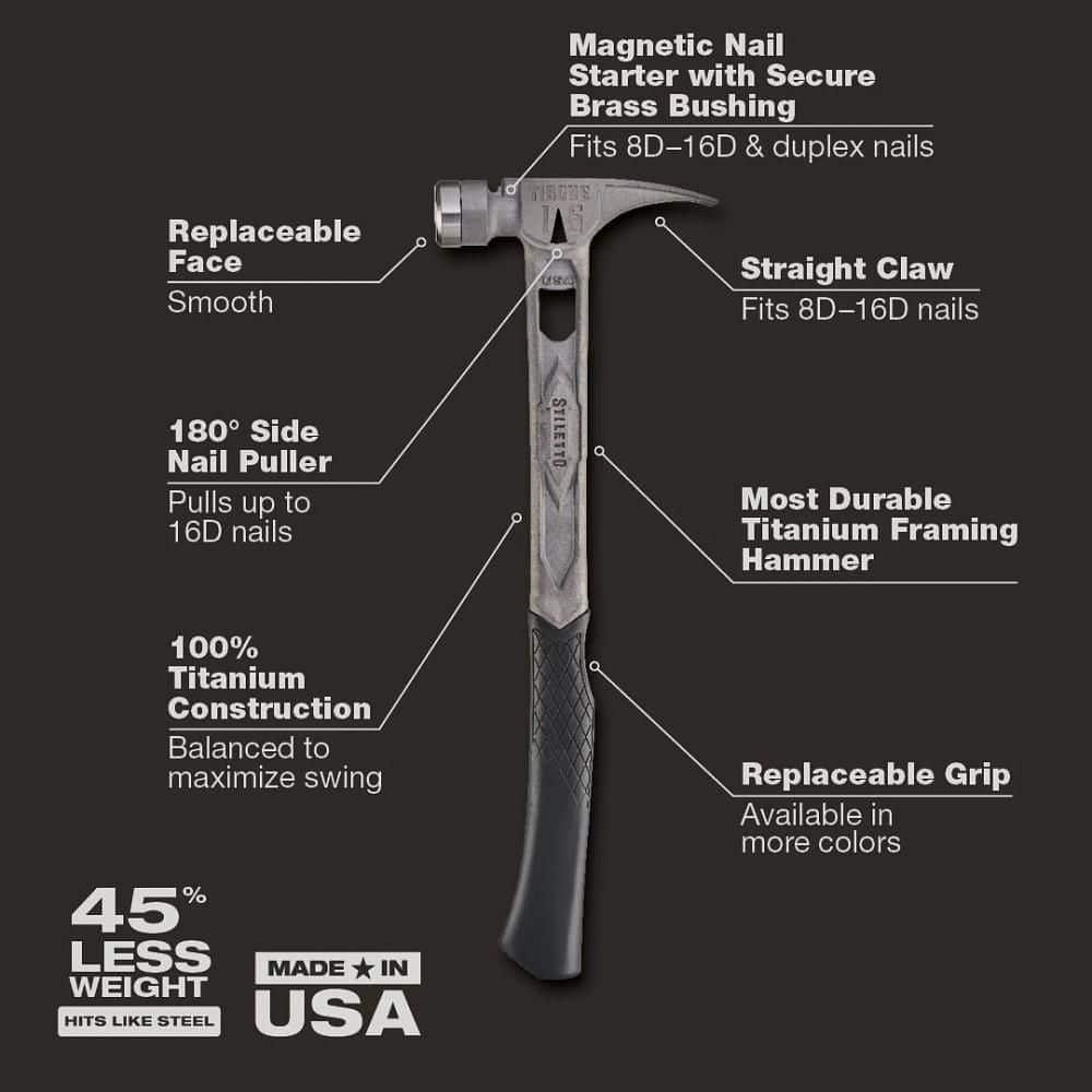 15 Oz. TiBone Smooth Face With Curved Handle Store New Arrivals Add to Saved Sellers View Feedback Contact 15 Oz. TiBone Smooth Face With Curved Handle This 14oz titanium hammer is 45% less weight and hits like steel Most powerful and most durable titanium framing hammer Replaceable steel face and multiple grip colors The STILETTO 15oz TIBONE Hammer with Smooth Steel Face and Curved Handle is Stiletto Tool's most powerful and most durable hammer. This All-Titanium hammer is 45% less weight and hits like steel. The durable TIBONE design is best for framing and pulling nails. The 180° side nail puller and Magnetic Nail Starter fit up to 16D or Duplex Nails. The TIBONE Titanium Framing Hammer features a replaceable steel face and multiple grip colors, extending the life of the hammer and providing a personal touch. Claw Type: Straight Color Family: Black Face Type: Smooth Features: Comfort Grip Hammer Type: Straight Claw Hand Tool Type: Hammer Handle Material: Comfort Grip Head Material: Titanium Head Replaceable Head: No Returnable: 90-Day Tools Product Type: Hand Tool Manufacturer Warranty: 1 Year Limited Assembled Depth (in.): 6.17 in Assembled Height (in.): 17.34 in Assembled Width (in.): 1.43 in Handle Length (in.): 18 in Weight of Head (oz.): 15 ABOUT US Customer service is our top priority! Please be sure to read the description thoroughly to make sure that this is the item you want before making a purchasing decision. If you have any questions about this item, please contact us via eBay messages before placing your order. We make every effort possible to accurately describe and depict the items. Please be aware that slight variations in color may be due to differences in lighting and computer monitor resolutions. All items are in stock at the time of listing; however, in the unlikely and unforeseen event that we are unable to fulfill your order through any of our networked warehouses, we will notify you as quickly as possible and offer you a 100% refund on your purchase. Thank you for shopping with us. We appreciate your business! SHIPPING We provide fast, free shipping. Most items are shipped within 3-5 business days of receiving cleared payment. We ship to the lower 48 contiguous United States only. We do not ship to P.O. Boxes or APOs. For select items, we ship internationally through eBays Global Shipping Program. We do ship most of our smaller items internationally using eBays Global Shipping Program. If ordering electrical items outside of the U.S., please note that they will come equipped with a standard U.S. voltage plugs. You will need a suitable adapter to use the item in your country. Certain restrictions apply. Standard or Economy Shipping is ALWAYS FREE! You will be notified via eBay messages as soon as your items ship. Special Notice for Freight Items: If an item ships via Freight (Truck) Delivery, a valid phone number will be required so that we can contact you to schedule delivery. The item may be delivered with curbside delivery. An adult signature will be required. Please be sure to have available help on hand to assist you with moving the item to the desired location in or outside of your home. Freight items must be inspected upon delivery. In the unlikely event that damage is observed, you MUST refuse delivery and note the damage on the shipping receipt and send it back via the Freight carrier. Returns will not be accepted on Freight items after they have been delivered, inspected, and the driver has left the premises. RETURNS When returning an item, it must be in all of the original packaging and include all of the original accessories or items that came with it. The item and package should be in original and perfect condition. You will be required to cover shipping on the return of non-defective items. All returns MUST be done within 30 days of date of purchase. Please note that we cannot give refunds or replacements after the 30 day limit has expired. When sending in a return, please note that it can take up to 7 business days for the return to be processed. We do our best to process as quickly as possible. We are extremely fair, and in the rare event of something out of the ordinary happening with our products or shipping, we will gladly work with you to find a fair resolution. PAYMENT We accept all of the standard payment options offered at eBay checkout. To provide a safe experience, eBay only allow payment methods that offer strong protection for buyers and sellers. Your order will be processed pending receipt of cleared payment. Sales tax may be charged depending on your location. DISCLAIMER We are sorry, but we do not honor product exchange requests. If you need to exchange an item received, you will need to go through the normal returns process identified in our returns section and then order the correct item, if it is still available. Orders are processed immediately and dispatched to fulfillment as soon as they are received. For this reason, we are typically unable to honor cancellation requests. If you need to cancel the transaction, please contact us as soon as possible and we will attempt to cancel the order. If the order has gone too far through the fulfillment process, we will be unable to cancel. In that event, you would need to wait until you receive the item and go through the normal returns process as mentioned in the returns section of our policies. Please note that electronic items are only rated for use inside the United States. If you order an electronic item for use outside the USA, that is at your own risk. If the product gets damaged or does not work, you will be liable and we will not accept a return of the item CUSTOMER SATISFACTION We try our very best to make sure every customer is completely satisfied. If there's a problem, message us! We're happy to help. © ha_358466. | All Rights Reserved